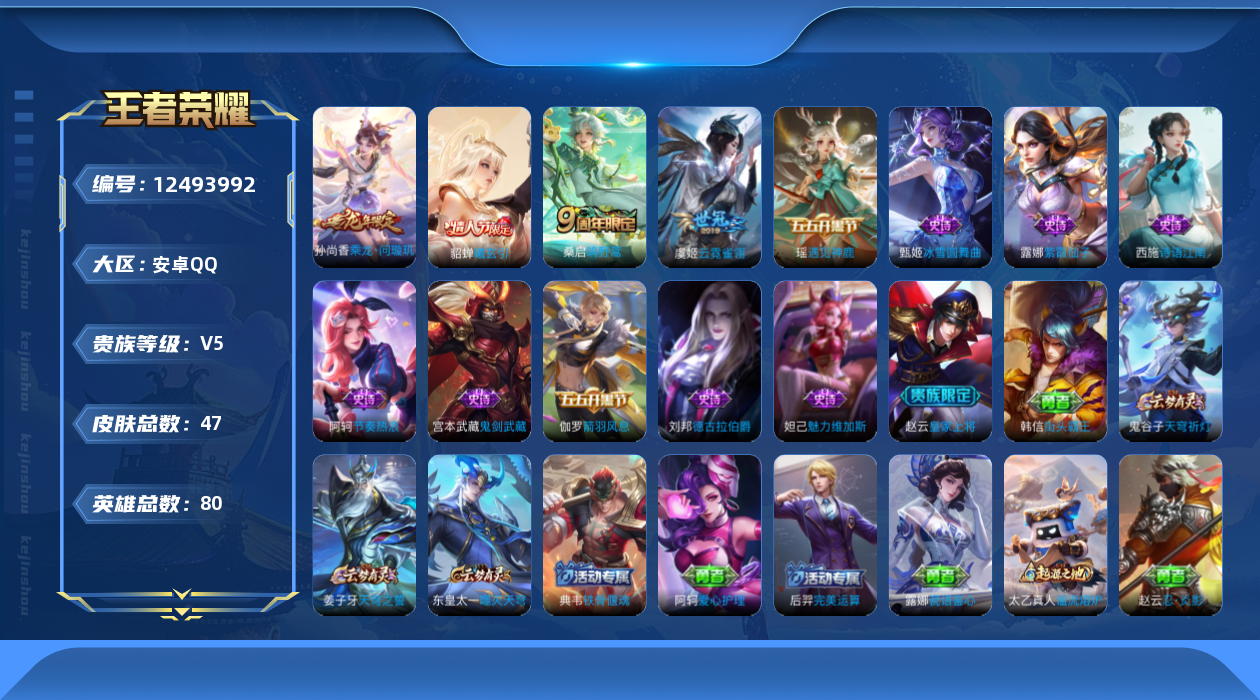 [12493992]: 可修改 贵族等级: V5 英雄数: 80 皮肤数: 47 传说皮: 云霓雀翎,乘龙·问璇玑,貂蝉曦玄引 限定皮: 鸣野蒿