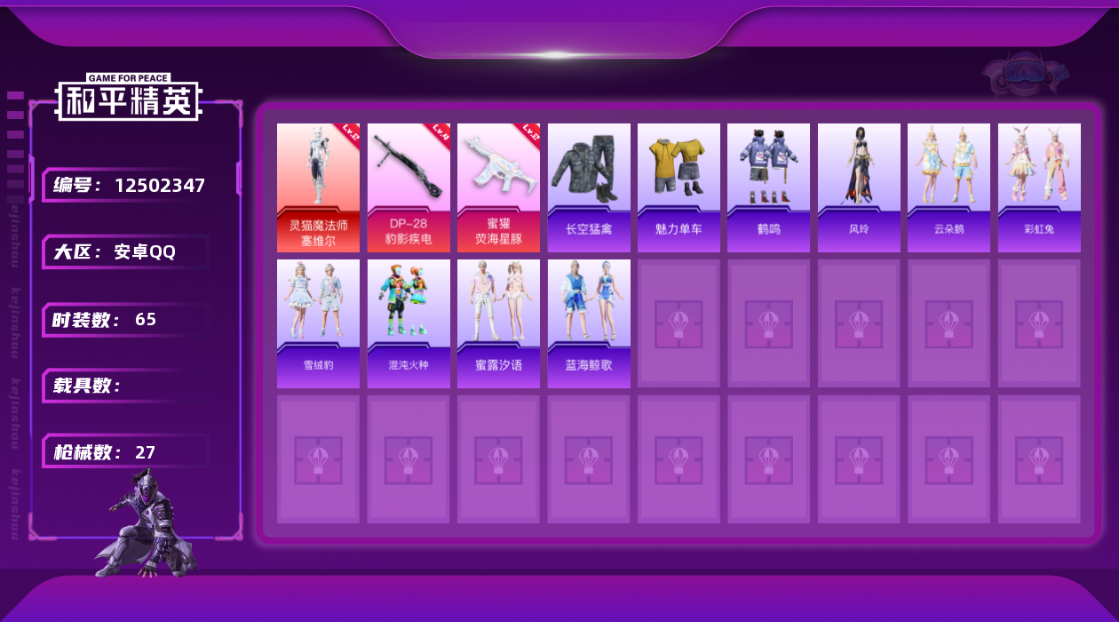 【10922832】[12502347]1红装 2特效枪 1印记 可二次 可修改实名 优质装备:灵猫魔法师-塞维尔,二级灵猫魔法师-塞维尔,蜜獾-荧海星豚 稀有枪皮:DP-28-豹影疾电 四级特效枪:四级DP-28-豹影疾电 二级特效枪:二级蜜獾-荧海星豚 紫色装扮:云朵鹅,彩虹兔,雪绒豹,混沌火种,长空猛禽,蓝海鲸歌,蜜露汐语,魅力单车,鹤鸣,风玲 优质战备:炙焰牛王降落伞,灵猫魔法师降落伞