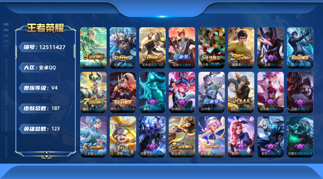 [12511427]【商品标题】:安卓Q-V4-至尊星耀III段位-123英雄-187皮肤-0典藏-0珍品无双-0无双-0珍品传说-3传说-36史诗 【传说皮肤】:桑启鸣野蒿,吕布怒海麟威,花木兰冠军飞将 【限定皮肤】:姜子牙天穹之誓,狄仁杰阴阳师,孙尚香蔷薇恋人,庄周高山流水,钟无艳超时空战士,元歌云间偶戏,元歌无心,夏侯惇朔风刀,...
