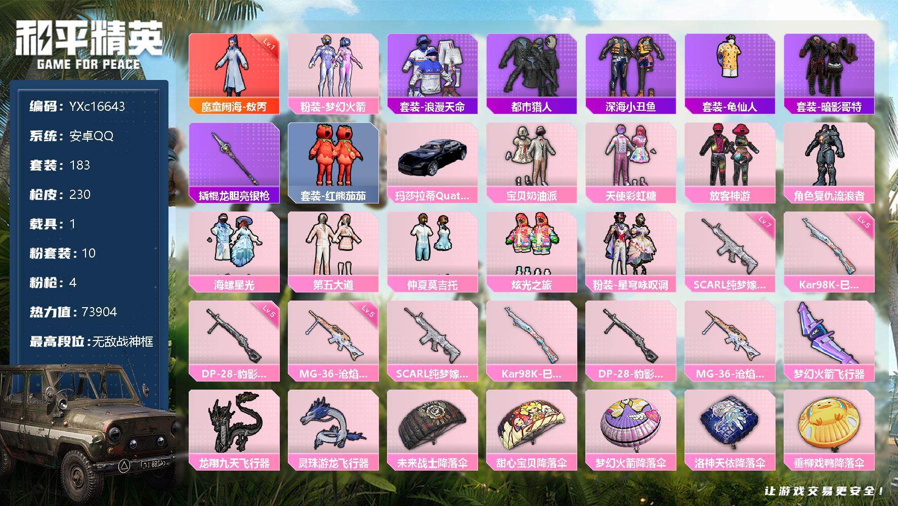 【10929253】【不可二次】【安卓QQ】龟仙人 垂柳戏鸭降落伞 梦幻火箭降落伞 漫步者 都市猎人 洛神天依降落伞 飞狐塔尔斯 狂沙舞者 极速红龙 暗夜鎏金降落伞 M762-奇异狩猎者 放客神游 第五大道降落伞 梦幻火箭 天使彩虹糖 甜心宝贝降落伞 深海小丑鱼 SCAR-L-纯梦嫁纱 宝贝奶油派 浪漫天命 梦幻火箭飞行器 暗影哥特 未来战士降落伞