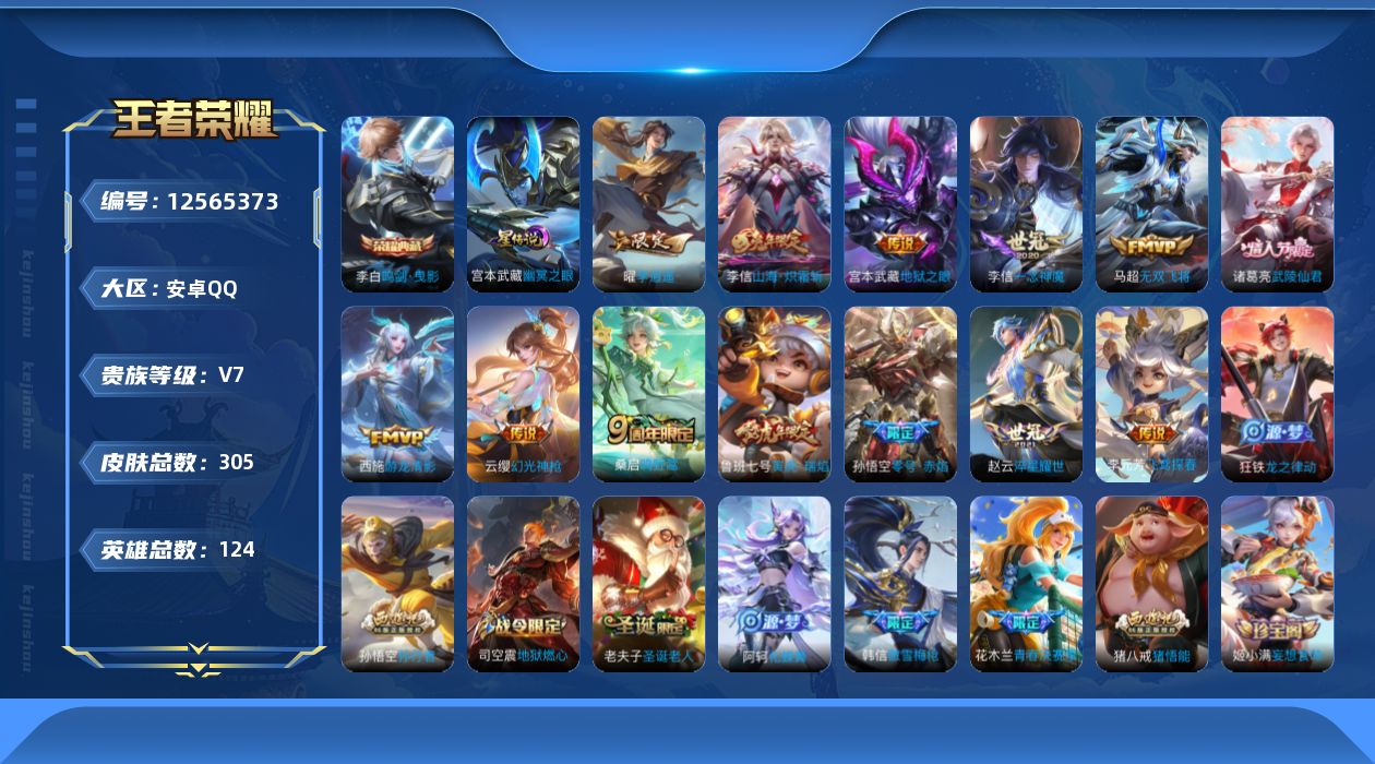 [12565373]: 可修改 贵族等级: V7 英雄数: 124 皮肤数: 305 荣耀水晶: 鸣剑·曳影 星传说: 幽冥之眼 传说皮: 一念神魔,零号·赤焰,地狱之眼,飞鸢探春,李逍遥,游龙清影,淬星耀世,无双飞将,山海·炽霜斩,幻光神枪 限定皮: 梁祝,御风骁将,天狼溯光者,青春决赛季,寅虎·御盾,玄武志,一生所爱,武陵仙君,寅虎·瑞焰,霸王别姬-虞姬...