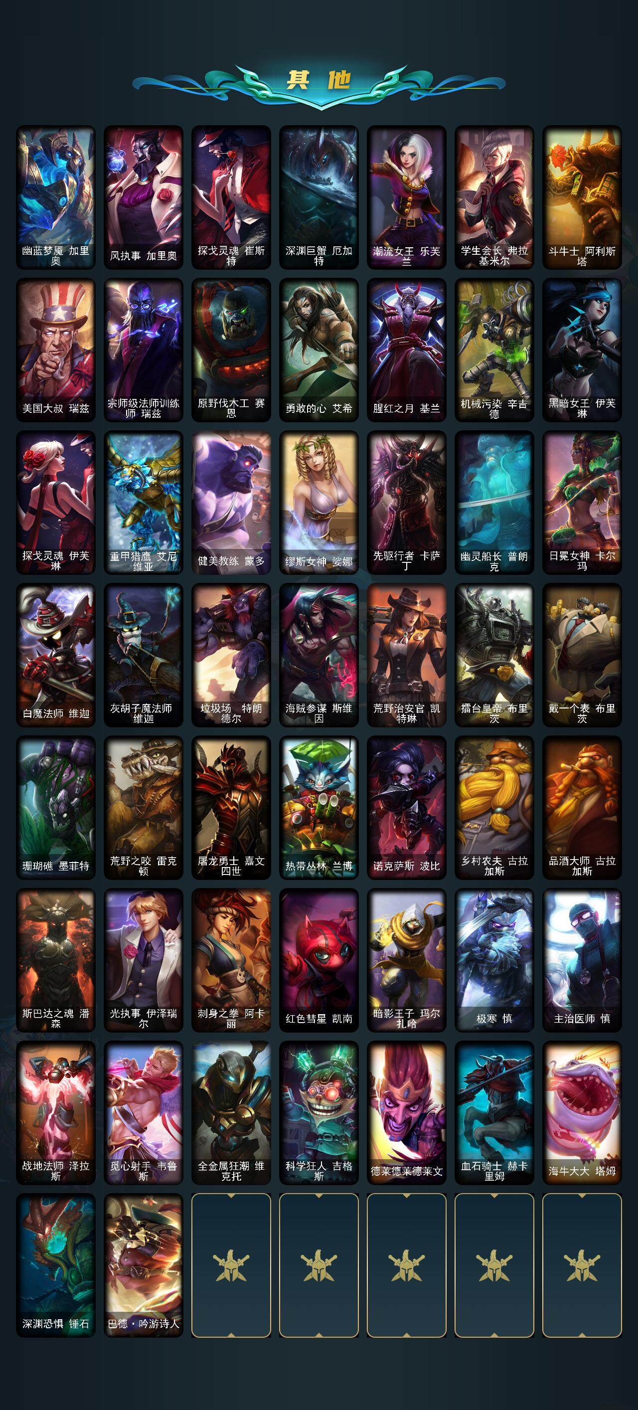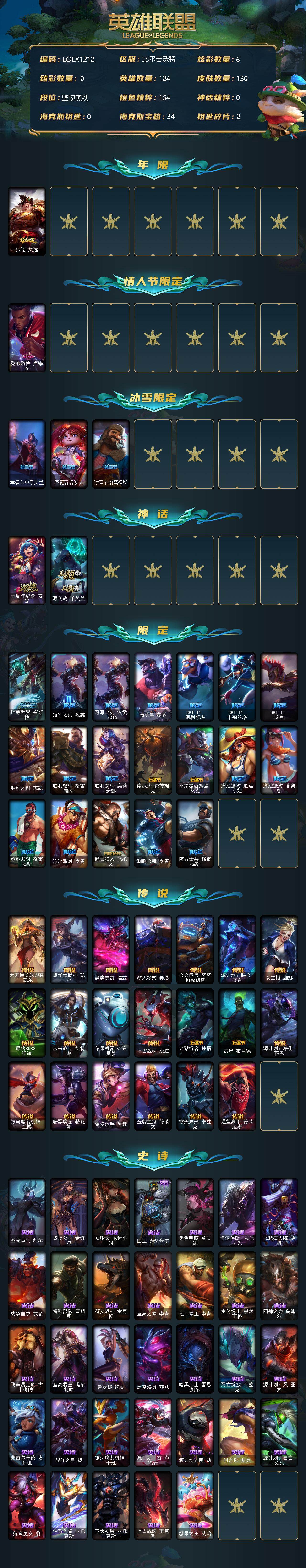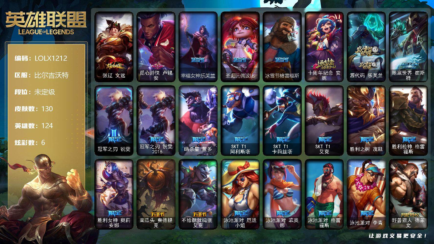 【10937838】【LOLX1212】124英雄/130皮肤/2神话/24限定/6炫彩/20传说/33史诗/未定级/张辽文远/觅心游侠卢锡安/幸福女神乐芙兰/圣诞玩偶波比/冰雪节格雷福斯/十周年纪念安妮/源代码乐芙兰/地底世界崔斯特/冠军之刃锐雯/冠军之刃锐雯2018/暗杀星蒙多/SKTT1阿利斯塔/SKTT1卡莉丝塔/SKTT1艾克/胜利之树茂凯/胜利枪神格雷福斯/胜利女神奥莉安娜/南瓜头费
