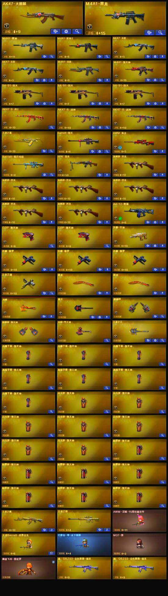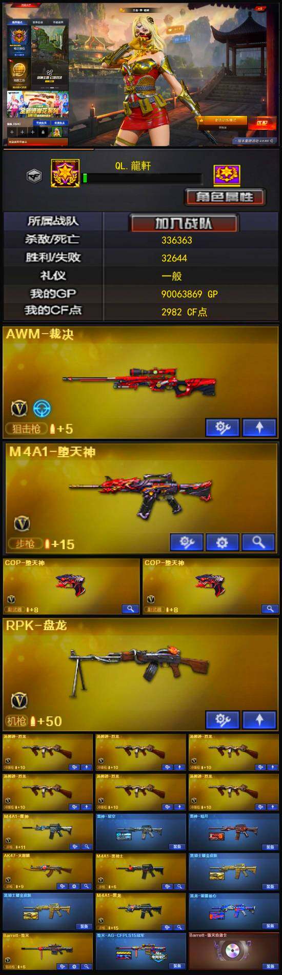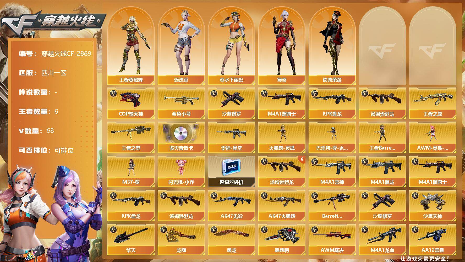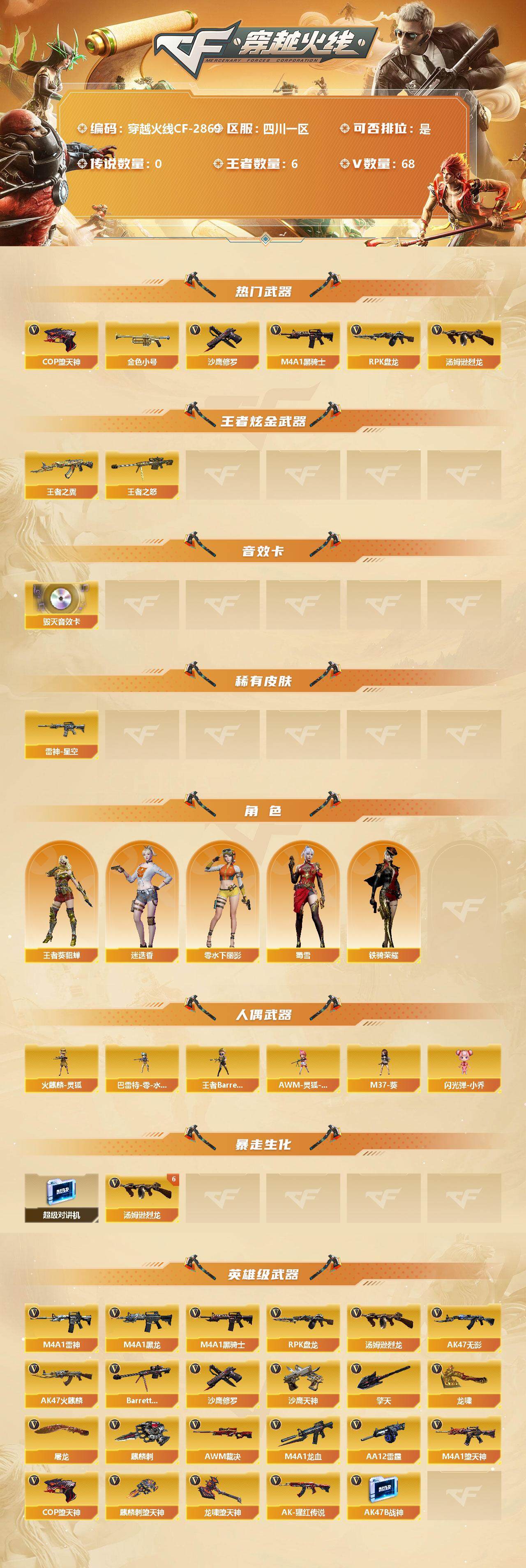 【10941802】【商品标题】:四川一区-68V-6王者-0炫金【热门武器】:金色小号,M4A1-黑骑士,汤姆逊-烈龙*6,RPK-盘龙,COP-堕天神*2,沙鹰-修罗*3【王者炫金武器】:王者之翼,王者之怒【音效卡】:Barrett-毁灭音效卡【稀有皮肤】:雷神-星空【角色】:王者-葵-貂蝉,零-水下丽影,迷迭香,蜀雪,铁骑荣耀【人偶武器】:火麒麟-灵狐,巴雷特-零-水下丽影,王者Barre