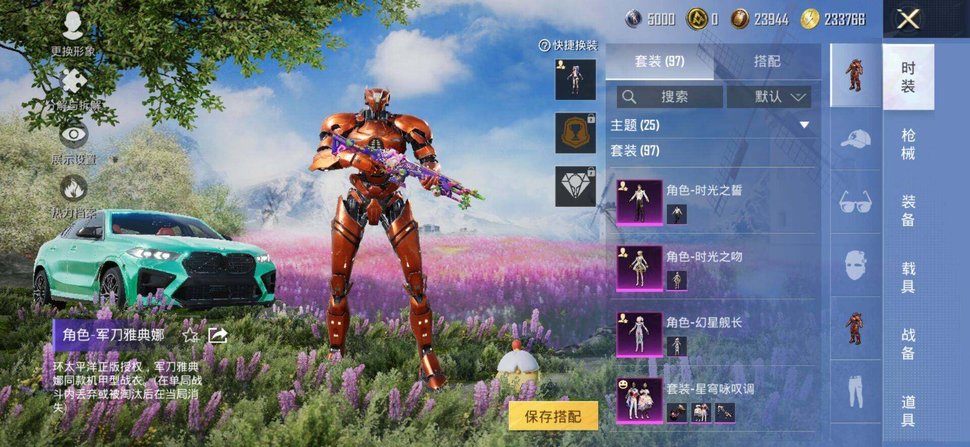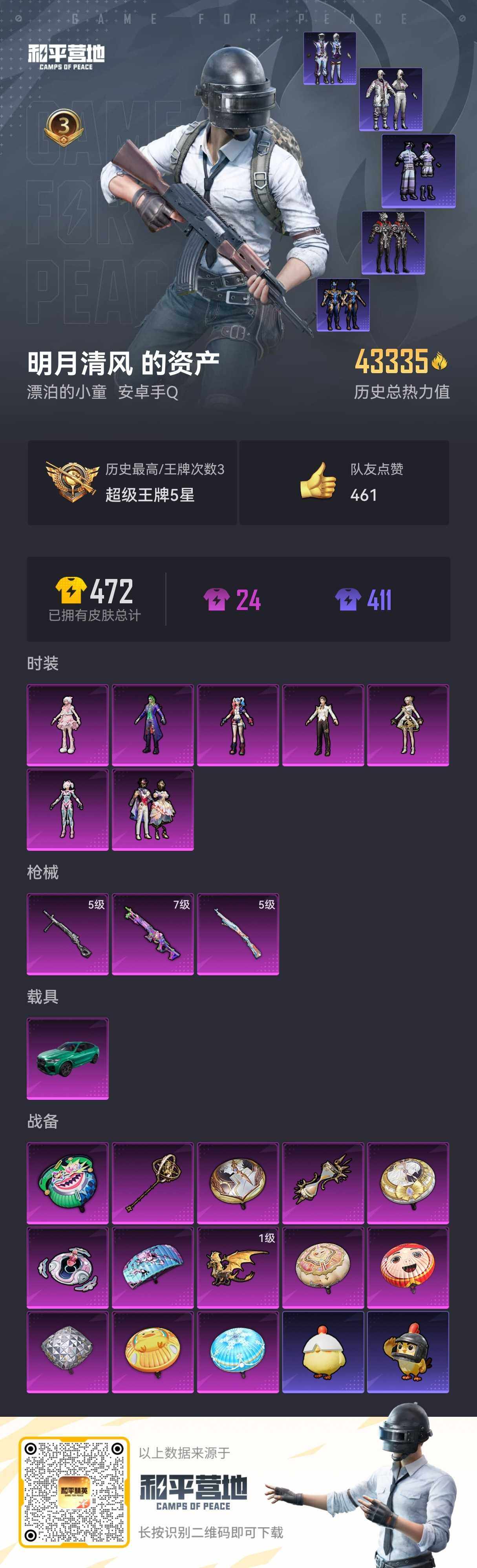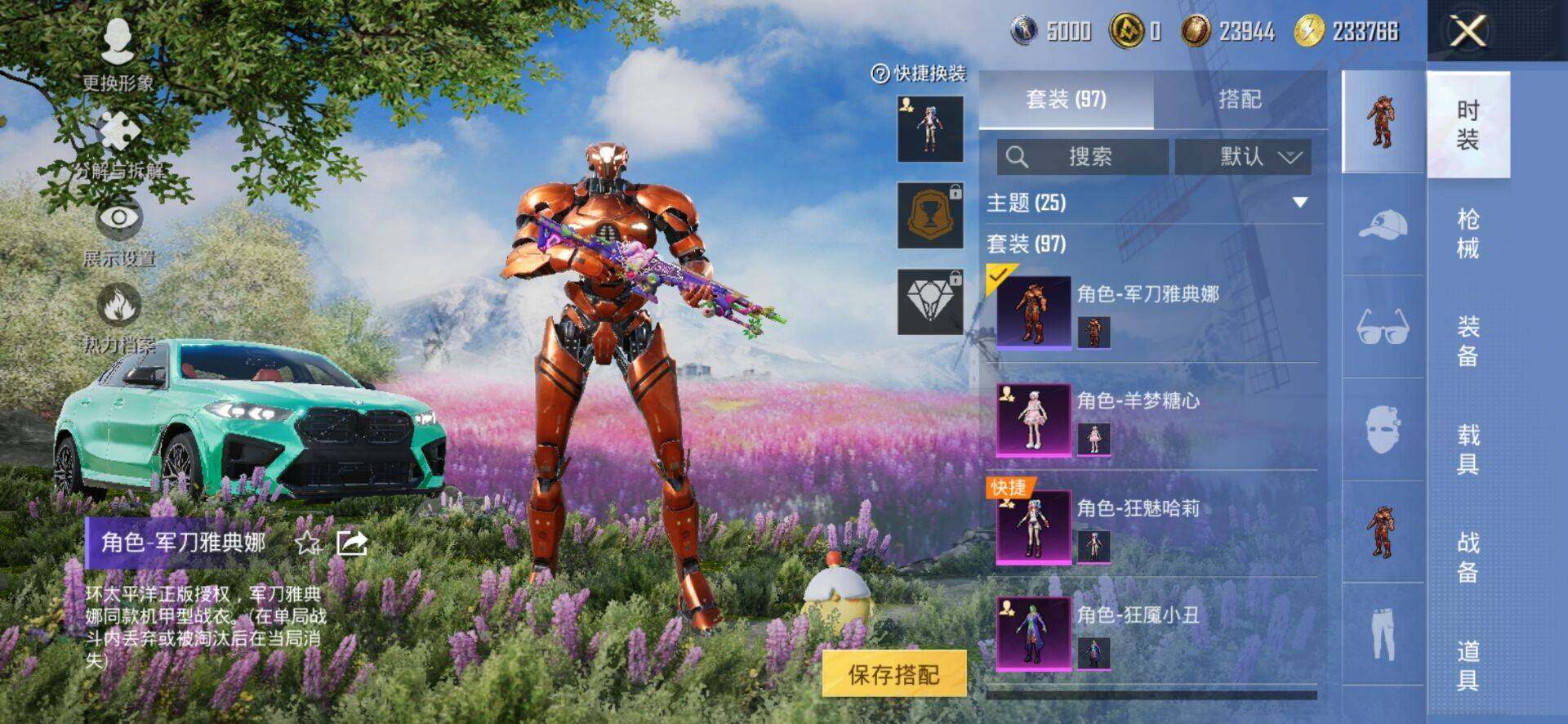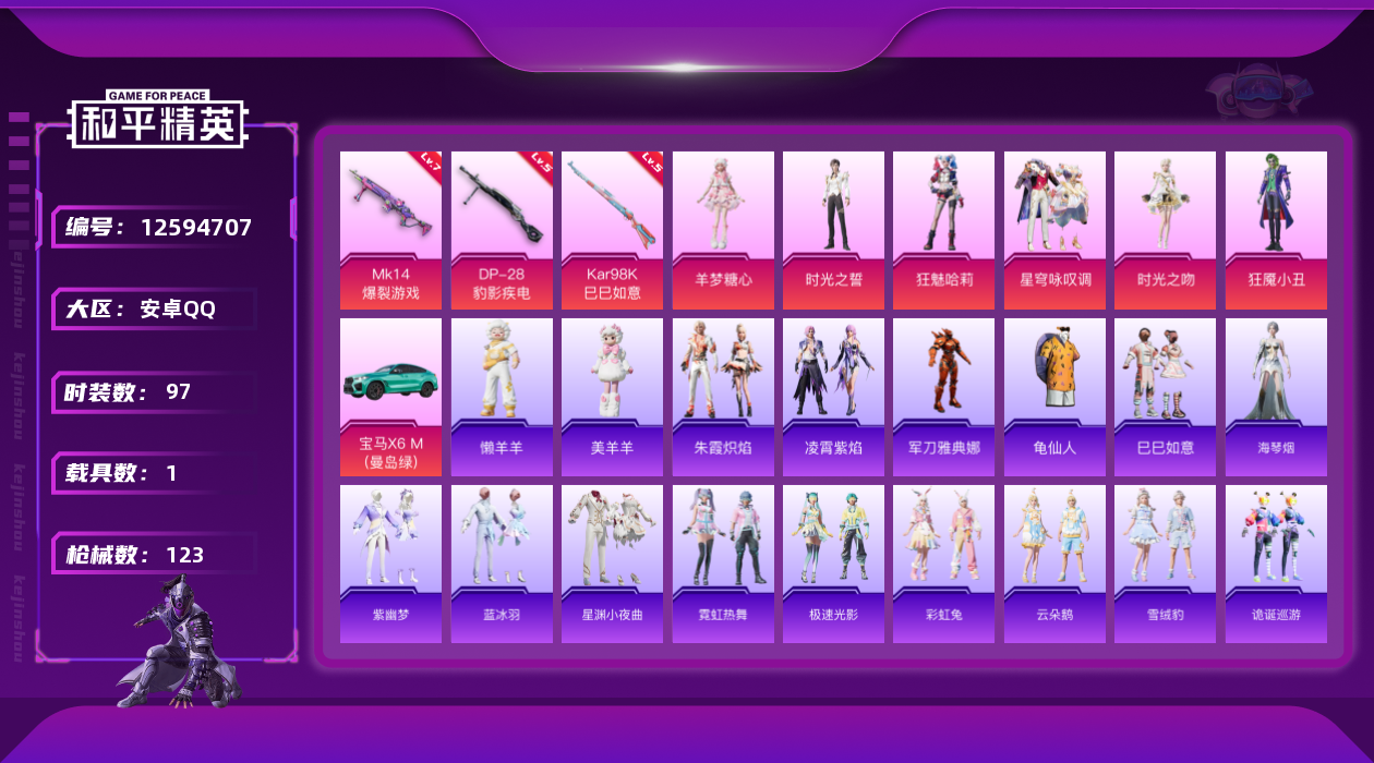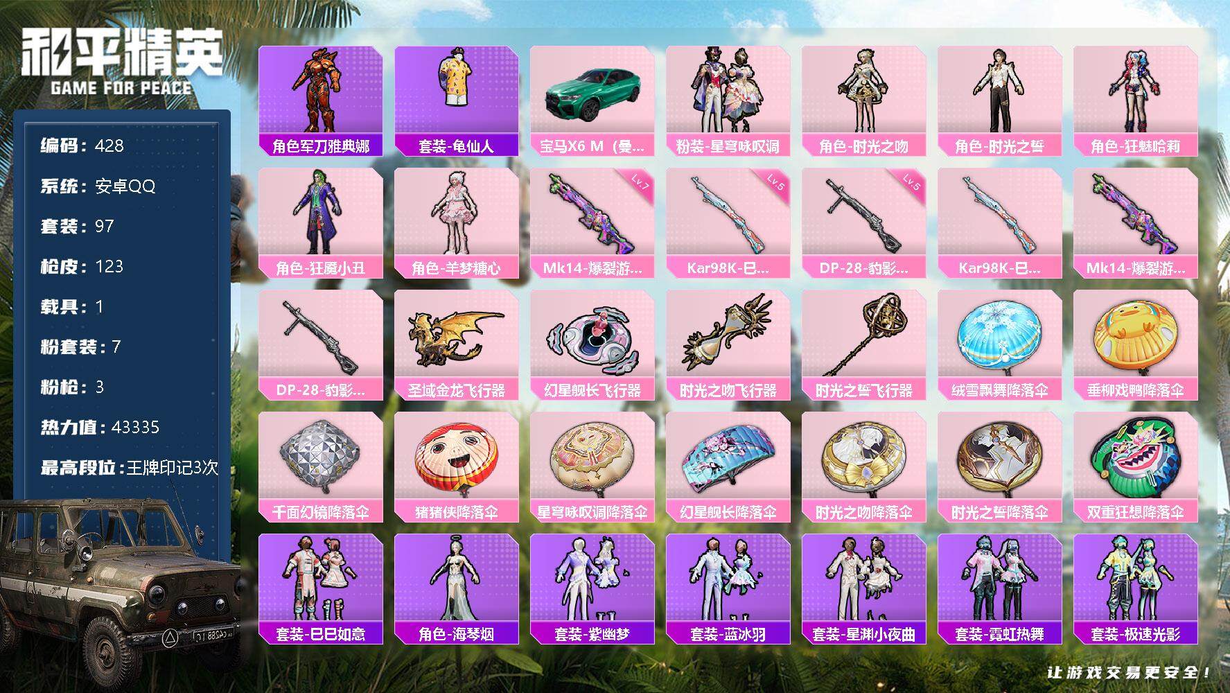 【10943703】[12594707]安卓 手Q-7粉装-3特效枪-1载具-4粉色飞行器-43335热力值-3王牌印记-97套装-123枪皮【热门品类】:角色-军刀雅典娜,套装-龟仙人【粉色载具】:宝马X6 M(曼岛绿)【粉色套装】:粉装-星穹咏叹调,角色-时光之吻,角色-时光之誓,角色-狂魅哈莉,角色-狂魇小丑,角色-羊梦糖心【粉色枪皮等级】:Kar98K-巳巳如意(五级),Mk14-爆裂游