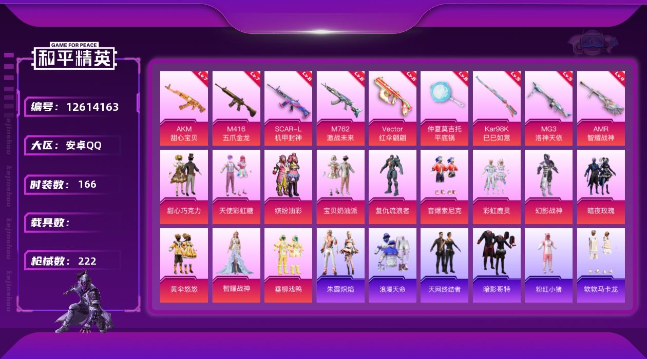 【10947077】【可二次】【安卓QQ】M416-五爪金龙 M762-激战未来 Vector-红伞翩翩 SCAR-机甲封神 MG3-洛神天依 甜心巧克力 彩虹鹿灵 暗夜玫瑰 天使彩虹糖 缤纷油彩 宝贝奶油派 幻影战神 黄伞悠悠 AKM-甜心宝贝