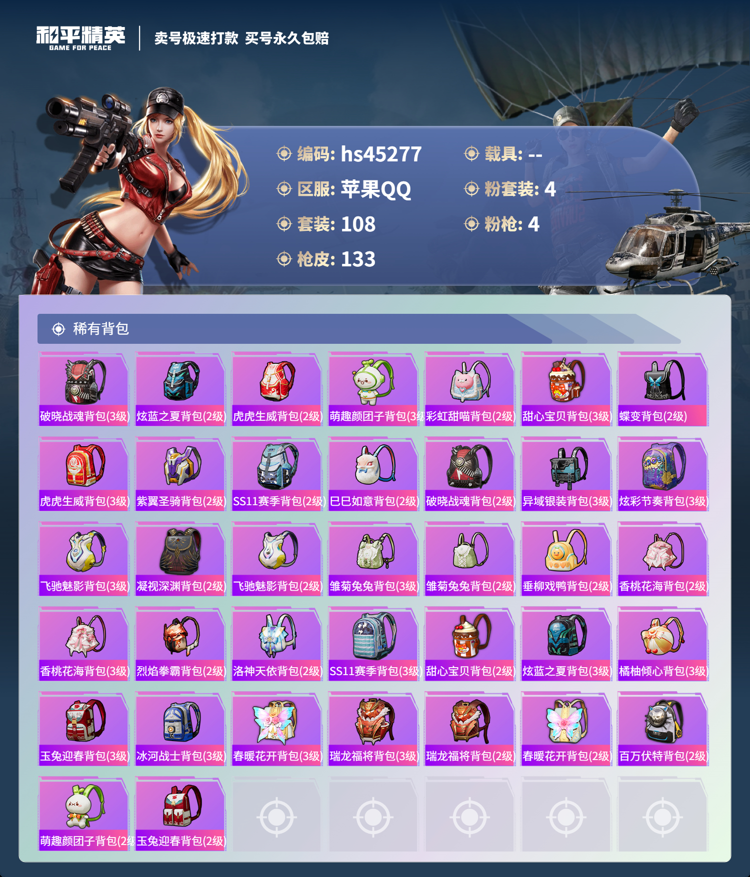 服务保障: 签约卖家 签约卖家安全可靠,90天内找回全额包赔。 快速交易 根据游戏种类不同,完成换绑后延时放款