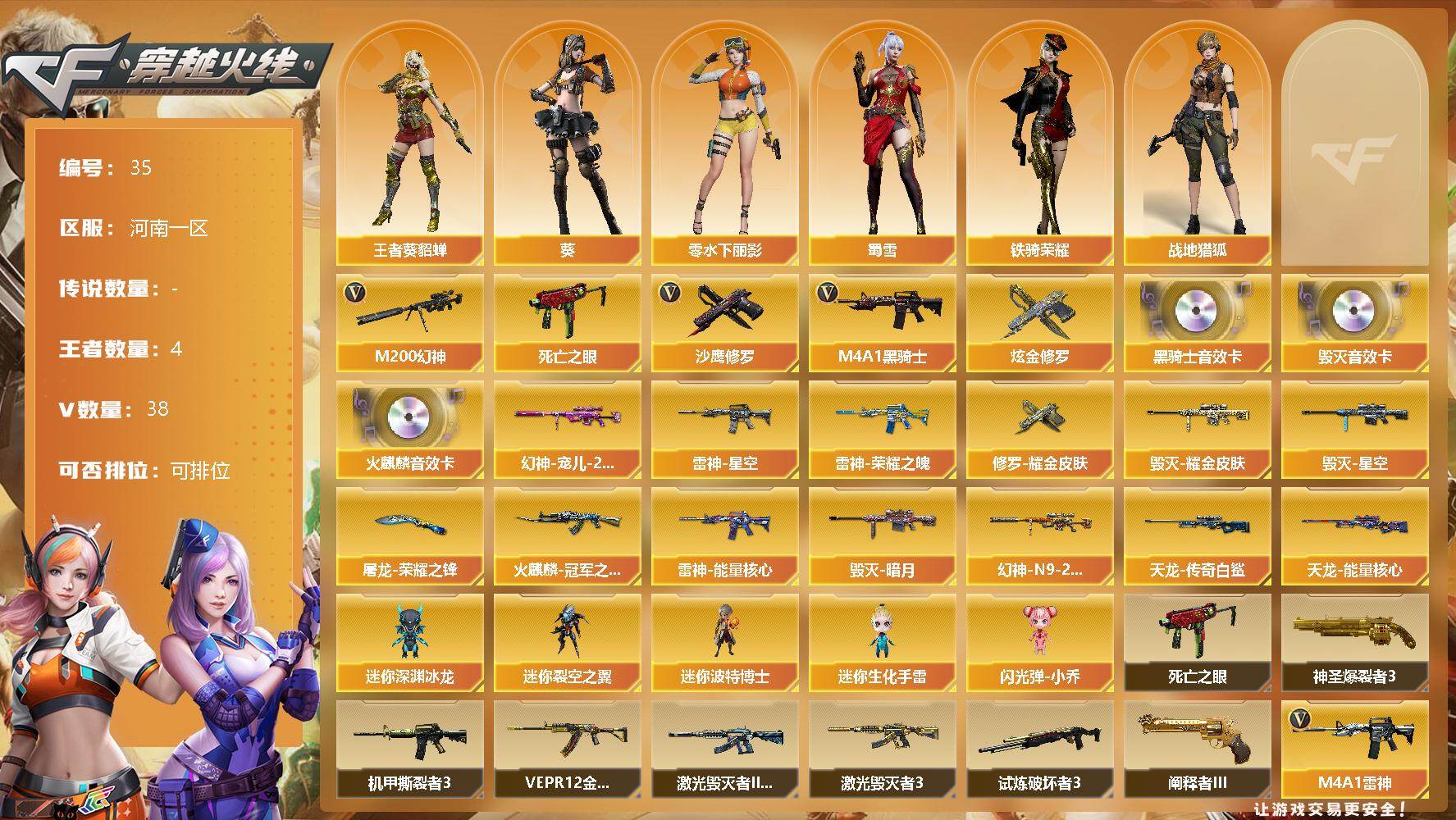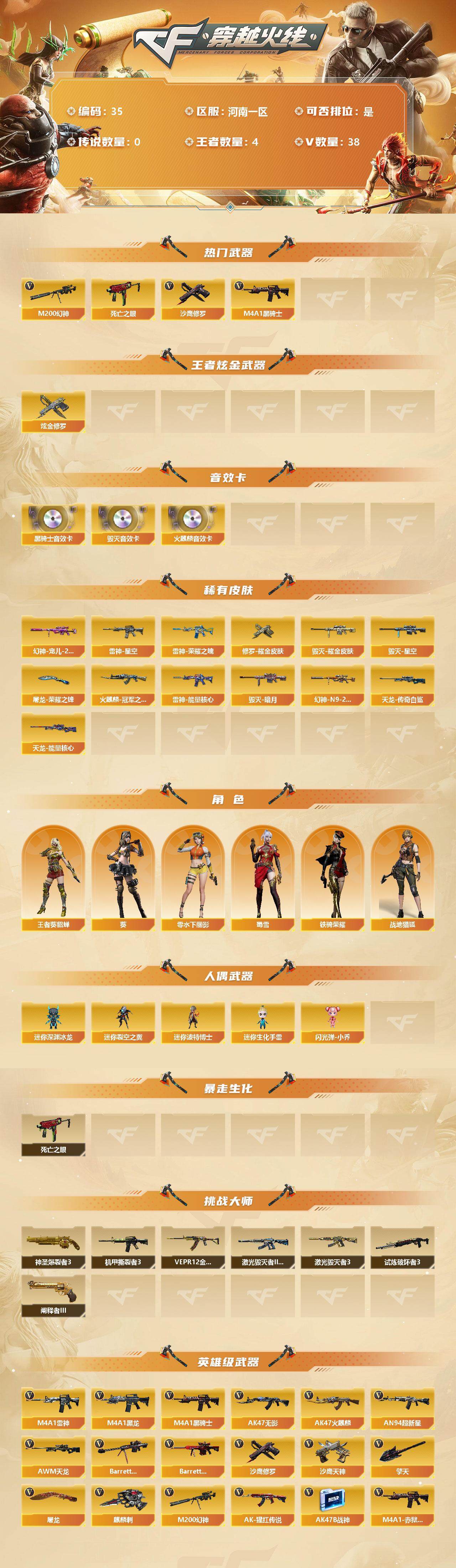 【10952808】【10952808】河南一区-38V-4王者-1炫金【热门武器】:M200-幻神,死亡之眼*2,M4A1-黑骑士,沙鹰-修罗*5【王者炫金