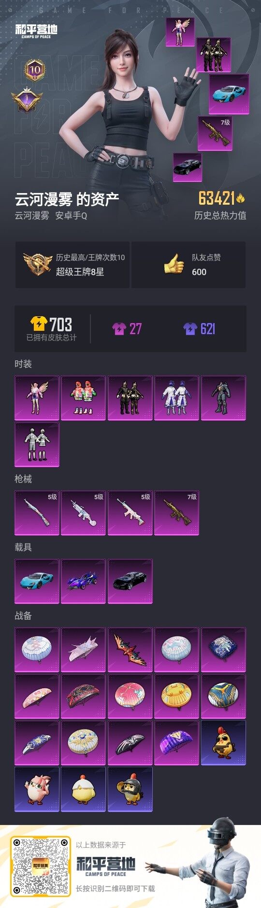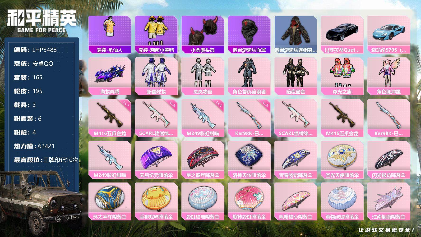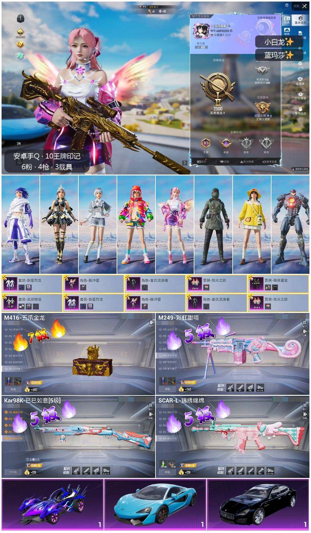 素材身法号 安卓 手Q-6粉装-4特效枪-3载具-1粉色飞行器-6.3w热力值-10王牌印记-165套装-195枪皮【热门品类】:套装-龟仙人,套装-潮萌小黄鸭,小恶魔头饰,熔岩游骑兵面罩,熔岩游骑兵连帽夹克【粉色载具】:玛莎拉蒂Quattroporte(夜幕蓝),迈凯伦570S(天际蓝),海龙奔腾【粉色套装】:粉装-新星烈龙,粉装-岚岚物语...