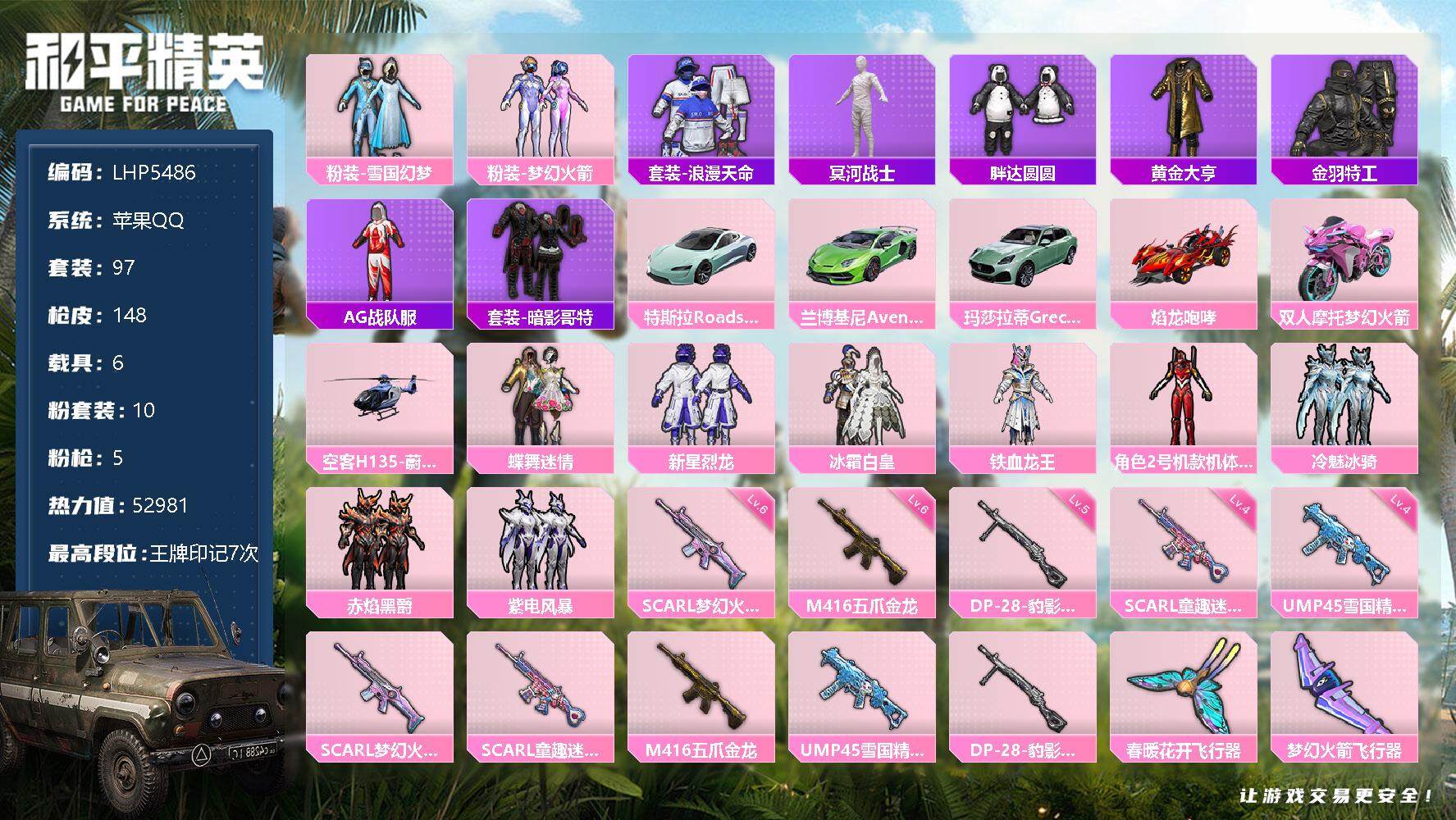 素材身法号/老木乃伊 苹果 手Q-10粉装-5特效枪-6载具-2粉色飞行器-5.2w热力值-7王牌印记-97套装-148枪皮【热门品类】:粉装-雪国幻梦,粉装-梦幻火箭,套装-浪漫天命,套装-冥河战士,套装-胖达圆圆,套装-黄金大亨,套装-金羽特工,套装-AG战队服,套装-暗影特【粉色载具】:特斯拉Roadster(水滴蓝),兰博基尼Avent...