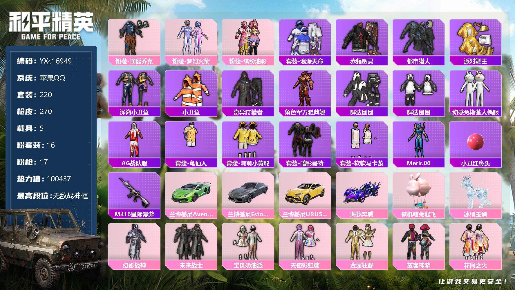 【10960754】【可二次】【苹果QQ】龟仙人 橘柚倾心降落伞 漫步者 M416-星际漫游 花间之火 都市猎人 海龙奔腾 金属狂野 UMP45-恐龙拽拽 M762-奇异狩猎者 M416-心之恋语 缤纷油彩 深海小丑鱼 碧影闪光 动感兔斯基人偶服 AKM-甜心宝贝 AKM-奇异狩猎者 兰博SVJ绿色 怪诞乔克 迅捷狂鲨 M762-瑞龙福将 蓝莓炮弹降落伞 潮萌小黄鸭 狂沙舞者 幻情紫藤 兰博SU