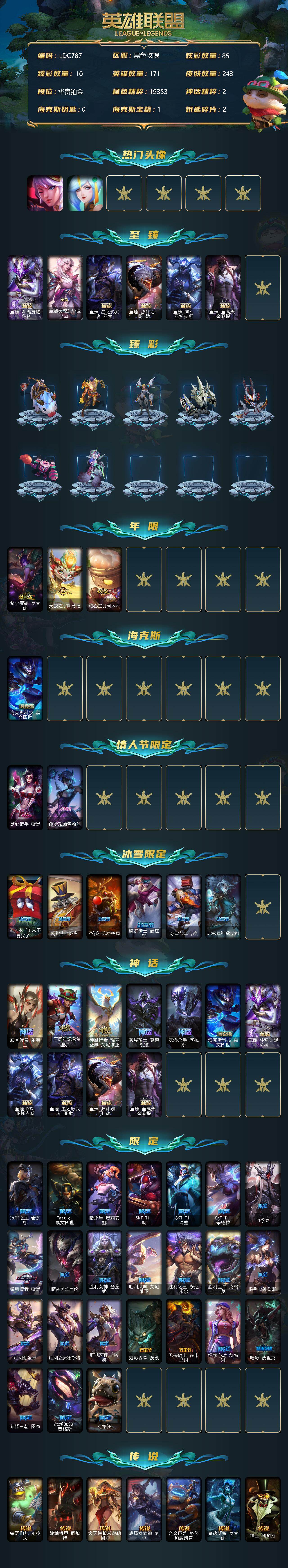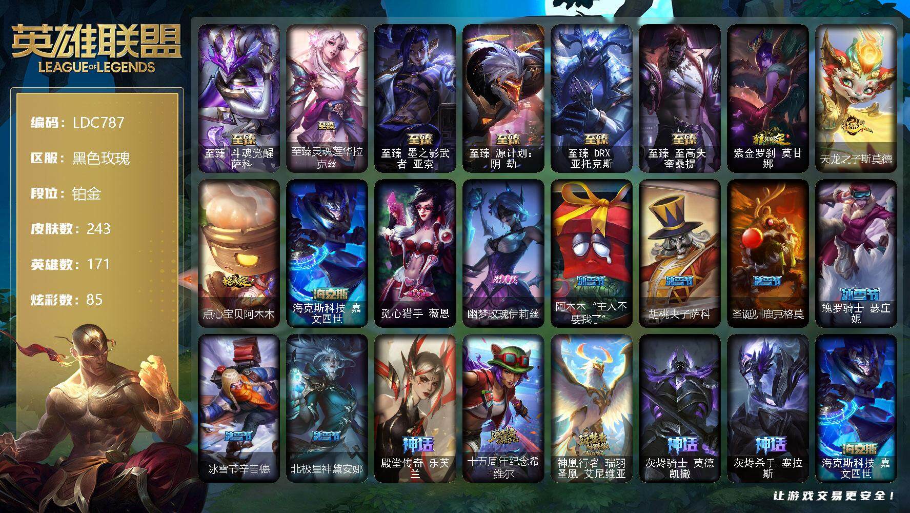 【10963908】【LDC787】171英雄/243皮肤/12神话/35限定/10臻彩/85炫彩/32传说/39史诗/铂金账号等级:524/觅心之翼奎因/春晖神女/至臻斗魂觉醒萨科/至臻灵魂莲华拉克丝/至臻墨之影武者亚索/至臻源计划:阴劫/至臻DRX亚托克斯/至臻至高天奎桑提/无畏骑士瑟庄妮赤子初心/冠军之刃锐雯2016凯旋圣装/神龙尊者圣龙李青龙腾云起/弹幕天使卡莎炽天使公正/霸天巨兽雪崩墨