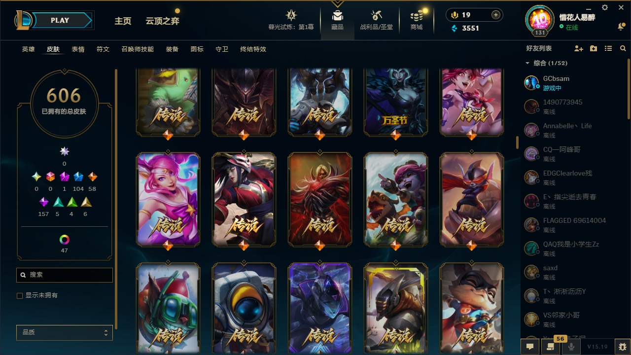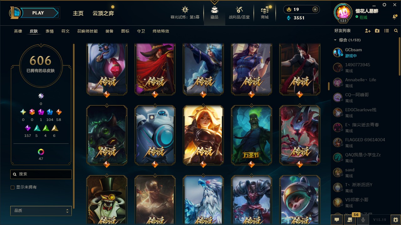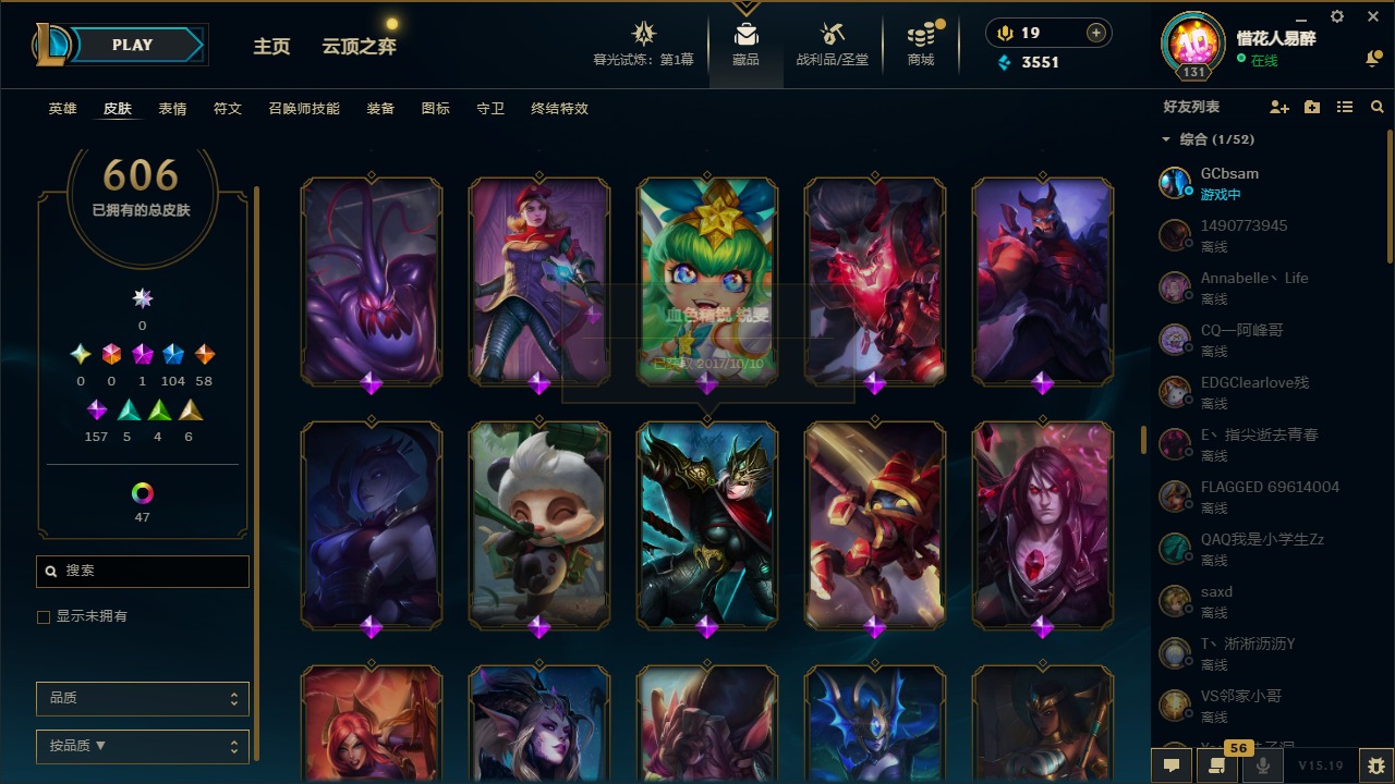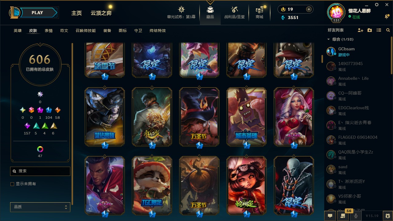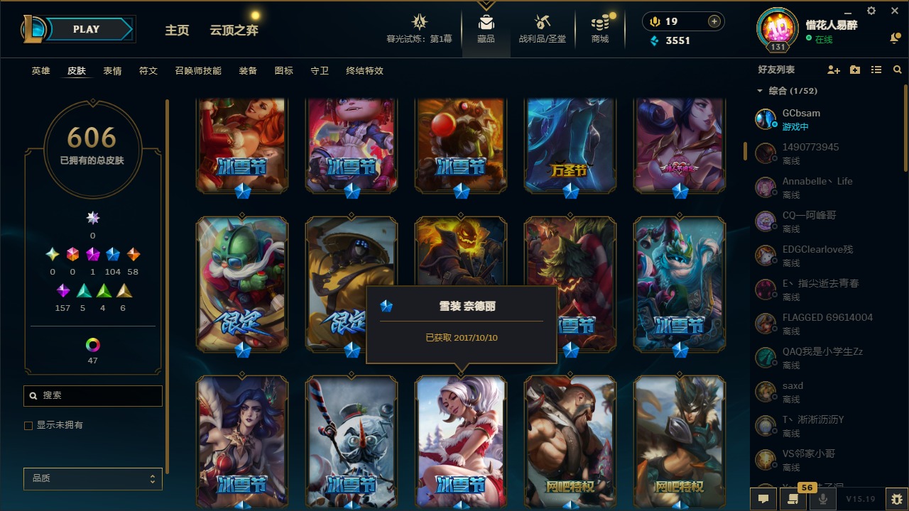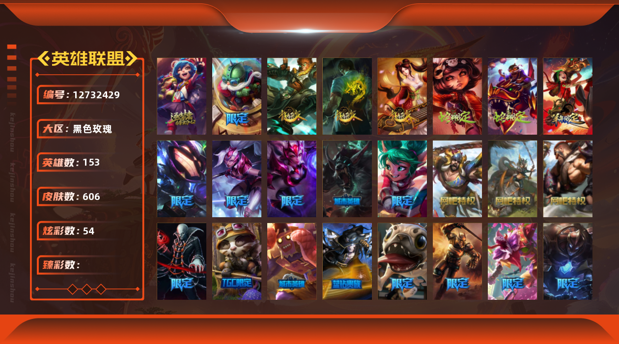 【10975014】[12732429]1神话 104限定 58传说 157史诗 606皮肤 54炫彩 153英雄 可二次 可修改实名 【限定】:哥特萝莉 安妮,生化领主 泰达米尔 【情人节限定】:觅心女王 艾希,觅心游侠 卢锡安,甜心之羽 霞 【冠军限定系列】:S1FNC 酒桶,S1FNC 迦娜,S1FNC 嘉文四世,S1FNC 卡尔萨斯,S1FNC 库奇,S2 暗杀星 蒙多,S2 暗杀星