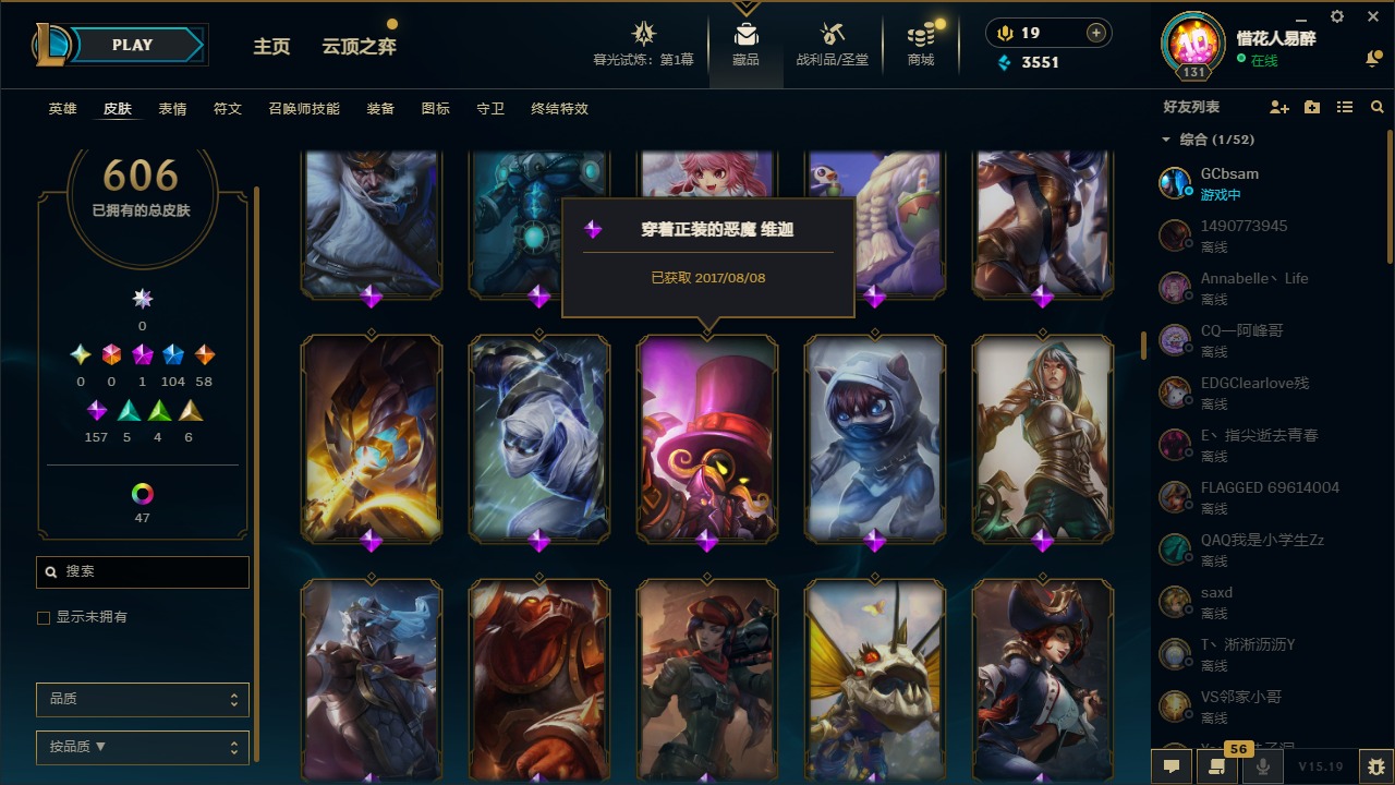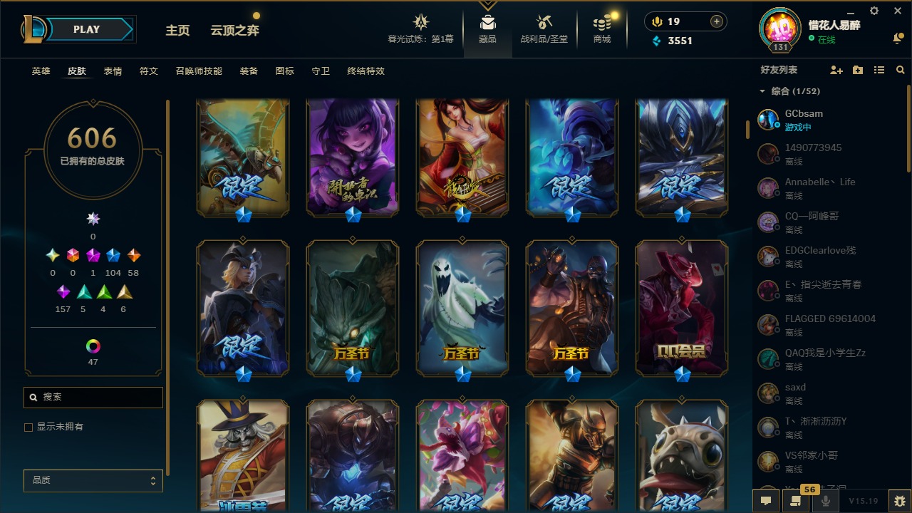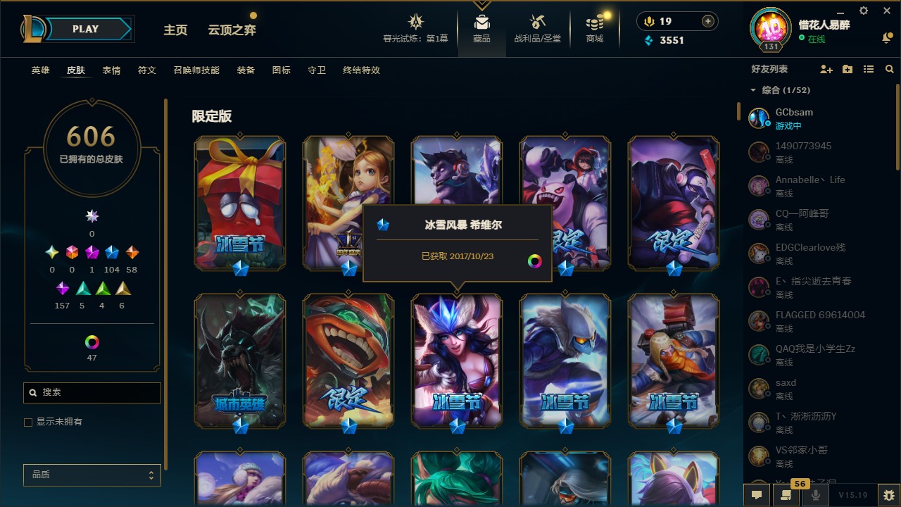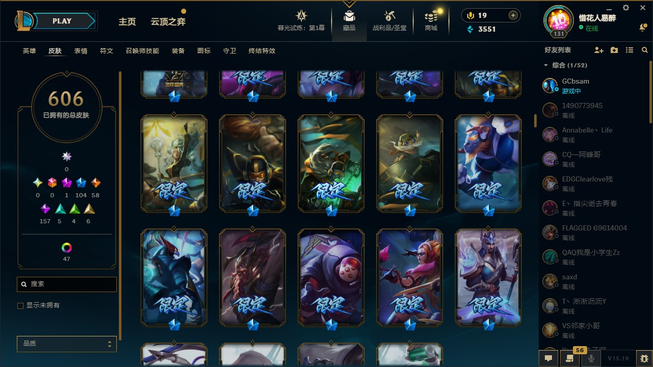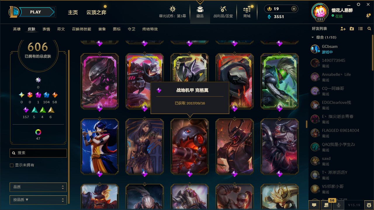 【10975014】[12732429]1神话 104限定 58传说 157史诗 606皮肤 54炫彩 153英雄 可二次 可修改实名 【限定】:哥特萝莉 安妮,生化领主 泰达米尔 【情人节限定】:觅心女王 艾希,觅心游侠 卢锡安,甜心之羽 霞 【冠军限定系列】:S1FNC 酒桶,S1FNC 迦娜,S1FNC 嘉文四世,S1FNC 卡尔萨斯,S1FNC 库奇,S2 暗杀星 蒙多,S2 暗杀星