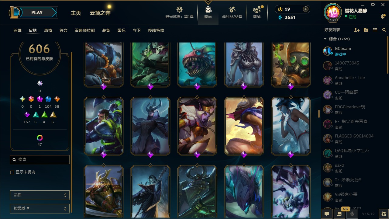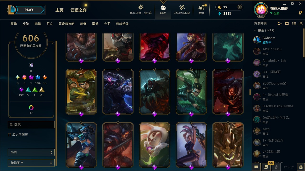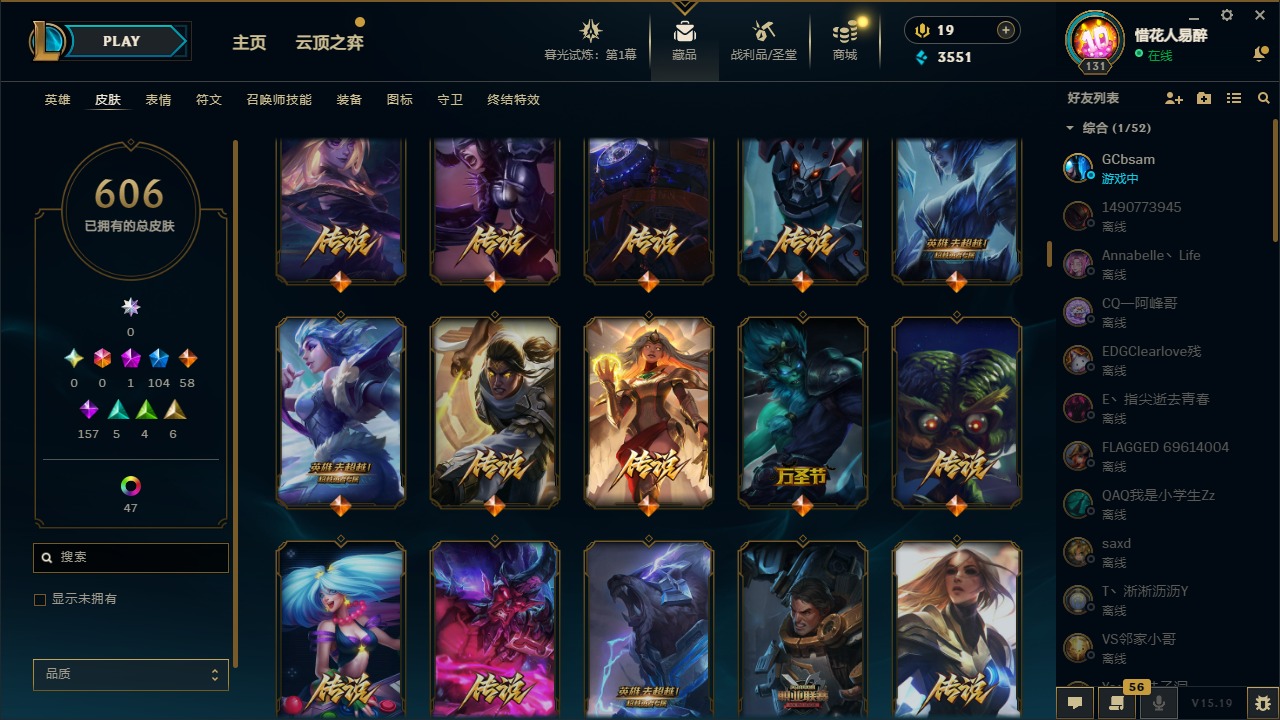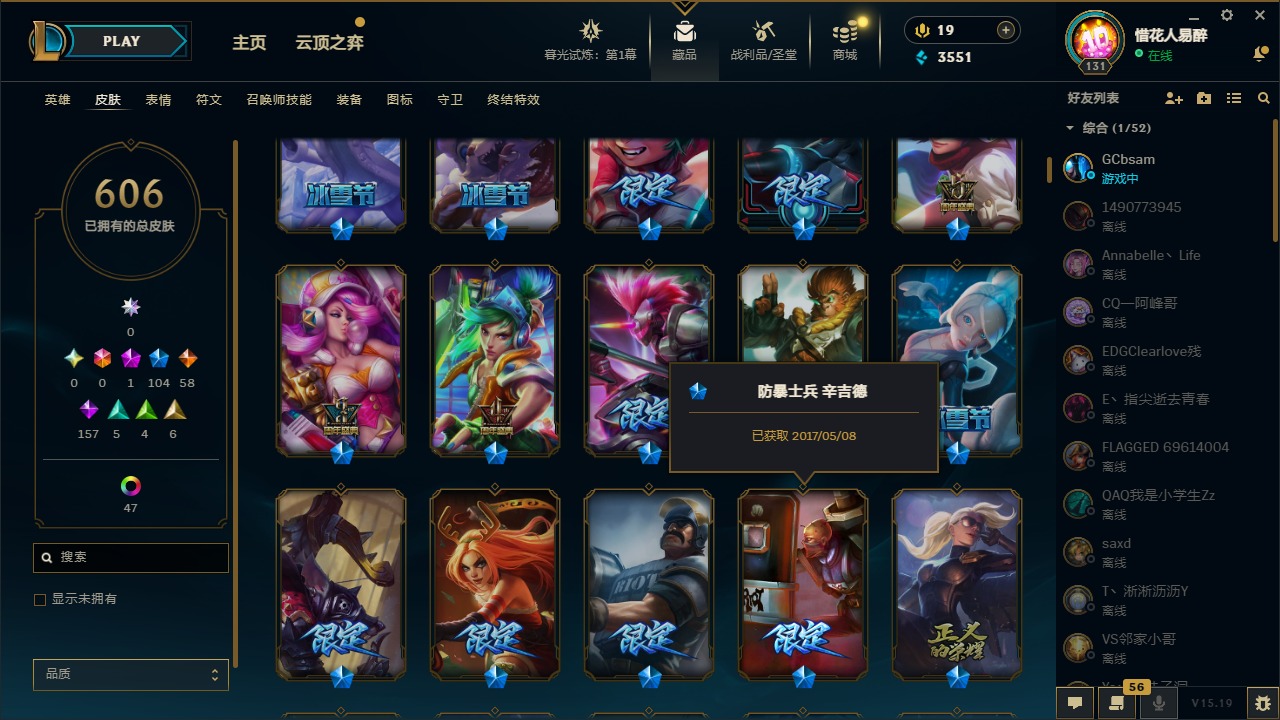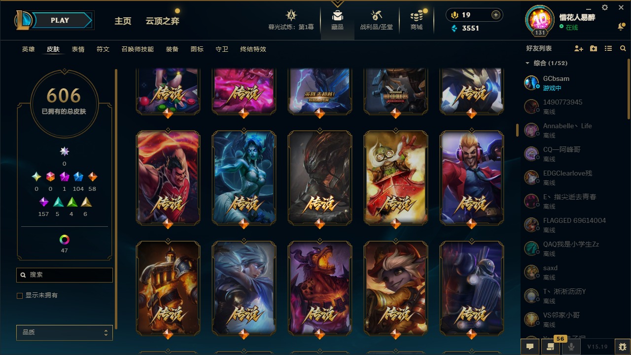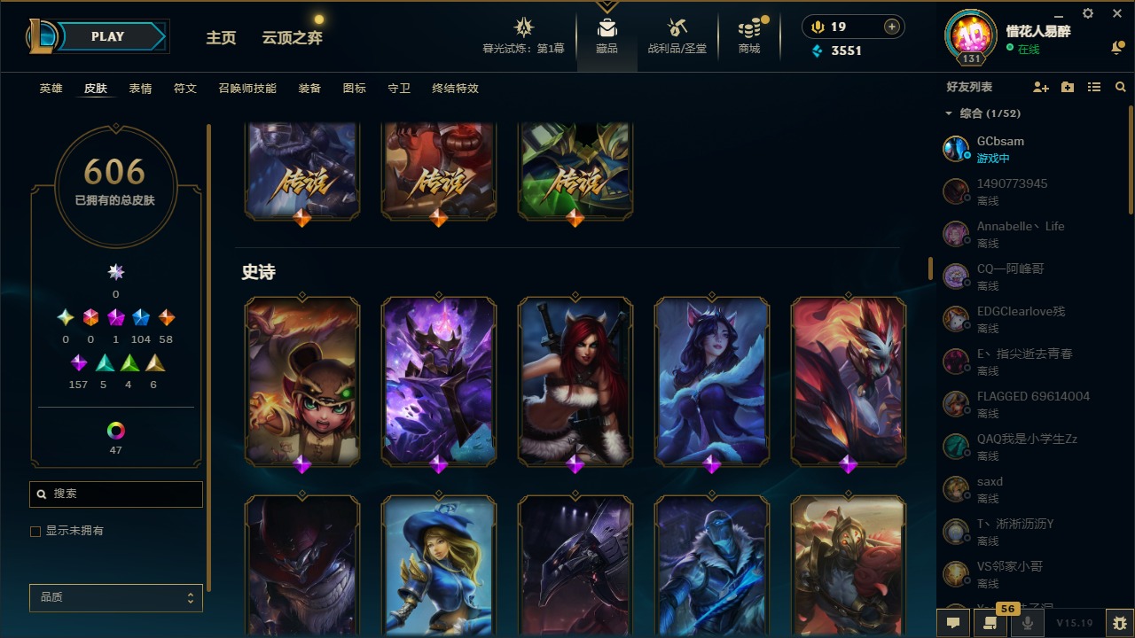 【10975014】[12732429]1神话 104限定 58传说 157史诗 606皮肤 54炫彩 153英雄 可二次 可修改实名 【限定】:哥特萝莉 安妮,生化领主 泰达米尔 【情人节限定】:觅心女王 艾希,觅心游侠 卢锡安,甜心之羽 霞 【冠军限定系列】:S1FNC 酒桶,S1FNC 迦娜,S1FNC 嘉文四世,S1FNC 卡尔萨斯,S1FNC 库奇,S2 暗杀星 蒙多,S2 暗杀星