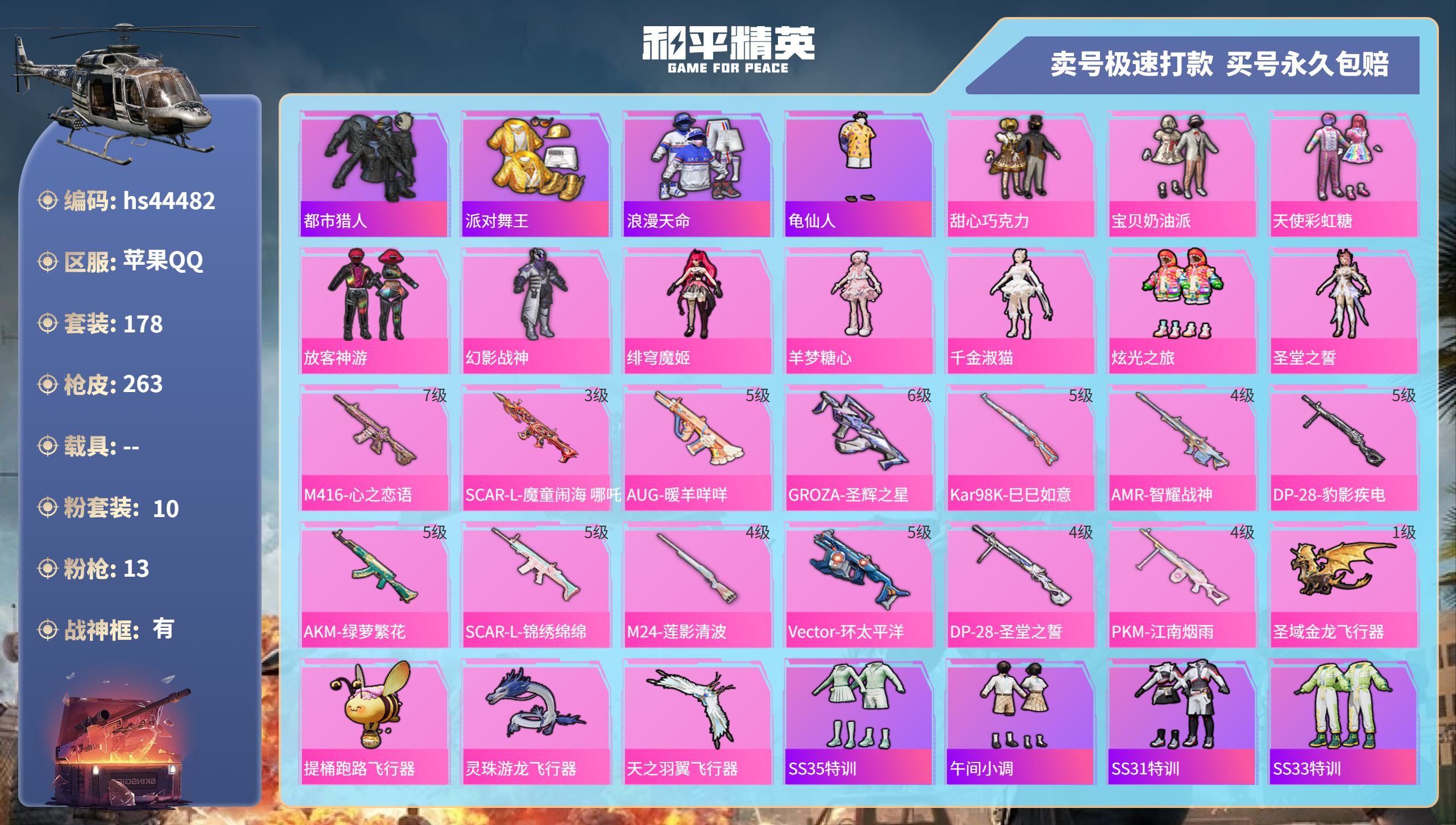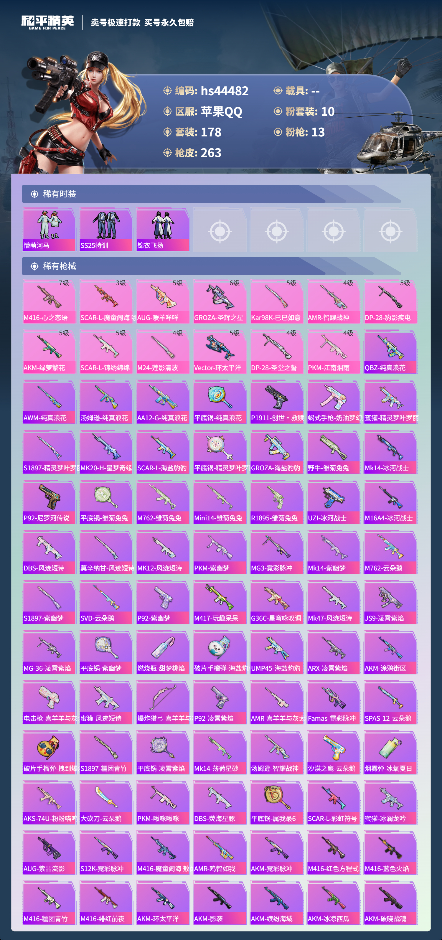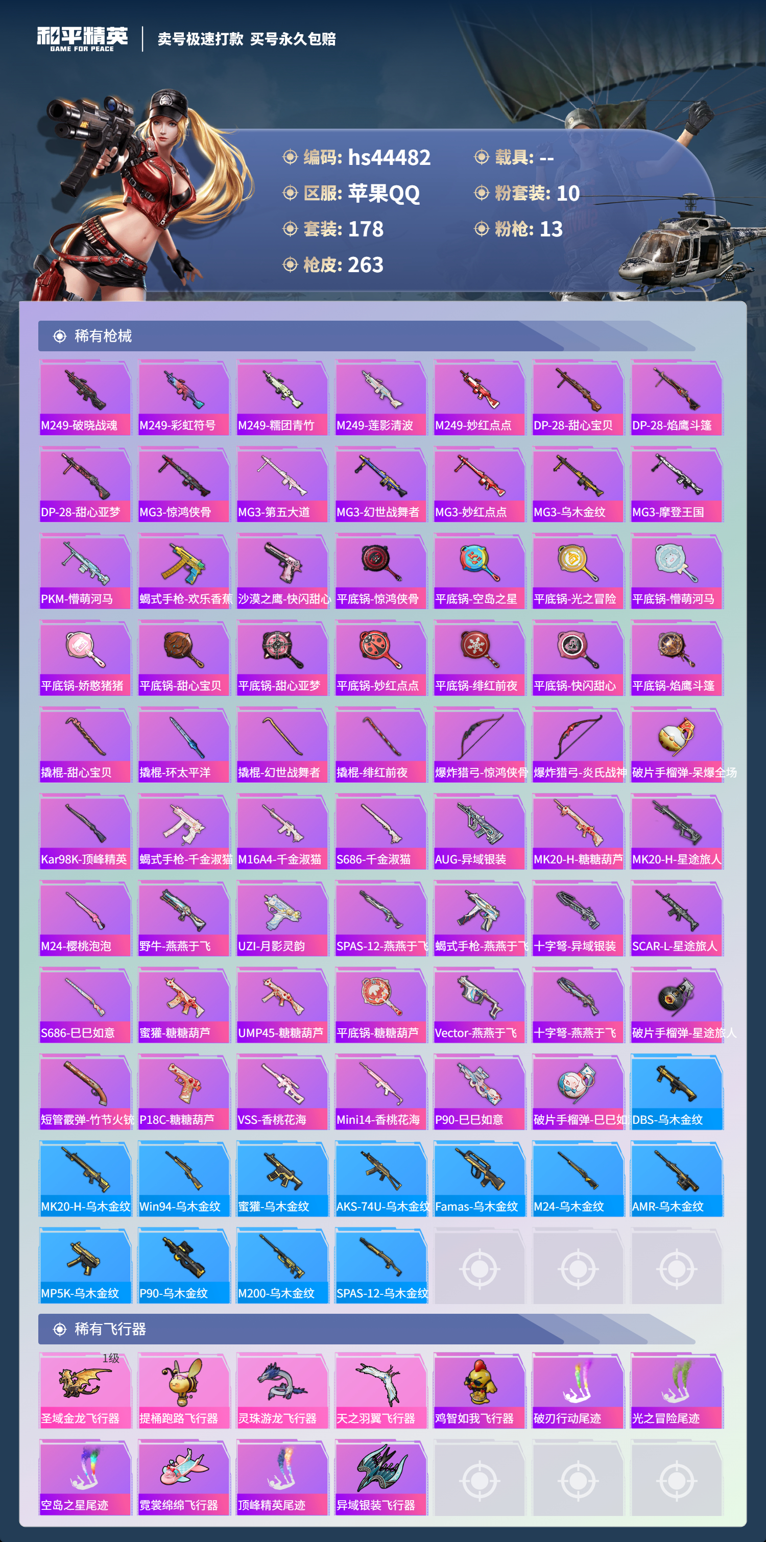 【10976585】【不可二次】【苹果QQ】龟仙人 AKM-绿萝繁花 水银刺客 M24-莲影清波 漫步者 都市猎人 DP-28-圣堂之誓 PKM-江南烟雨 Vector-环太平洋 甜心巧克力 SCAR-L-锦绣绵绵 放客神游 M416-心之恋语 AKM-缤纷海域 天使彩虹糖 天之羽翼飞行器 宝贝奶油派 幻影战神 派对舞王 浪漫天命