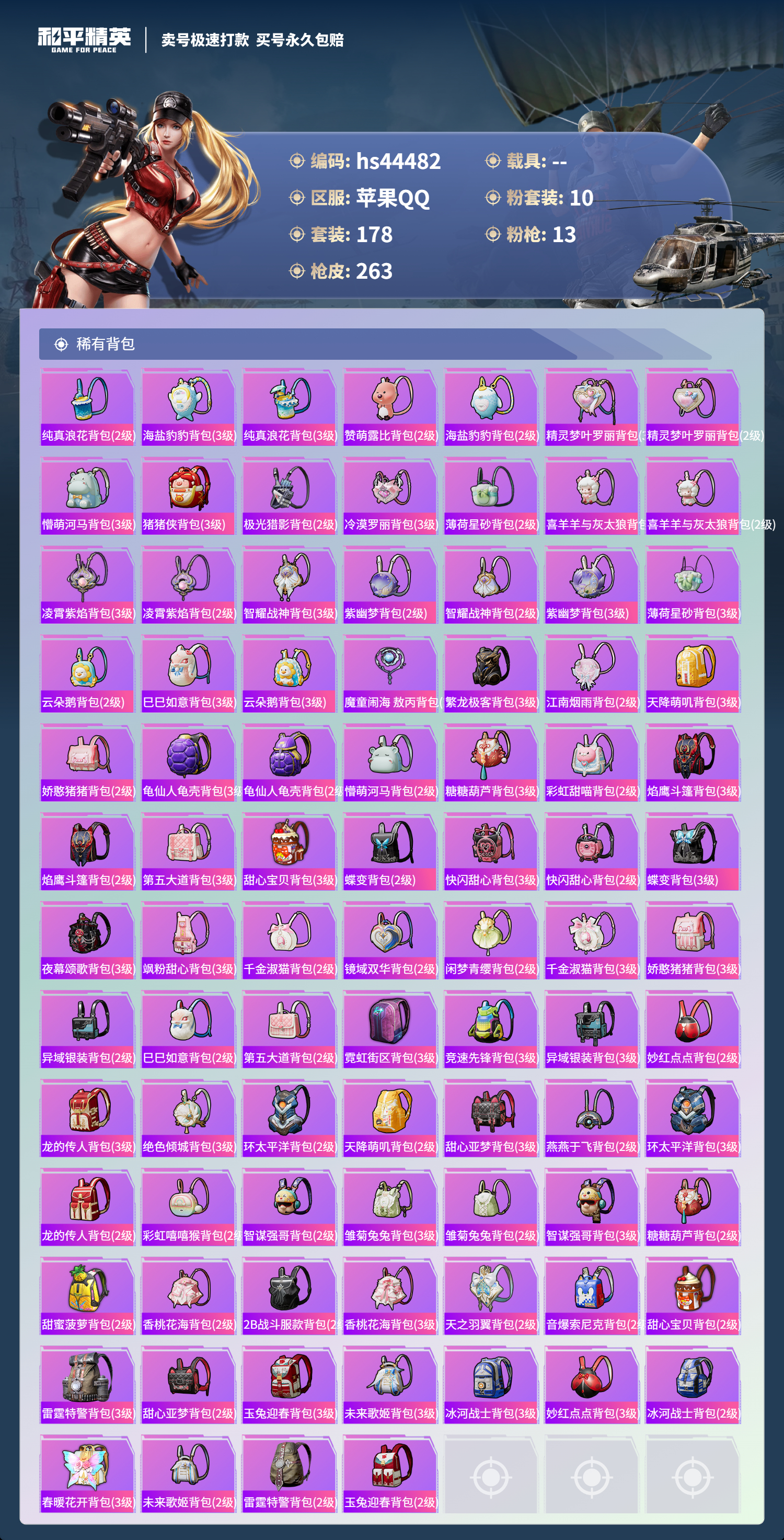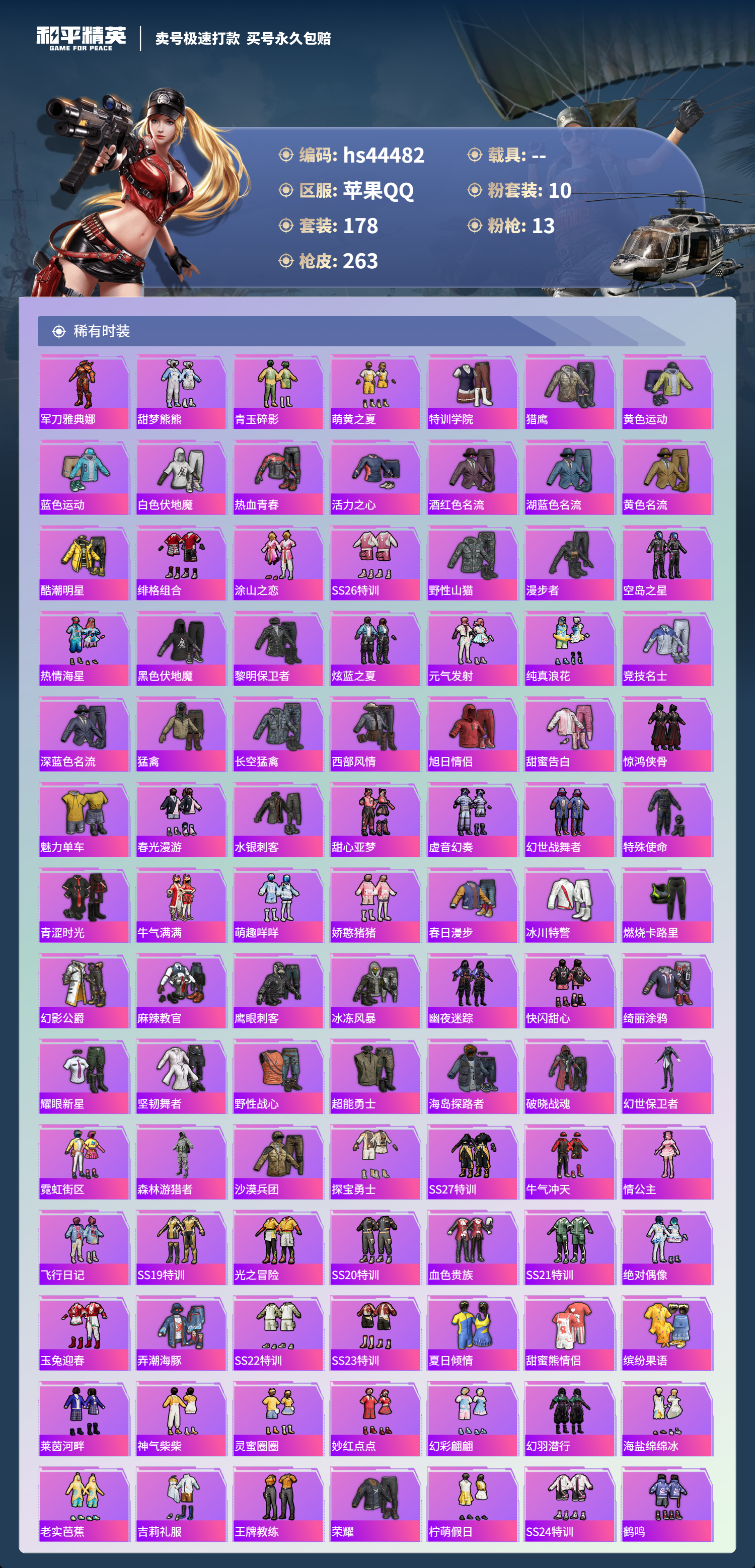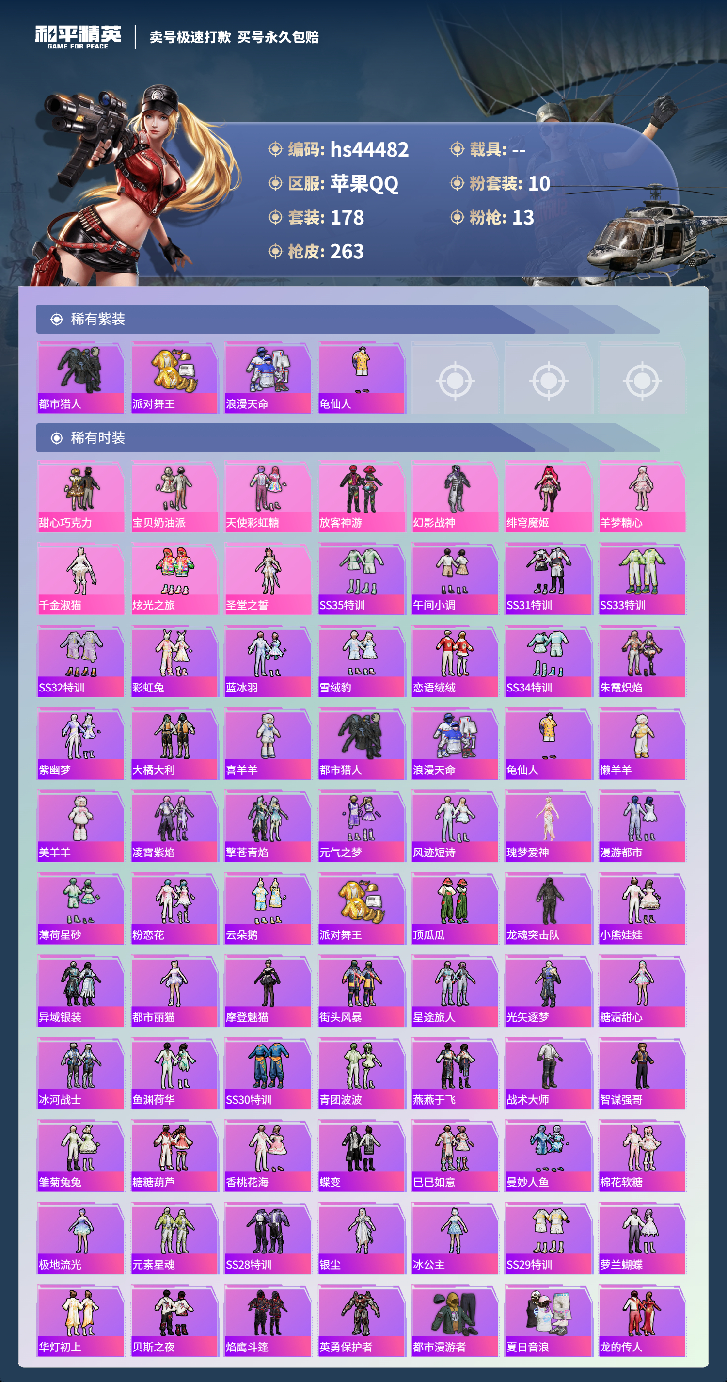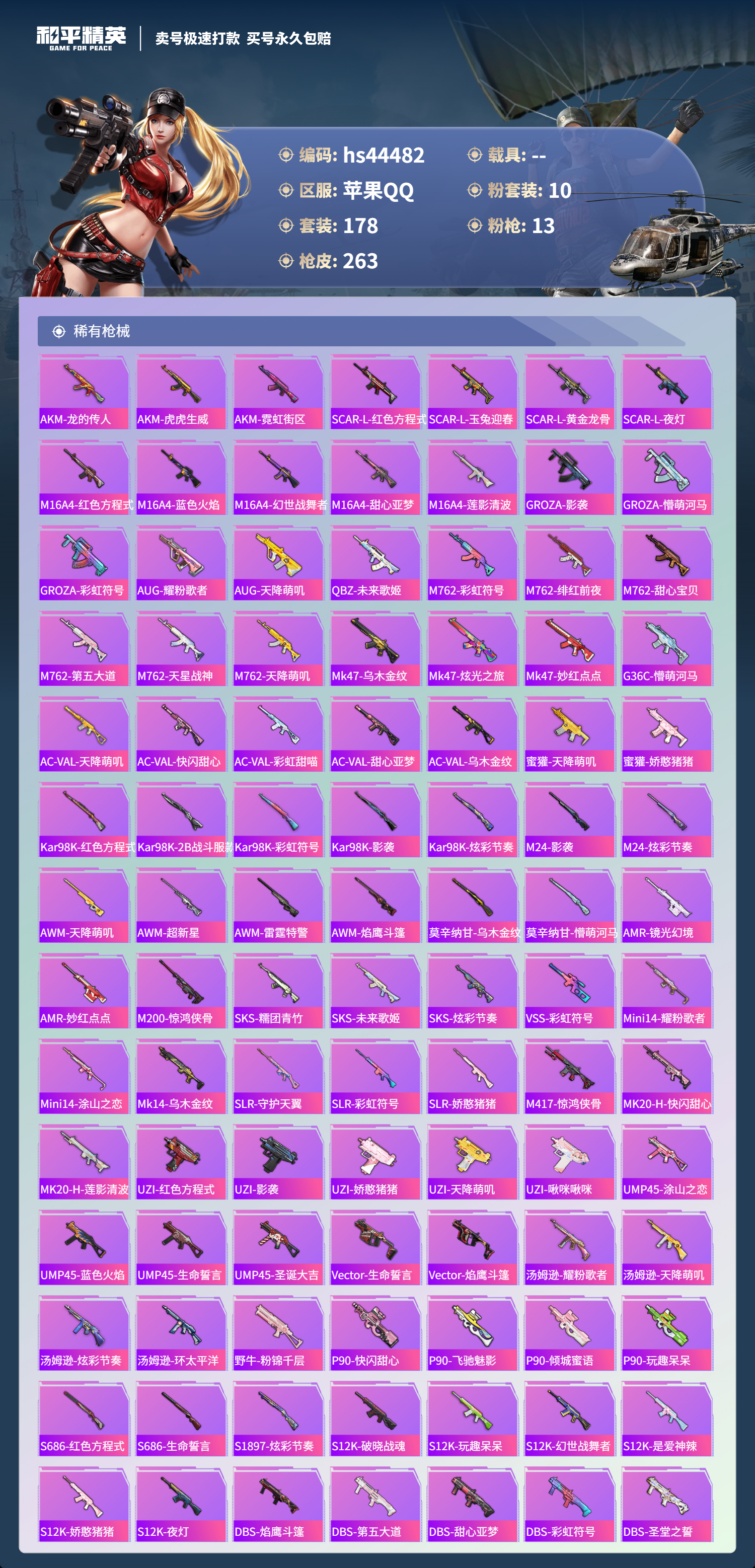 【10976585】【不可二次】【苹果QQ】龟仙人 AKM-绿萝繁花 水银刺客 M24-莲影清波 漫步者 都市猎人 DP-28-圣堂之誓 PKM-江南烟雨 Vector-环太平洋 甜心巧克力 SCAR-L-锦绣绵绵 放客神游 M416-心之恋语 AKM-缤纷海域 天使彩虹糖 天之羽翼飞行器 宝贝奶油派 幻影战神 派对舞王 浪漫天命