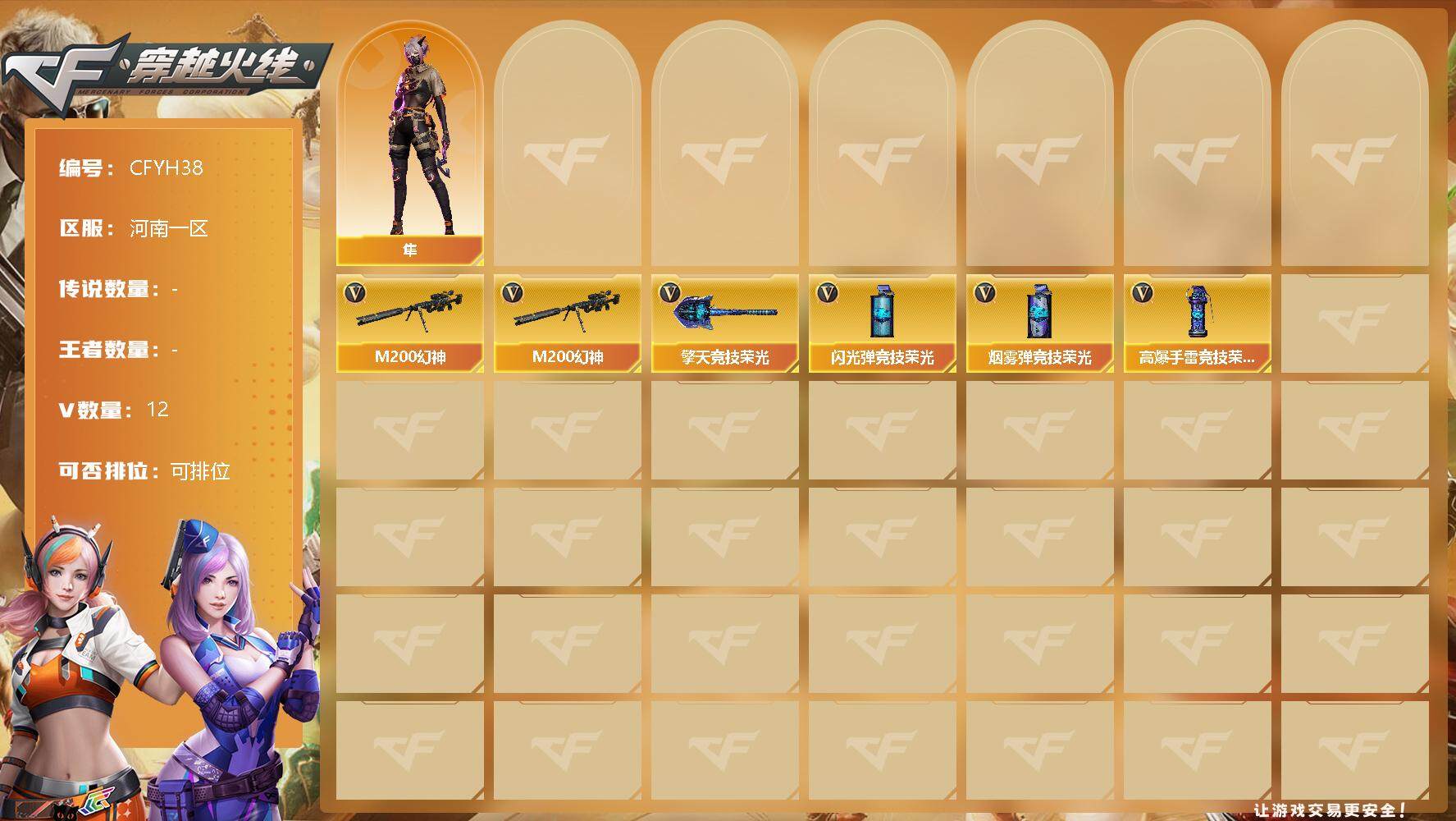 【10979852】【10979852】【CFYH38】11V/32级/尉官/1英雄/M200-幻神/隼(角色)/擎天-竞技荣光/高爆手雷-竞技荣光/烟雾弹- 签约卖家