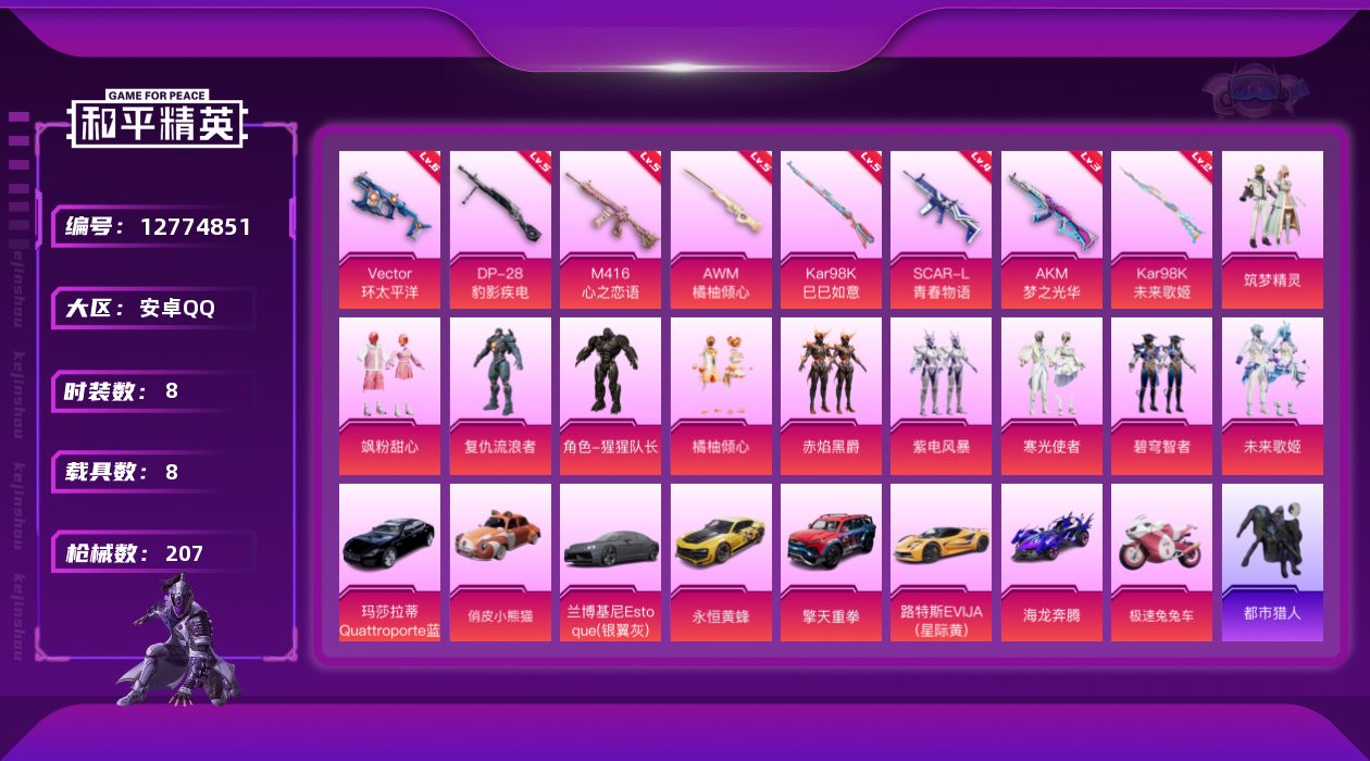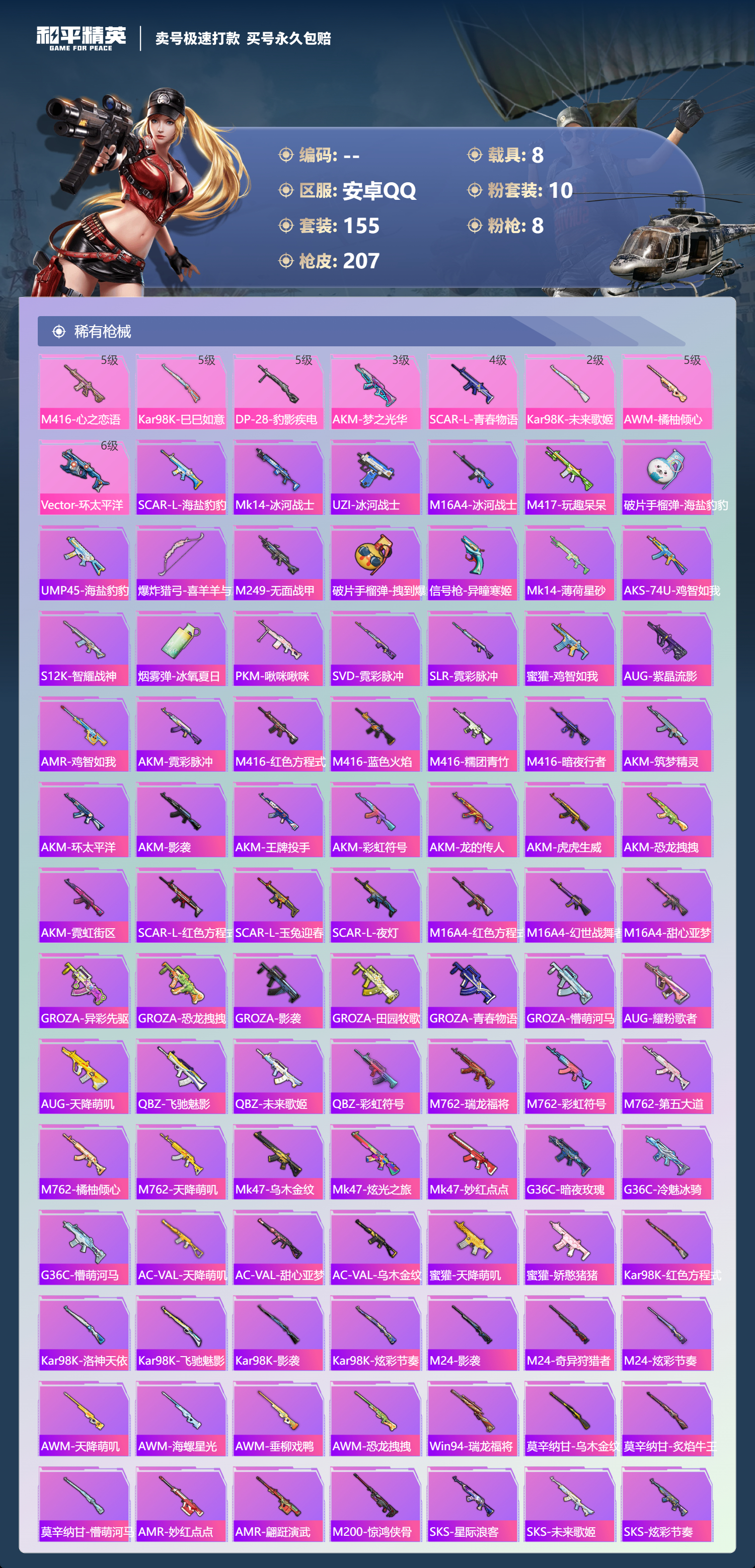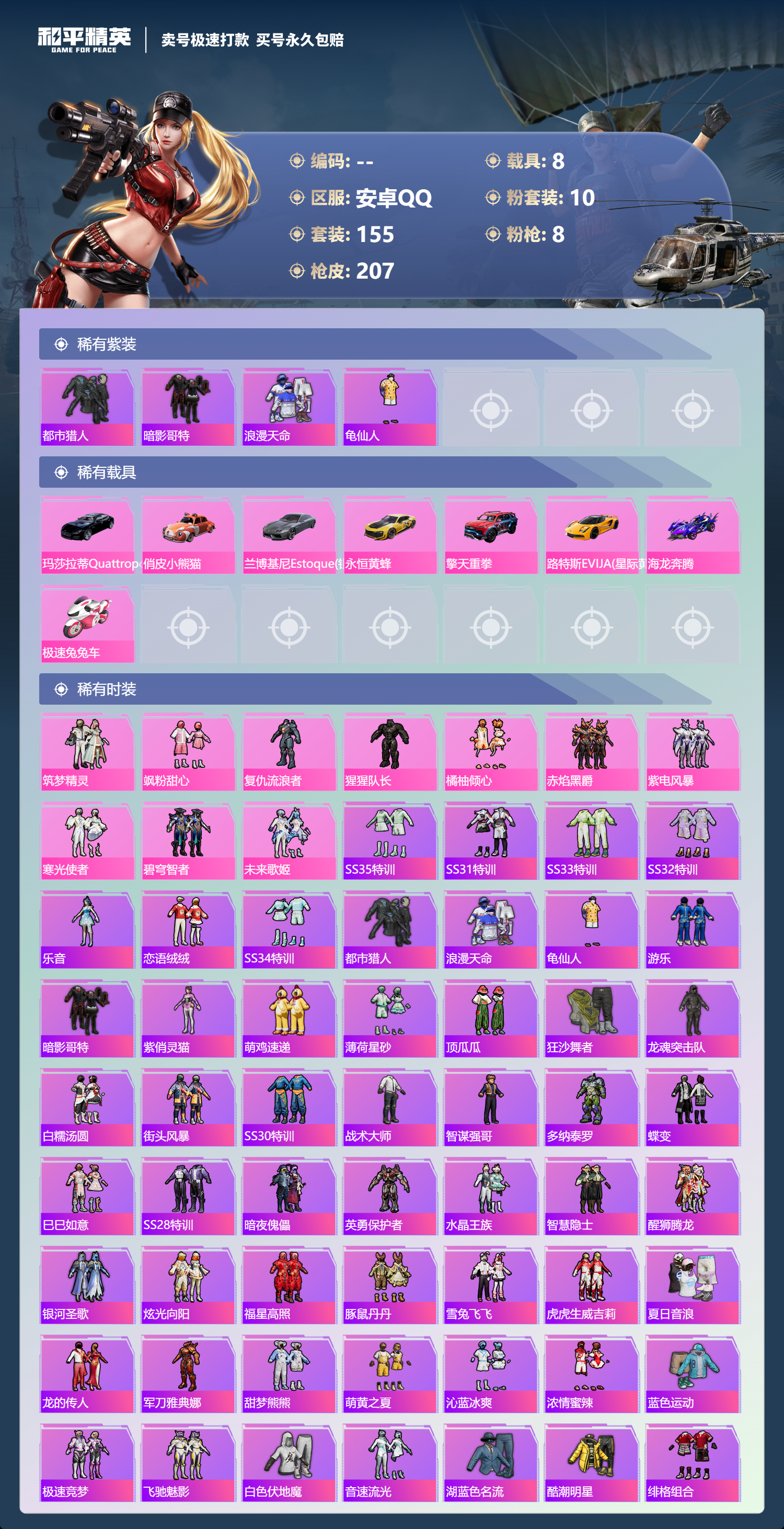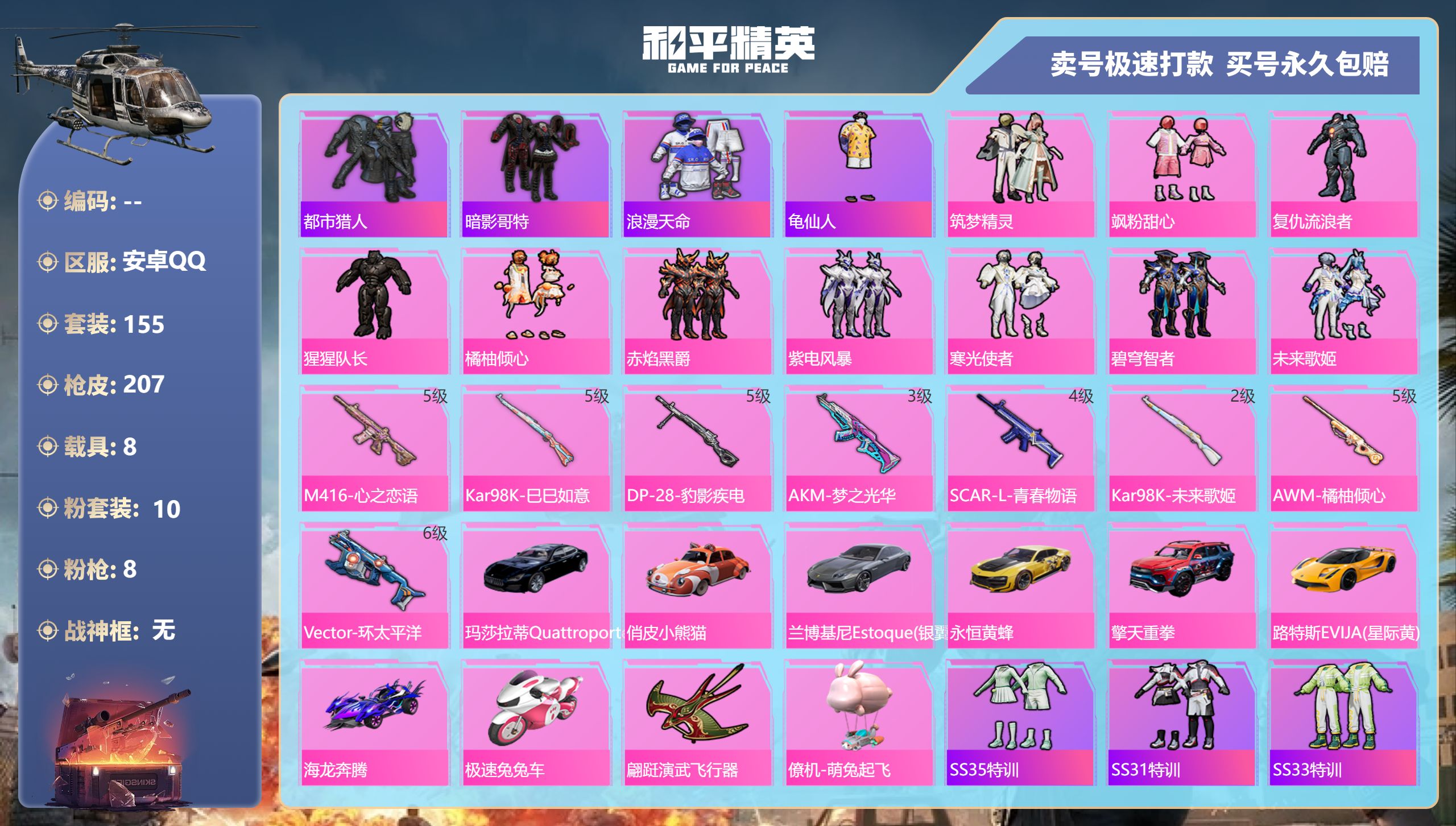 【10984134】【可二次】【安卓QQ】龟仙人 路特斯EV黄色 漫步者 都市猎人 M24-奇异狩猎者 海龙奔腾 AWM-橘柚倾心 豚鼠丹丹 Kar98k-未来歌姬 俏皮小熊猫 赤焰黑爵 M416-心之恋语 瑞龙福将 醒狮腾龙 浪漫天命 团圆交子 紫电风暴 极速兔兔车 M762-瑞龙福将 Vector-环太平洋 翩跹演武飞行器 兰博轿车灰色 狂沙舞者 AKM-梦之光华 永恒黄蜂 SCAR-L-青