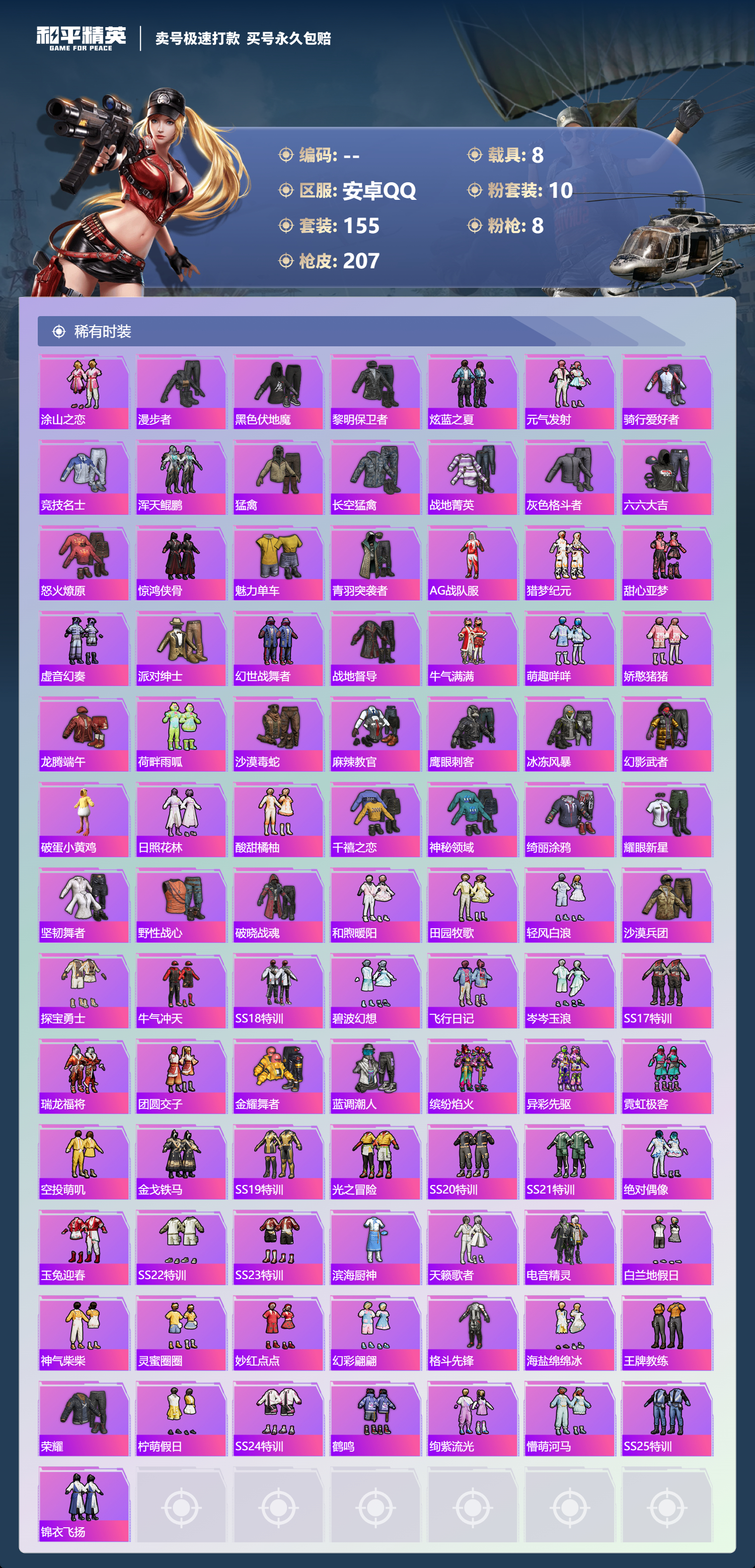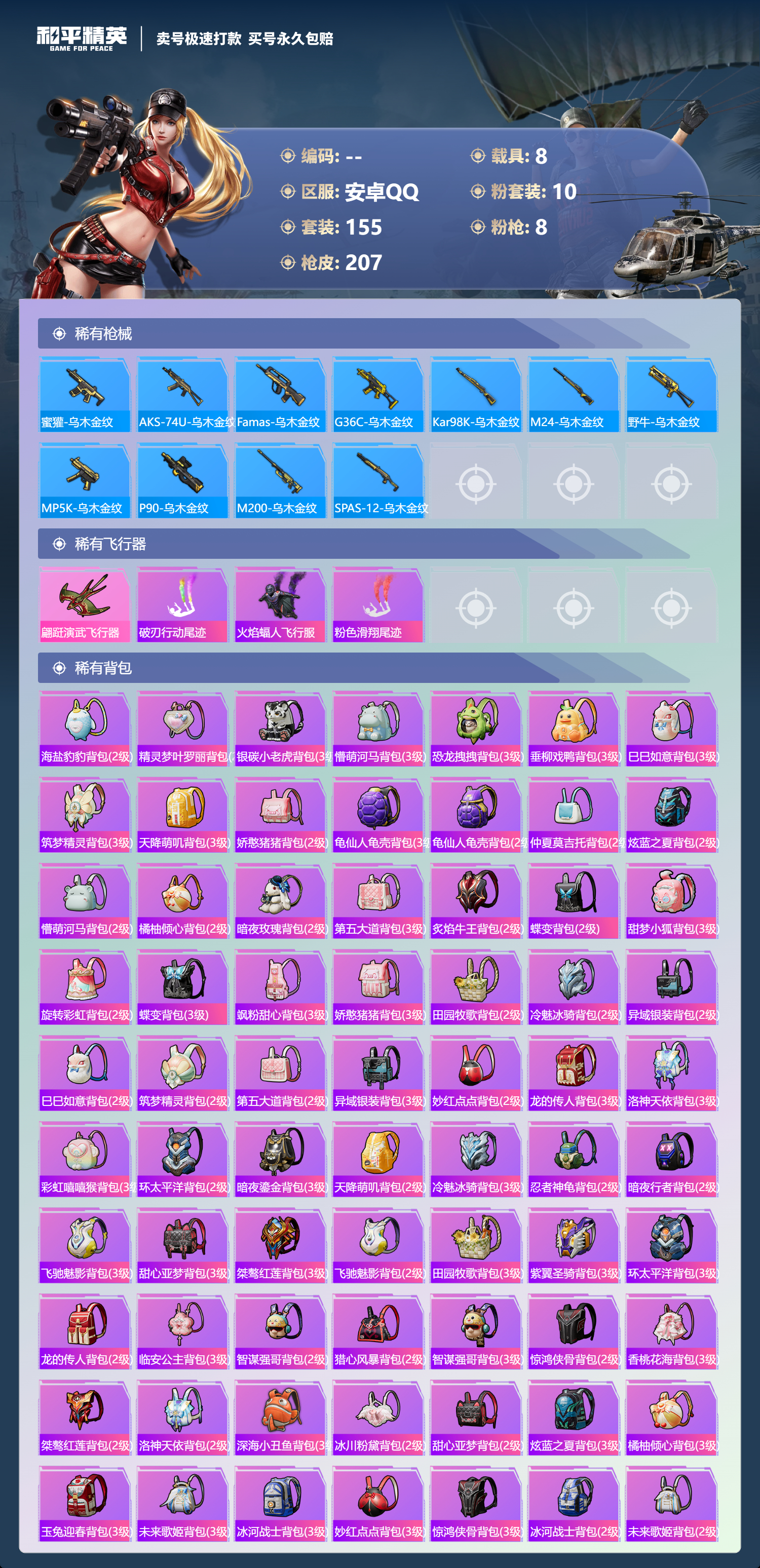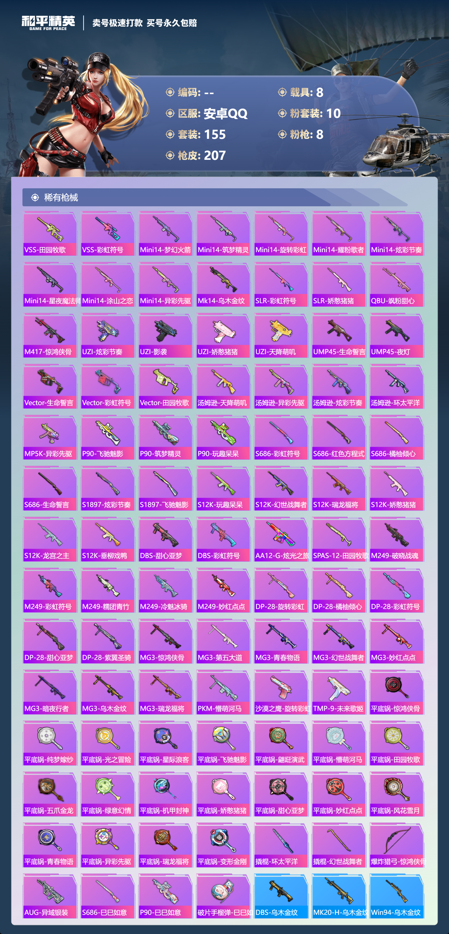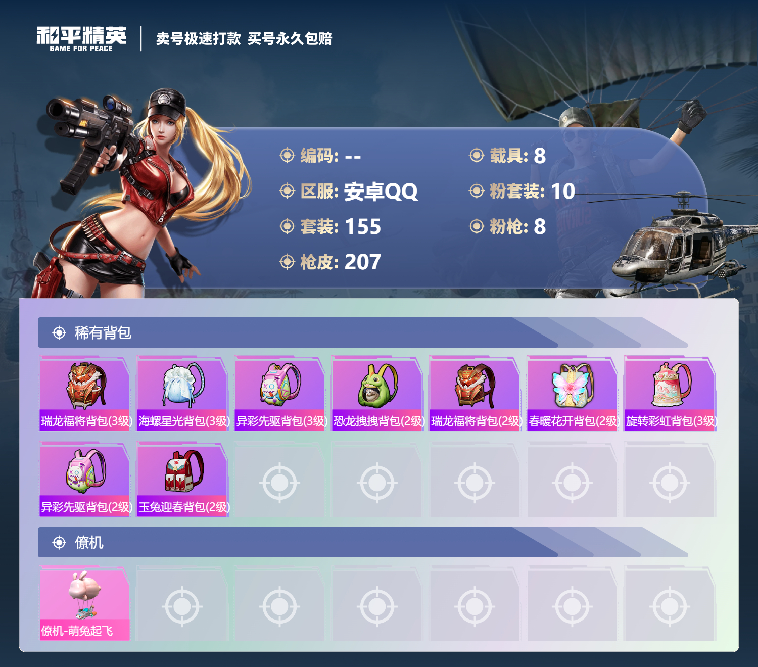 【10984134】【可二次】【安卓QQ】龟仙人 路特斯EV黄色 漫步者 都市猎人 M24-奇异狩猎者 海龙奔腾 AWM-橘柚倾心 豚鼠丹丹 Kar98k-未来歌姬 俏皮小熊猫 赤焰黑爵 M416-心之恋语 瑞龙福将 醒狮腾龙 浪漫天命 团圆交子 紫电风暴 极速兔兔车 M762-瑞龙福将 Vector-环太平洋 翩跹演武飞行器 兰博轿车灰色 狂沙舞者 AKM-梦之光华 永恒黄蜂 SCAR-L-青