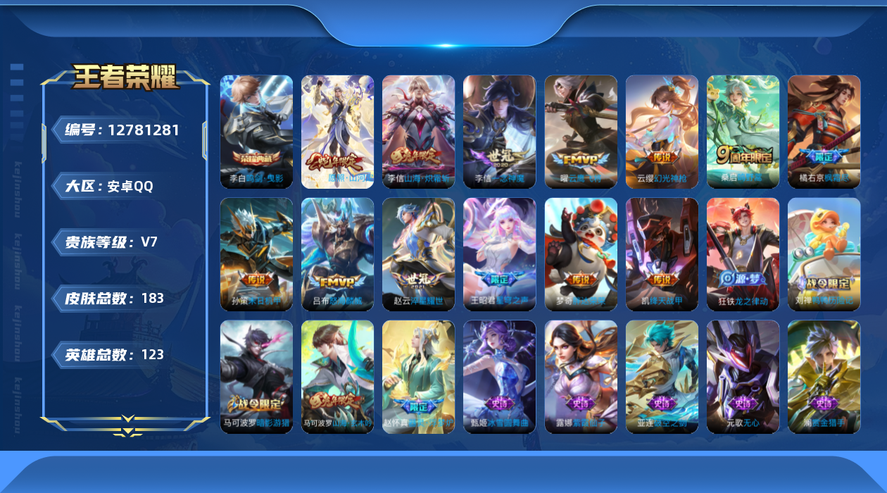 [12781281]安卓Q-V7-永恒钻石III段位-123英雄-183皮肤-1典藏-0珍品无双-0无双-0珍品传说-13传说-55史诗 【荣耀典藏】:李白鸣剑曳影 【传说皮肤】:司空震愿照山河定,云缨幻光神枪,桑启鸣野蒿,李信山海炽霜斩,吕布怒海麟威,王昭君星穹之声,橘右京枫霜尽,孙策末日机甲,赵云淬星耀世,铠绛天战甲,曜云鹰飞将,李...