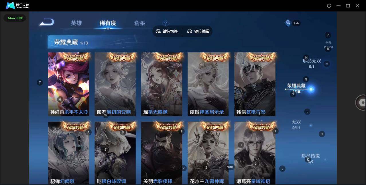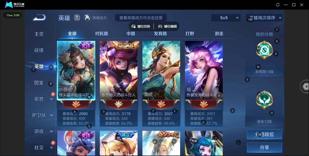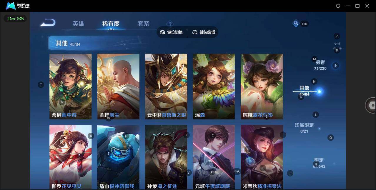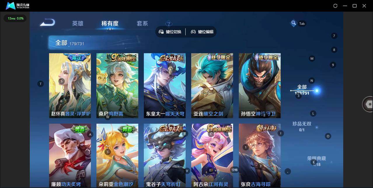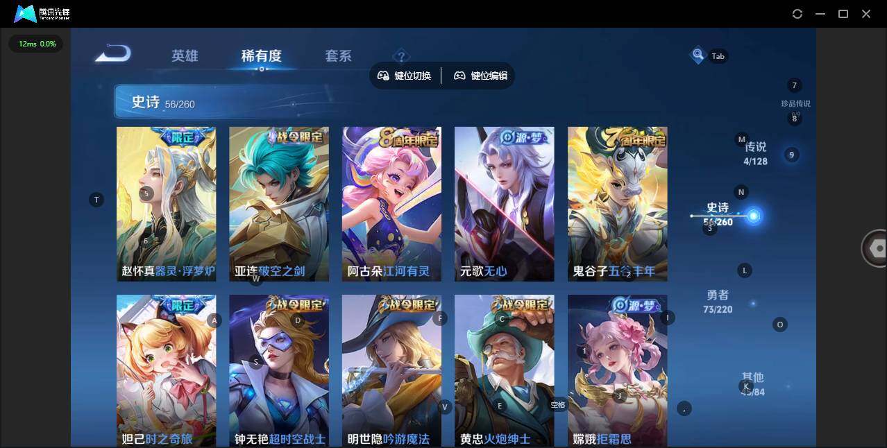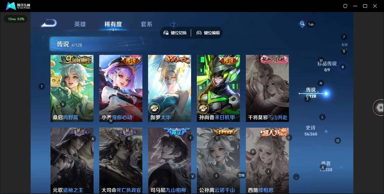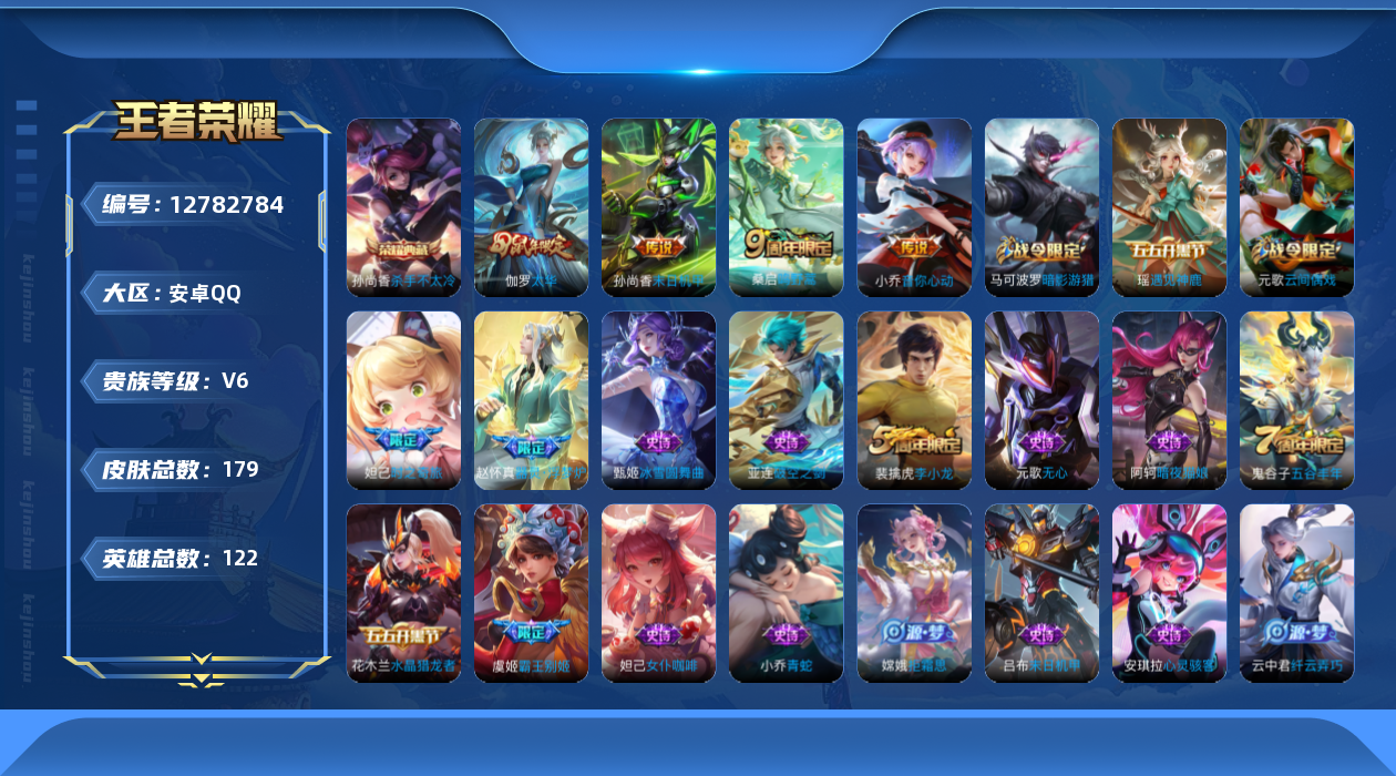 [12782784]: 可修改 贵族等级: V6 英雄数: 122 皮肤数: 179 荣耀水晶: 杀手不太冷 传说皮: 末日机甲-孙尚香,音你心动-小乔 限定皮: 李小龙,游园惊梦,梁祝,太华,霸王别姬-虞姬,高山流水,时之奇旅-妲己,五谷丰年,鸣野蒿