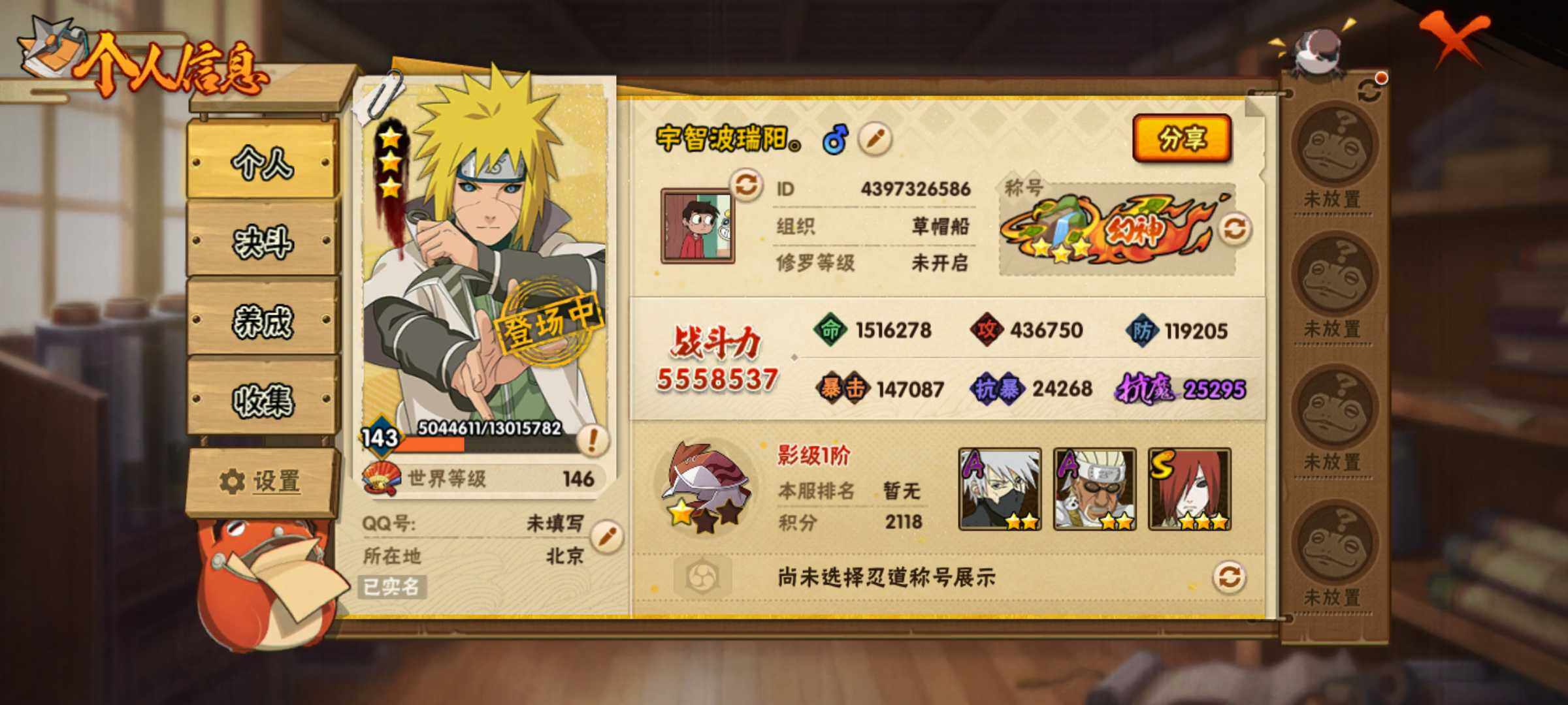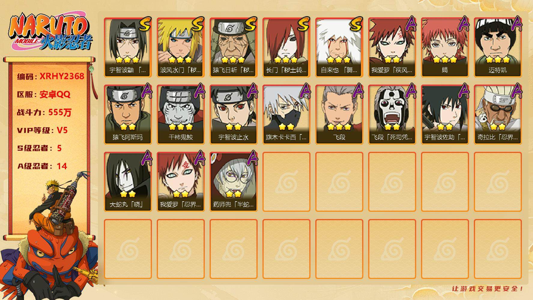 [12807269]Xr43076-安卓q区-可二次-5S级忍者数-14A级忍者数 【S级忍者】:长门「秽土转生」(3星),猿飞日斩「秽土转生」(3星),波风水门「秽土转生」(3星),宇智波鼬「须佐能乎」(3星),自来也「舞之豪杰」(3星) 【A级忍者】:大蛇丸「晓」(2星),奇拉比「忍界大战」(2星),飞段(3星),飞段「死司凭血」(2星),干柿鬼鲛...