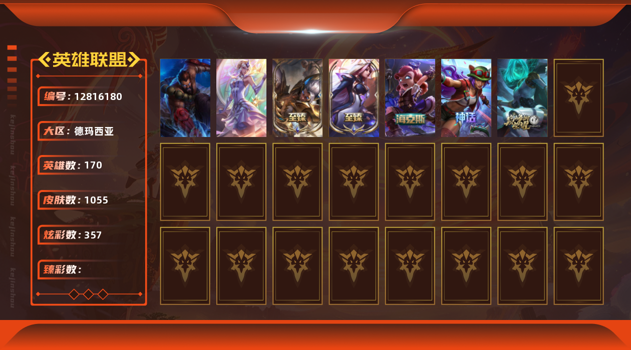【10993329】[12816180]A5098/可二次/德玛西亚【170英雄-1055皮肤-357炫彩】【附带穿越火线/97V】德玛西亚/170英雄-1055皮肤-357炫彩-段位:未定级 大元素使 拉克丝未来战士 伊泽瑞尔 灵魂守卫 乌迪尔 DJ 娑娜 至臻 星之守护者 索拉卡 至臻 征服者 贾克斯 至臻 绝息圣堂 厄运小姐 海克斯科技 安妮 水晶掠夺者 卡兹克 十五周年纪念 希维尔 十周