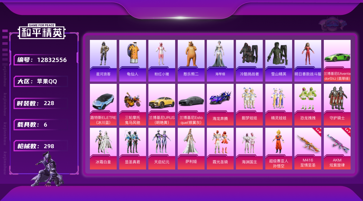 【10996406】【可二次】【苹果QQ】兰博SVJ绿色 恐龙拽拽 都市猎人 海龙奔腾 酣梦娃娃 天启纪元 兰博轿车灰色 兰博SUV黄色 显圣真君 M762-甜心娃娃 AKM-炫紫旋律 精灵娃娃 鬼马风驰 梦幻火箭 守护骑士 M416-心之恋语 海渊国主 SCAR-L-青春物语 M249-古战神甲