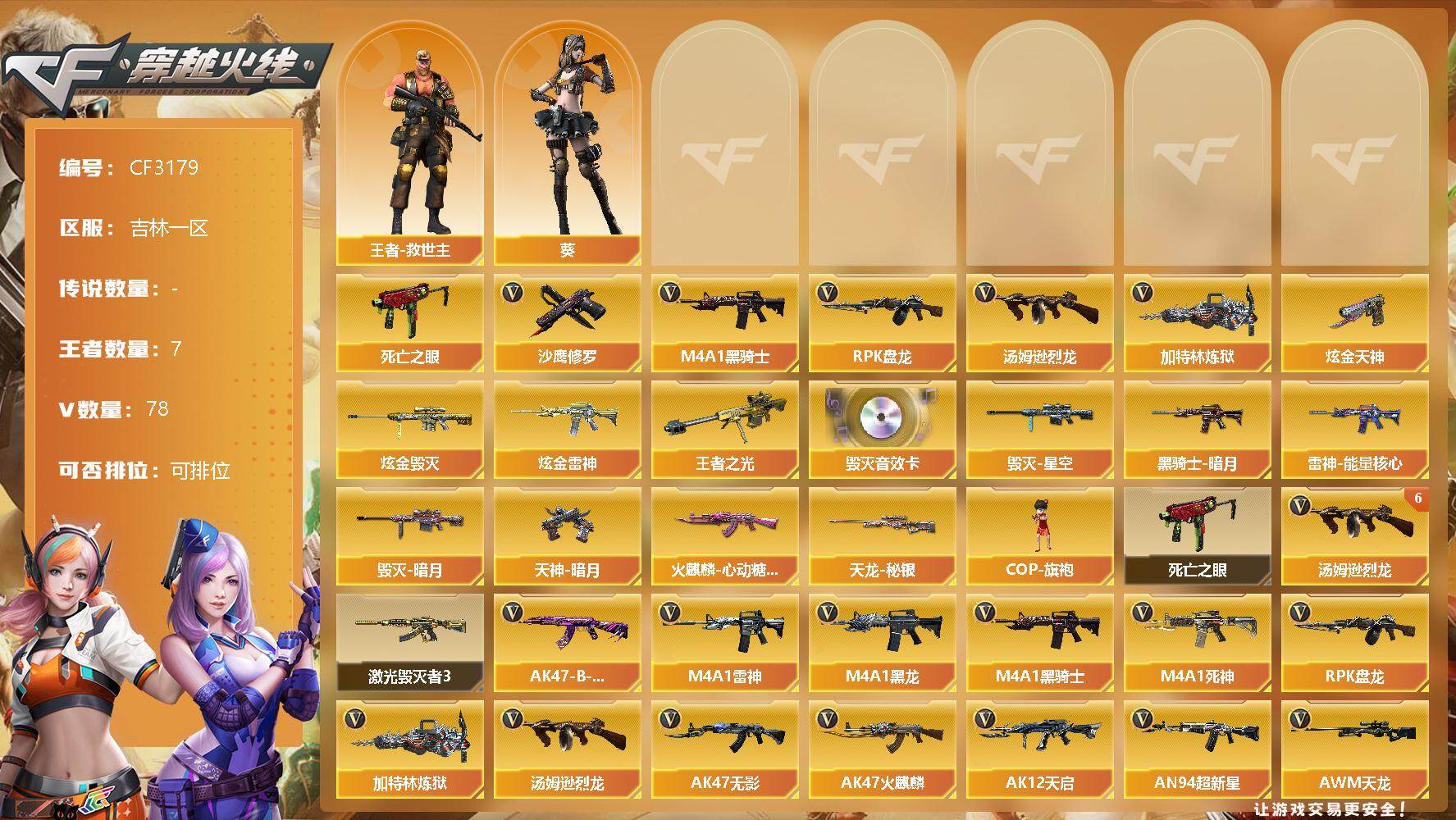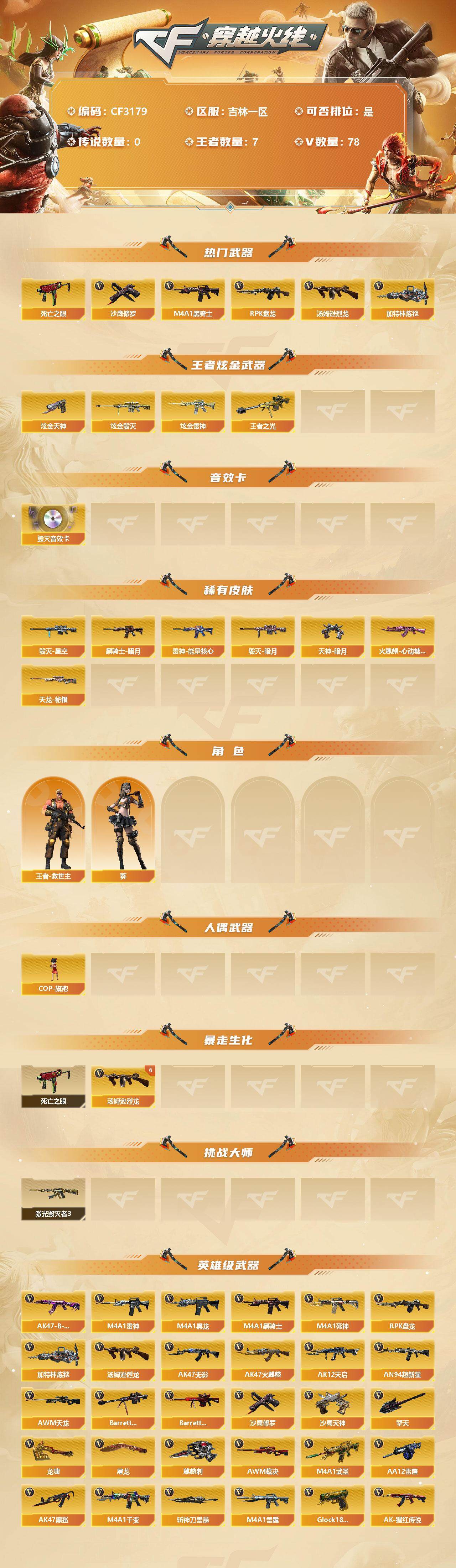 【10999941】【10999941】【CF3179】吉林一区-78V-7王者-5炫金【6烈龙】【死亡之眼】【AWM-裁决】【M4A1-雷霆】【加特林-炼狱