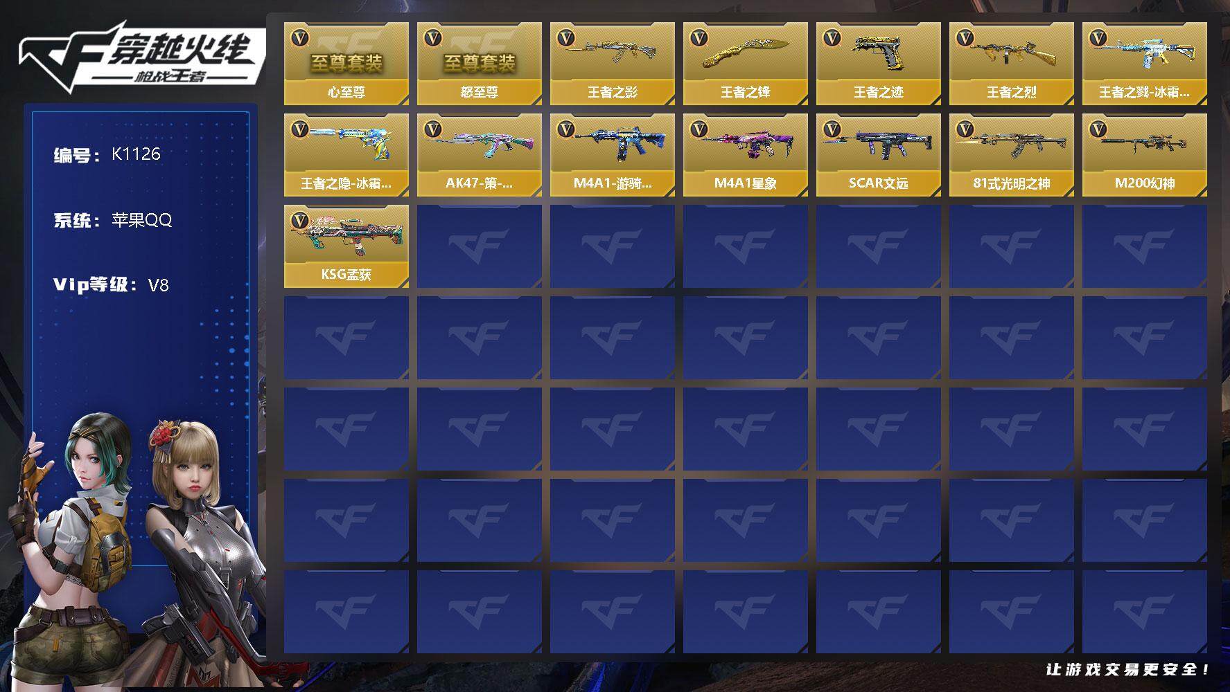 【11001050】[12853422]K1126/苹果qq/可二次【贵8/V值217340/总V320】【2至尊套/1同框】【心至尊/怒至尊】【AK47-策-霸魂/M4A1-游骑兵-枪娘/M4A1-星象/SCAR-文远/81式-光明之神-千变-三足金乌/MK47-仁德/M200-幻神/KSG-孟获/】【王者之心-拉丝/王者之魂-白金血钻/王者之锋/王者之戮-冰霜奇迹/王者之隐-冰霜奇迹/王者之