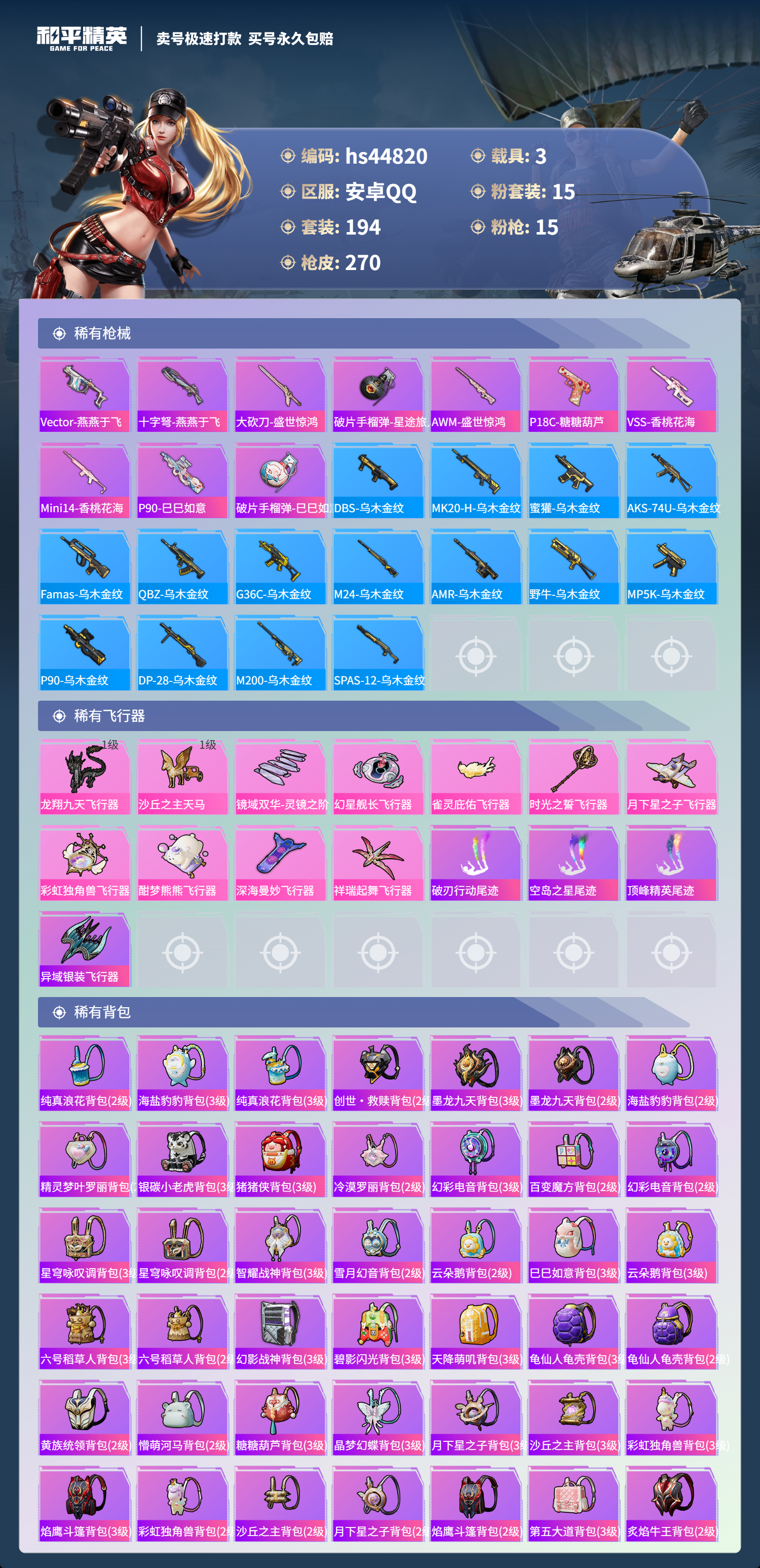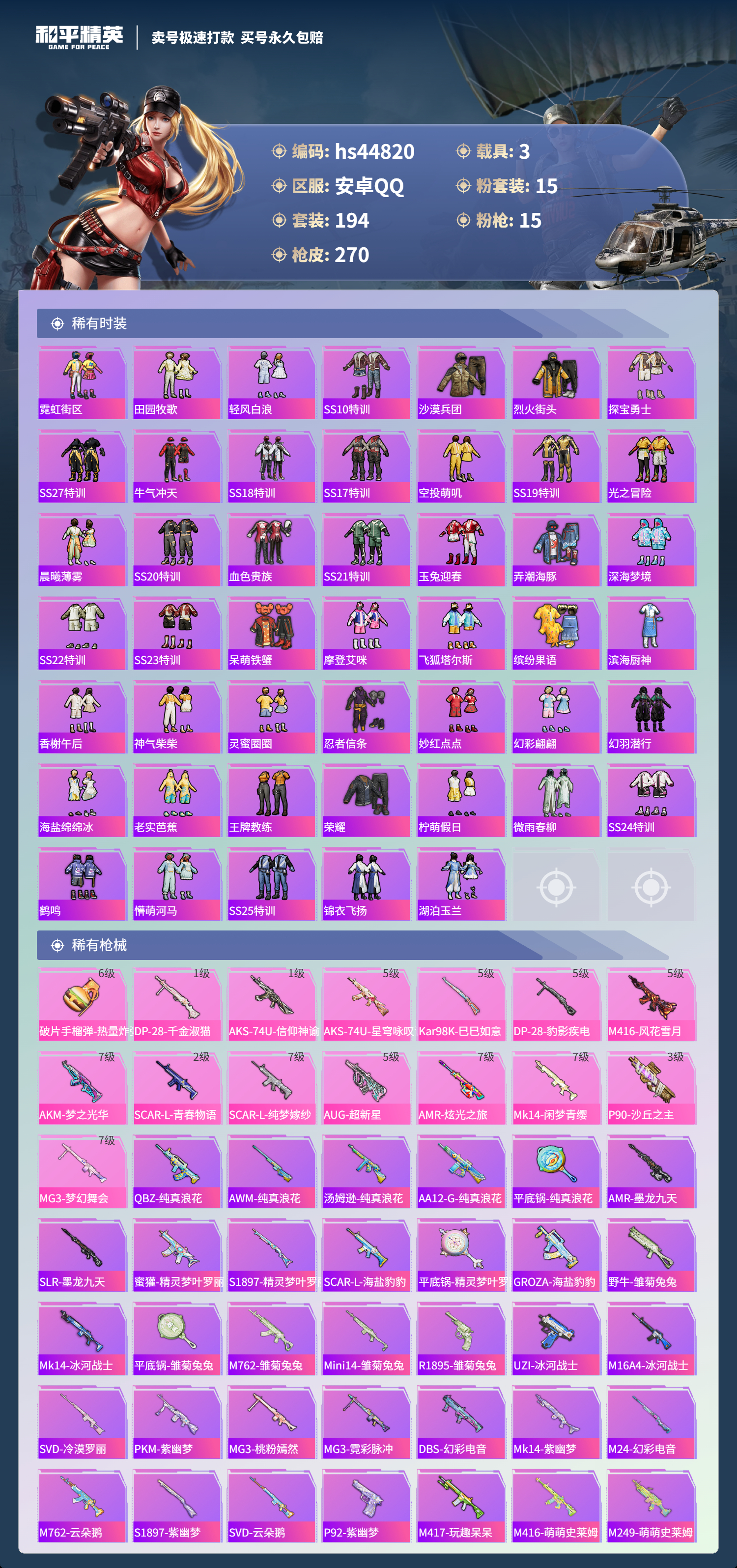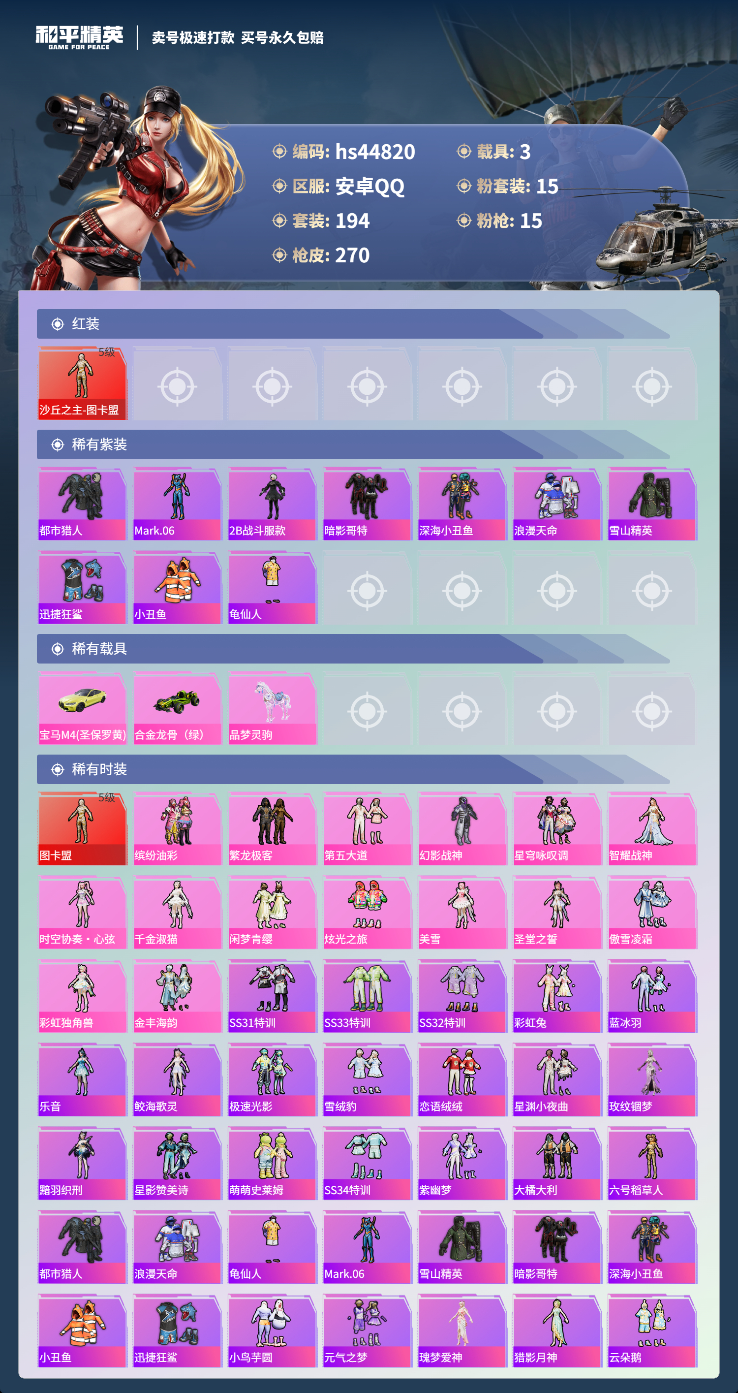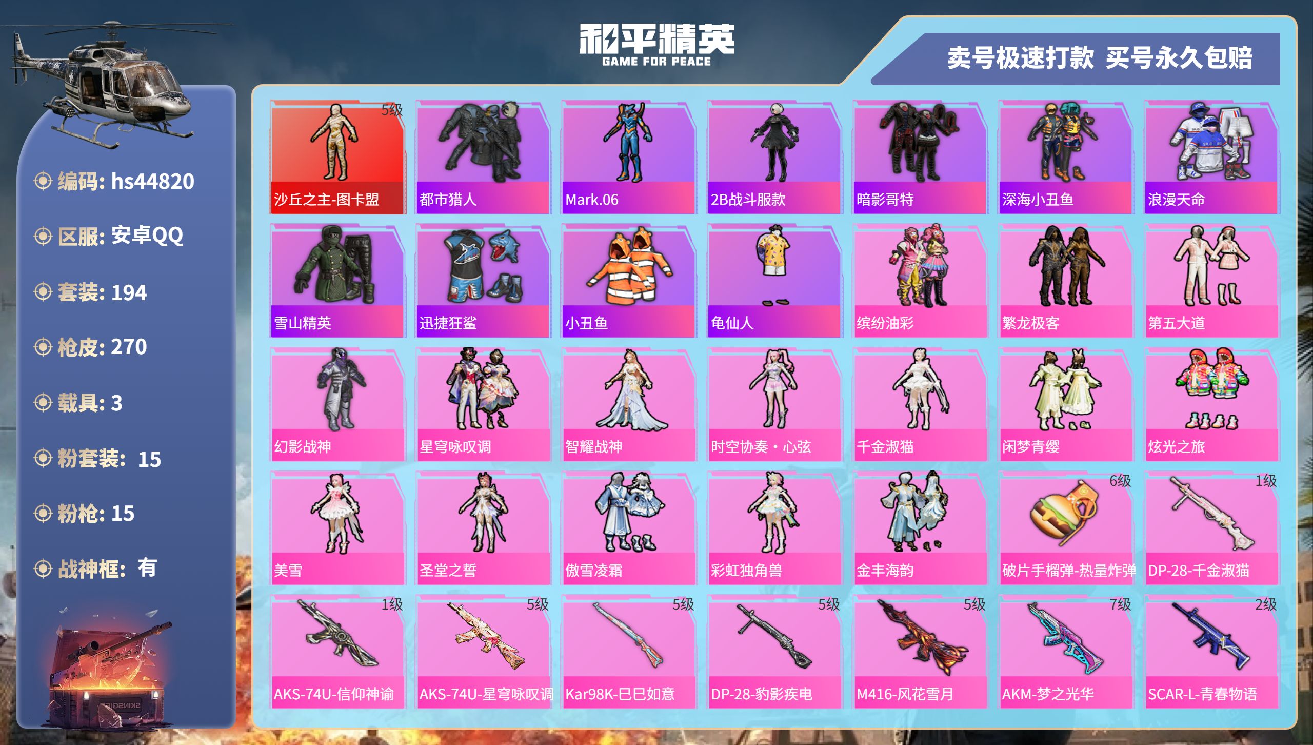 【11003630】【不可二次】【安卓QQ】龟仙人 S686-奇异狩猎者 漫步者 P90-沙丘之主 都市猎人 忍者信条 MK14-闲梦青缨 沙丘之主-图卡盟 缤纷油彩 深海小丑鱼 AMR-炫光之旅 浪漫天命 深海曼妙飞行器 MG3-梦幻舞会 合金龙骨绿色 迅捷狂鲨 AUG-超新星 龙翔九天飞行器 诡面顽熊 繁龙极客 M416-风花雪月 AKM-梦之光华 AKM-缤纷海域 SCAR-L-纯梦嫁纱