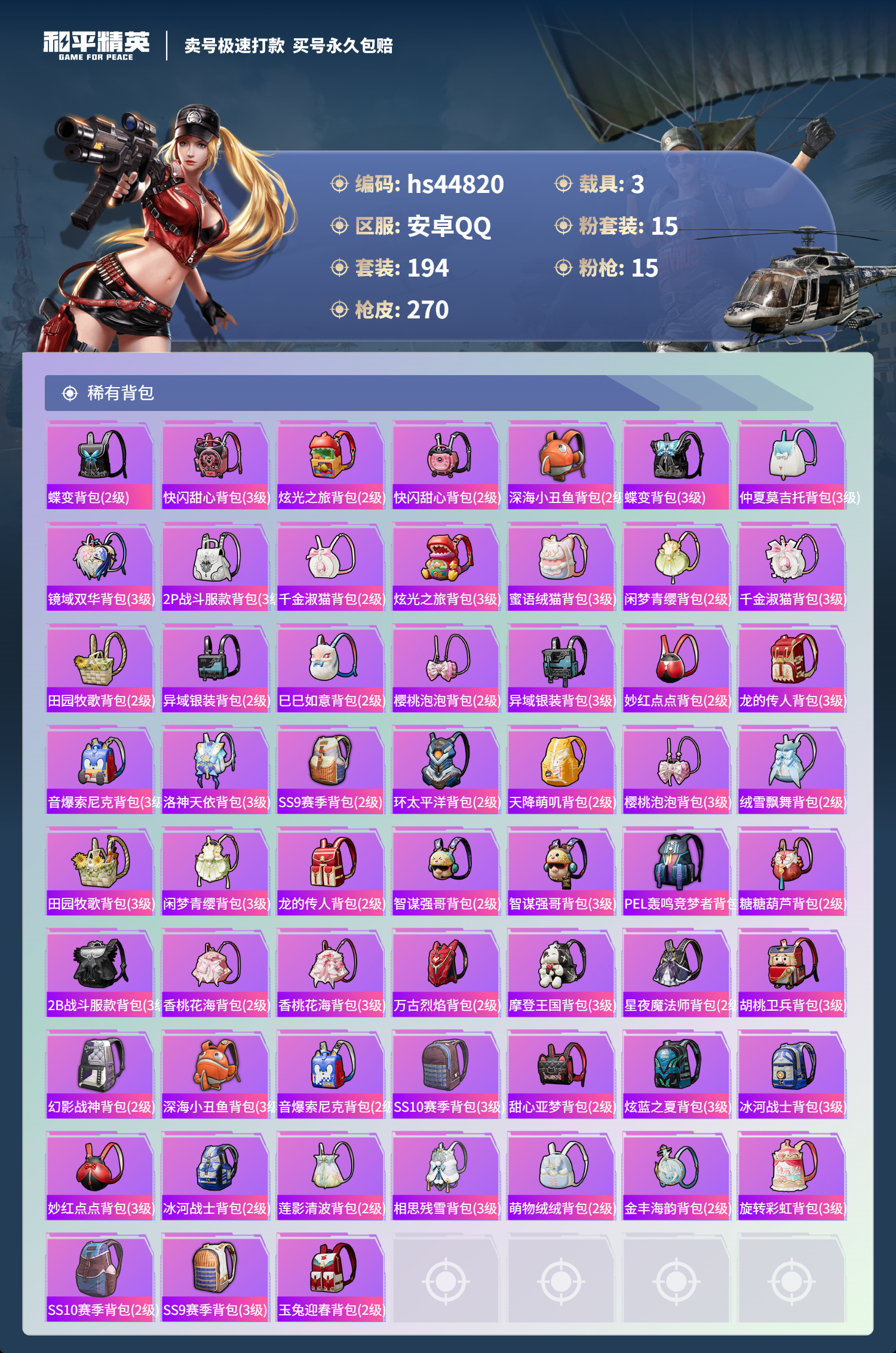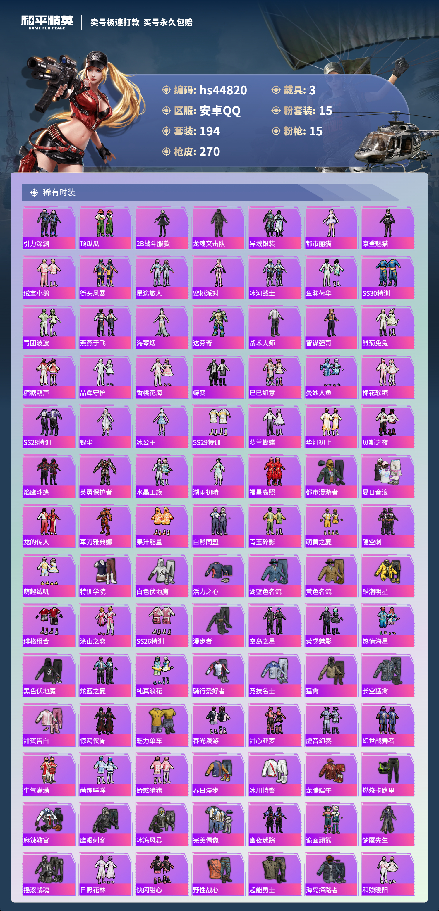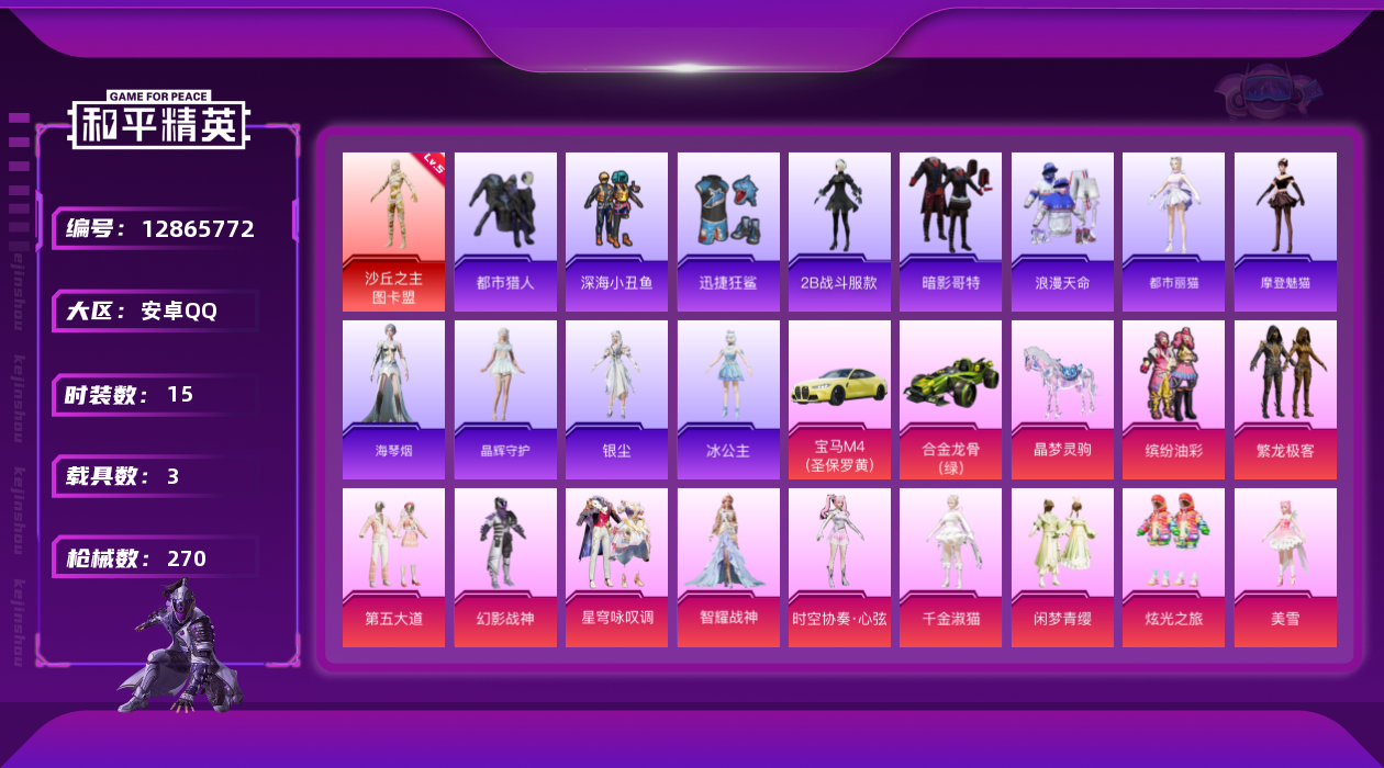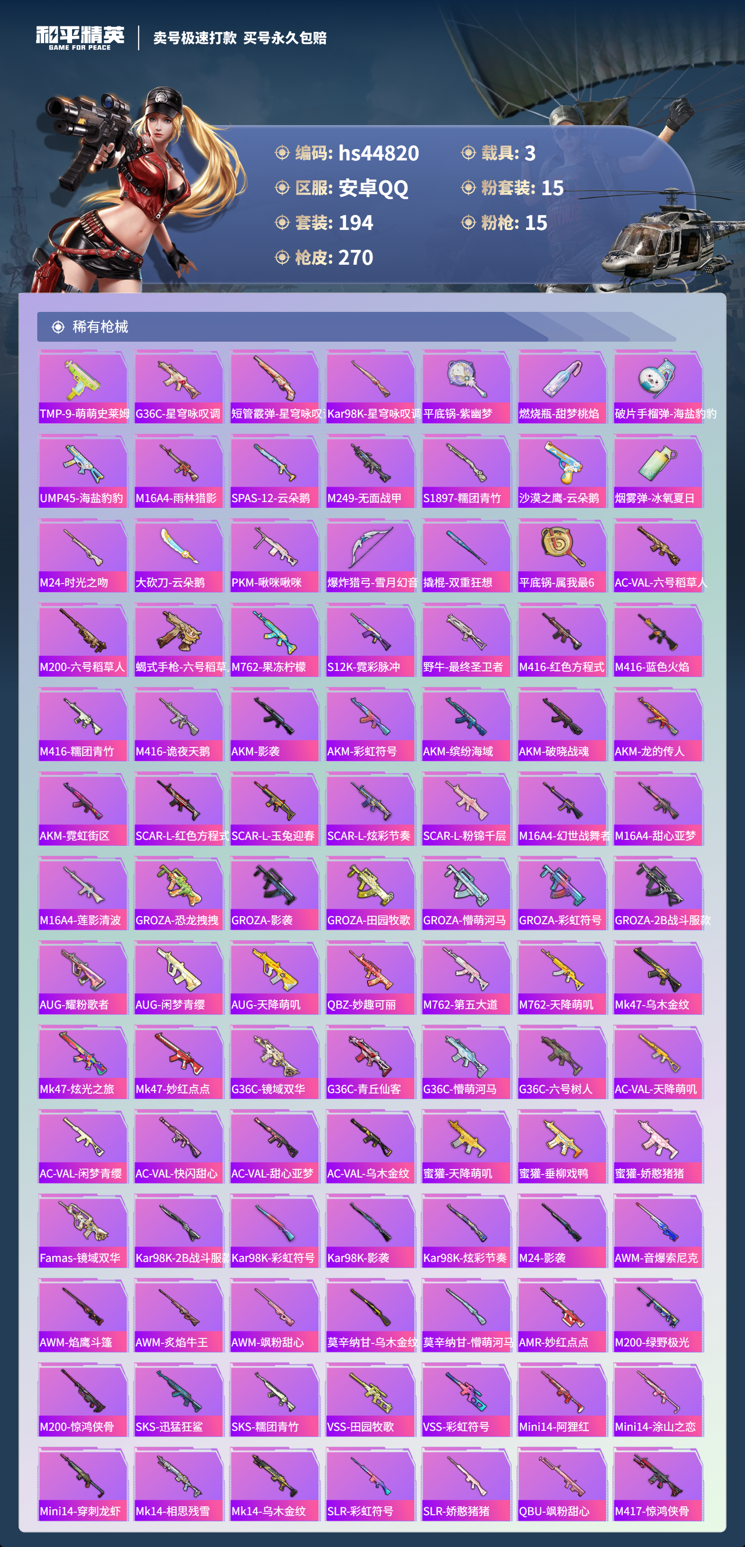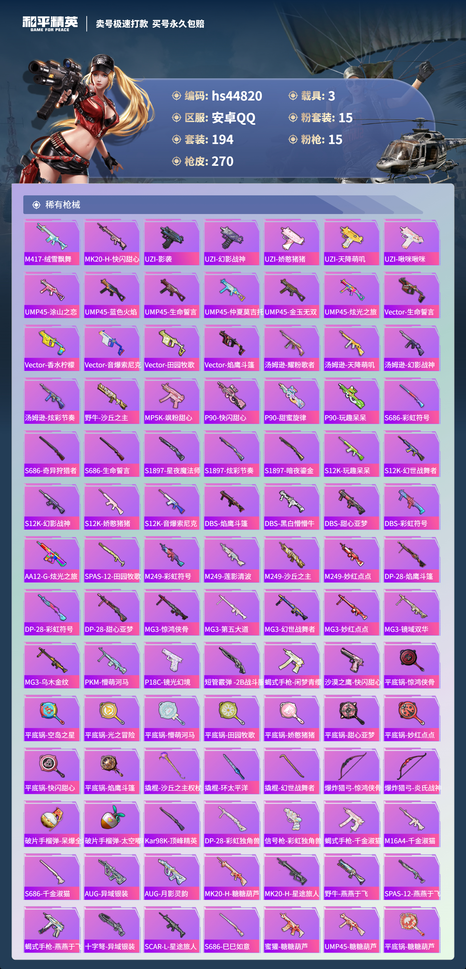 【11003630】【不可二次】【安卓QQ】龟仙人 S686-奇异狩猎者 漫步者 P90-沙丘之主 都市猎人 忍者信条 MK14-闲梦青缨 沙丘之主-图卡盟 缤纷油彩 深海小丑鱼 AMR-炫光之旅 浪漫天命 深海曼妙飞行器 MG3-梦幻舞会 合金龙骨绿色 迅捷狂鲨 AUG-超新星 龙翔九天飞行器 诡面顽熊 繁龙极客 M416-风花雪月 AKM-梦之光华 AKM-缤纷海域 SCAR-L-纯梦嫁纱