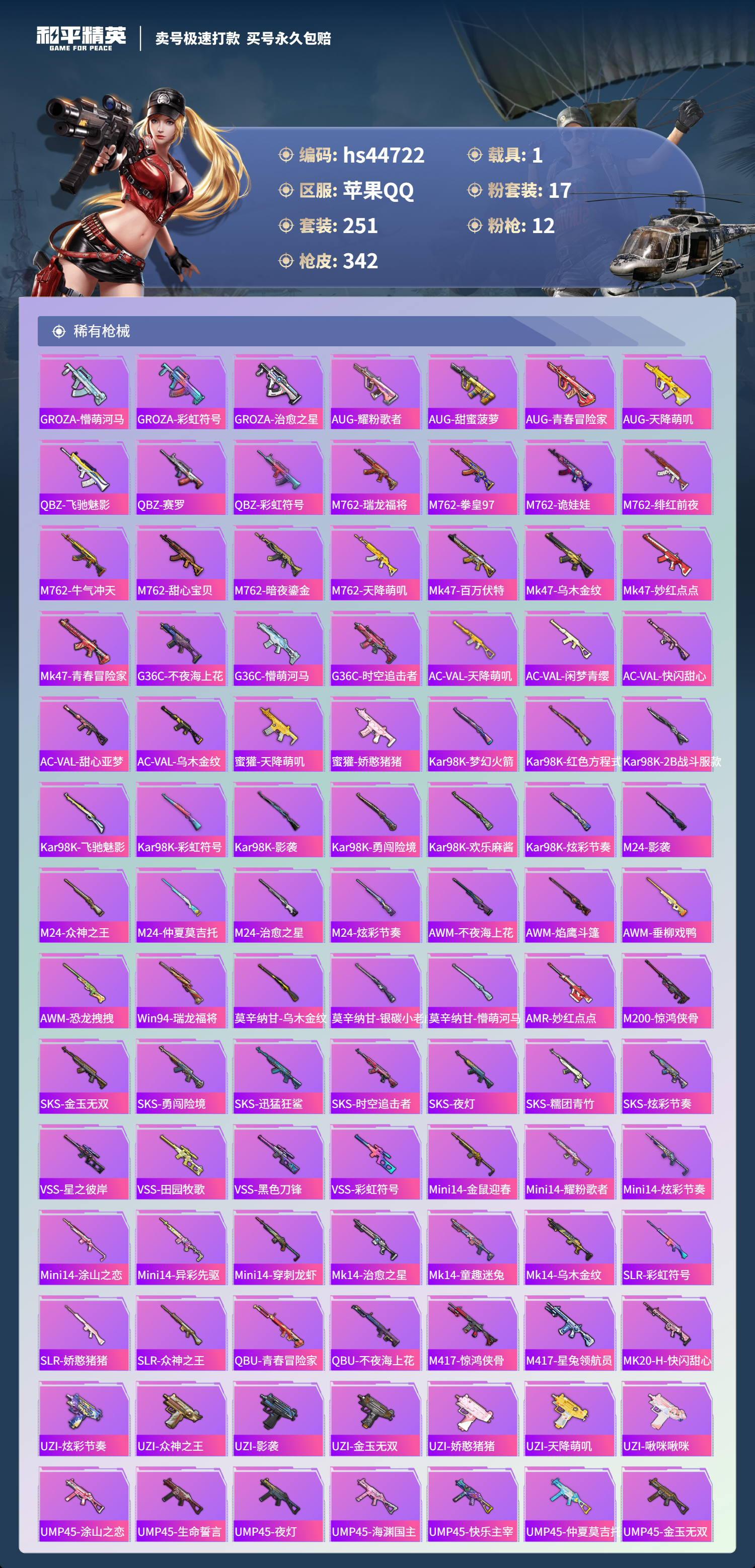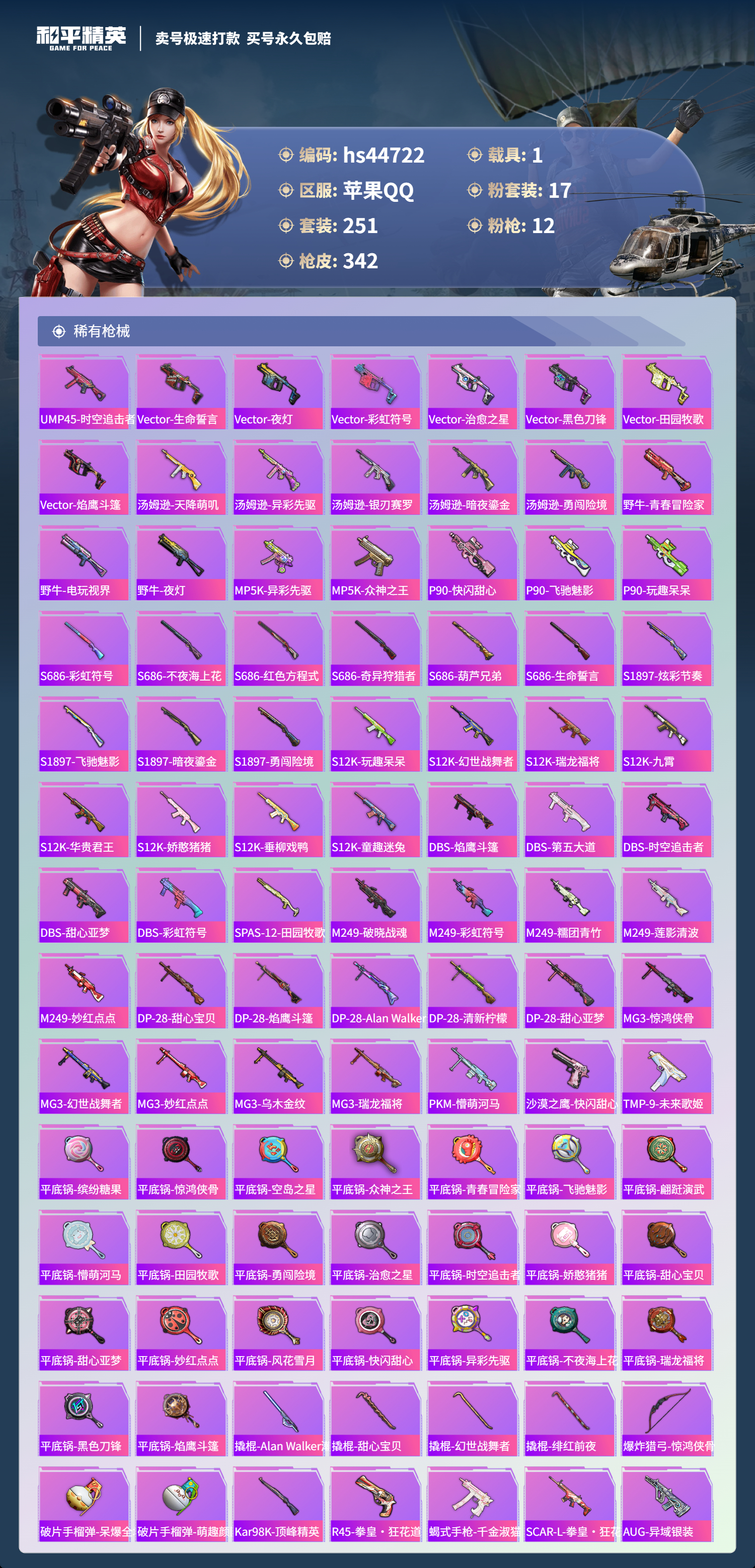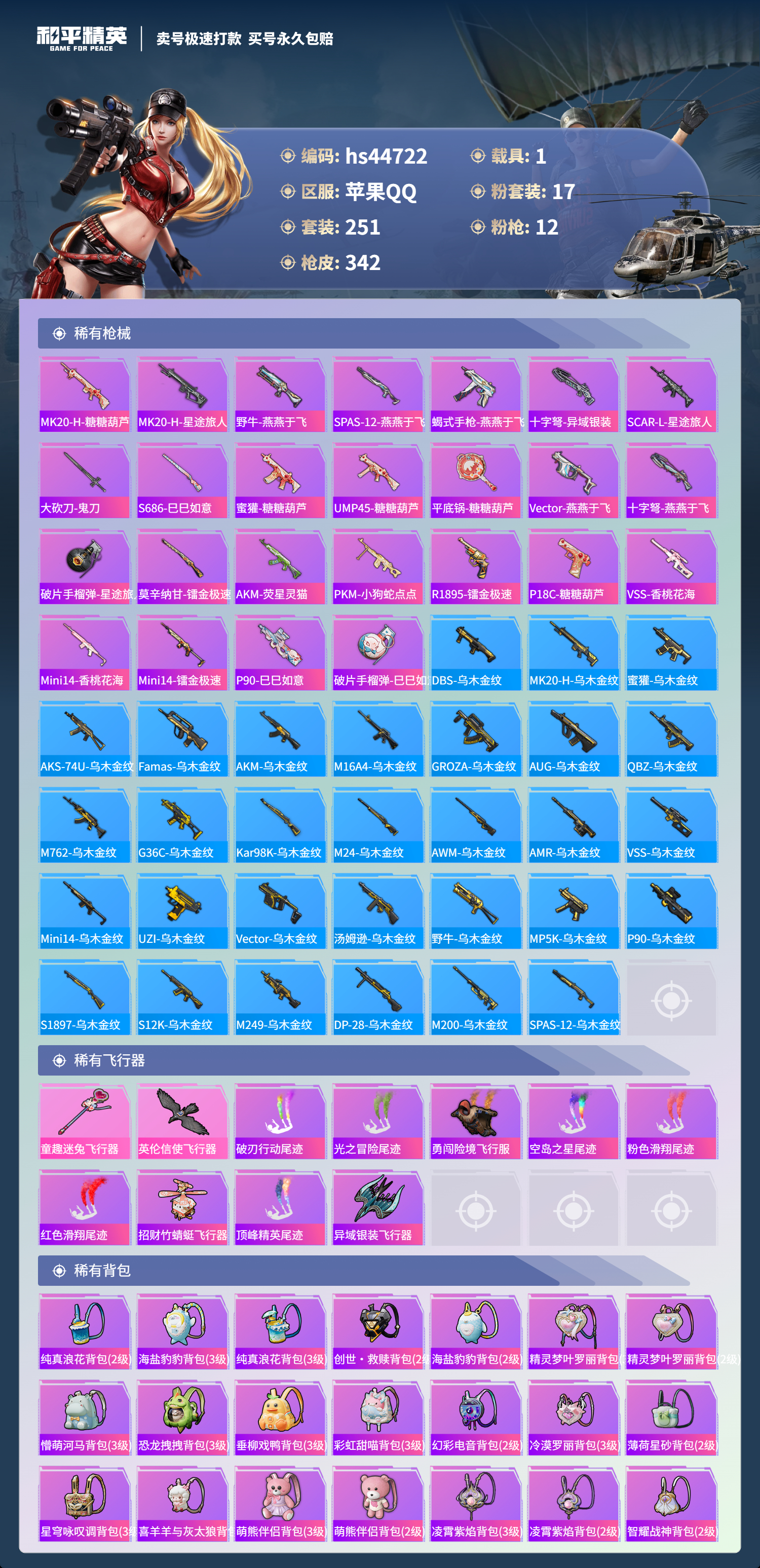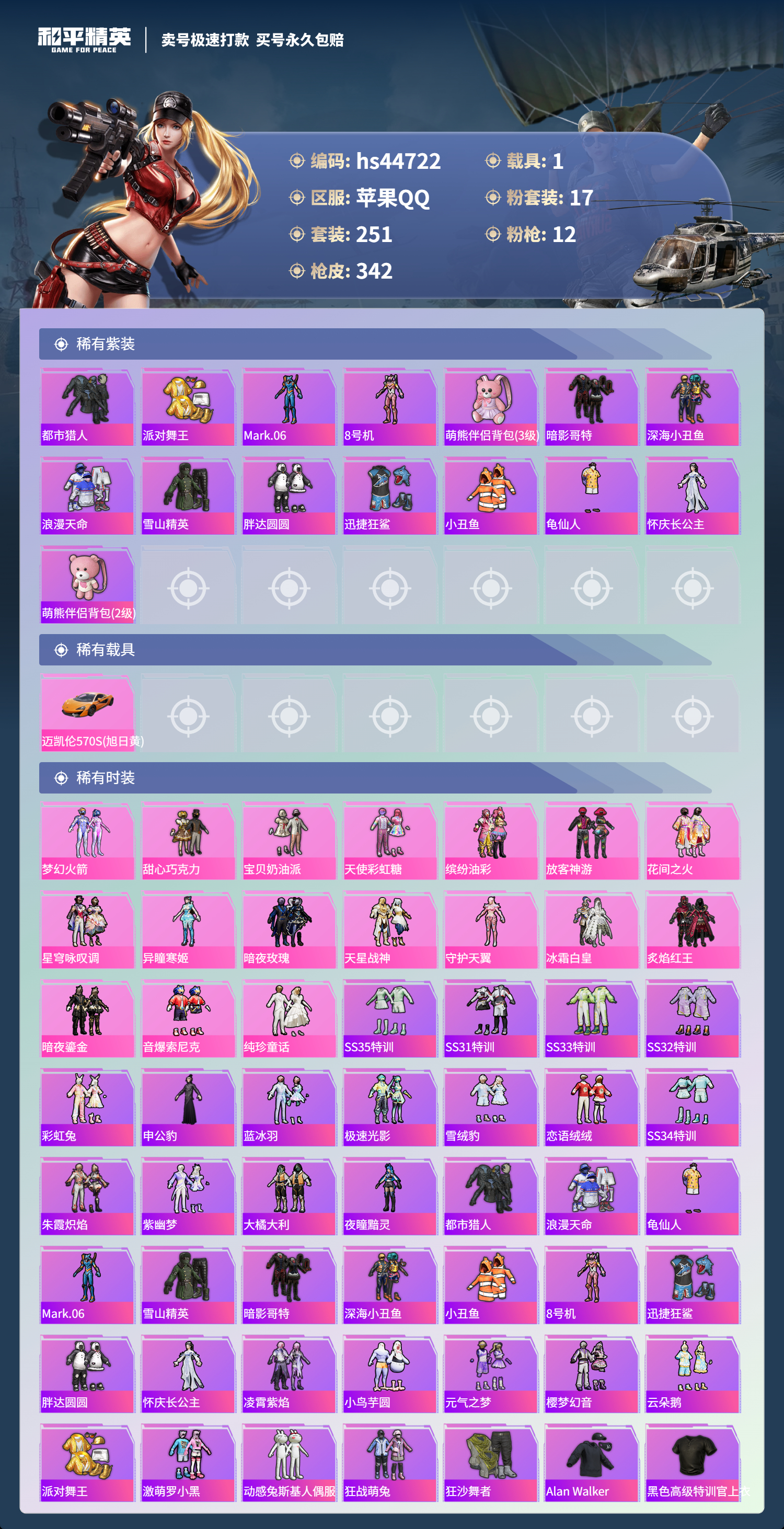 【11010138】【不可二次】【苹果QQ】龟仙人 水银刺客 迈凯伦570S 旭日黄 S686-奇异狩猎者 M762-青锋波束 M416-五爪金龙 漫步者 花间之火 都市猎人 炙焰红王 M416-电玩时刻 放客神游 野牛-青空秋雨 缤纷油彩 深海小丑鱼 瑞龙福将 童趣迷兔飞行器 浪漫天命 激萌罗小黑 纯白誓言 胖达圆圆 团圆交子 AKM-奇异狩猎者 软萌银虎 S12K-海渊国主 迅捷狂鲨 M76
