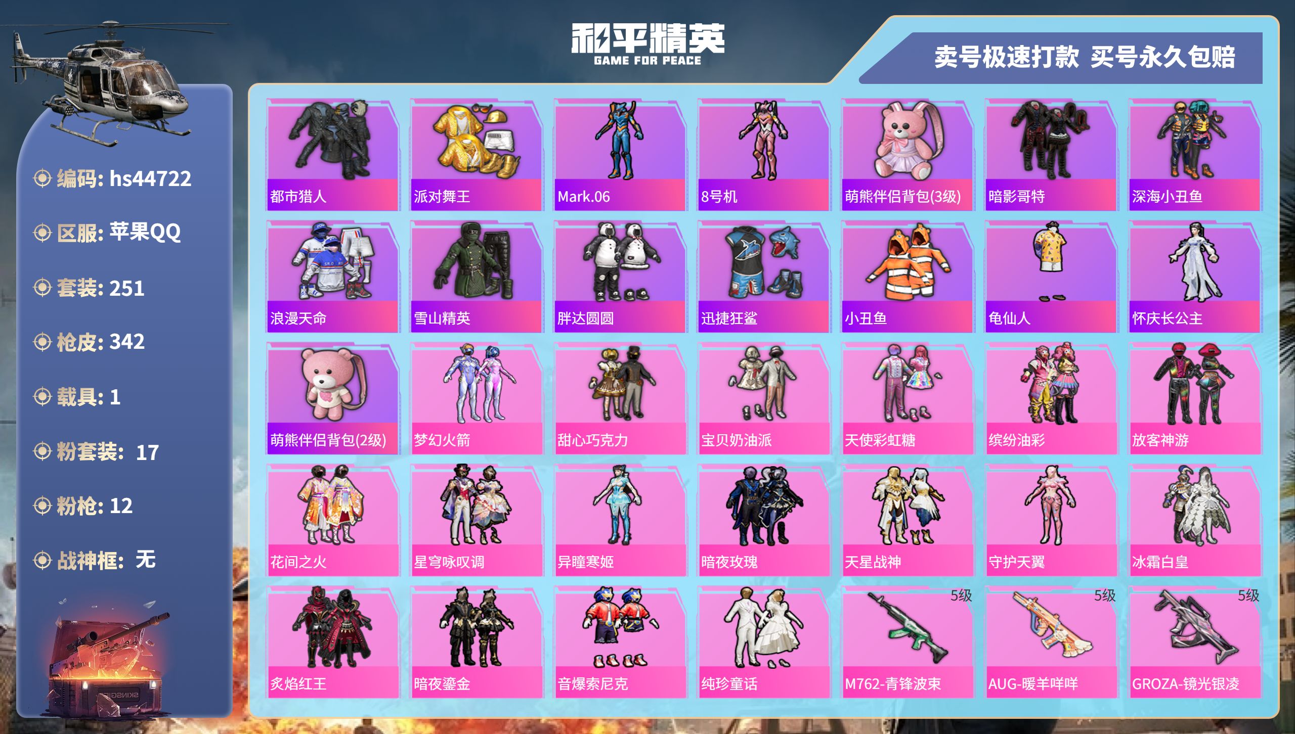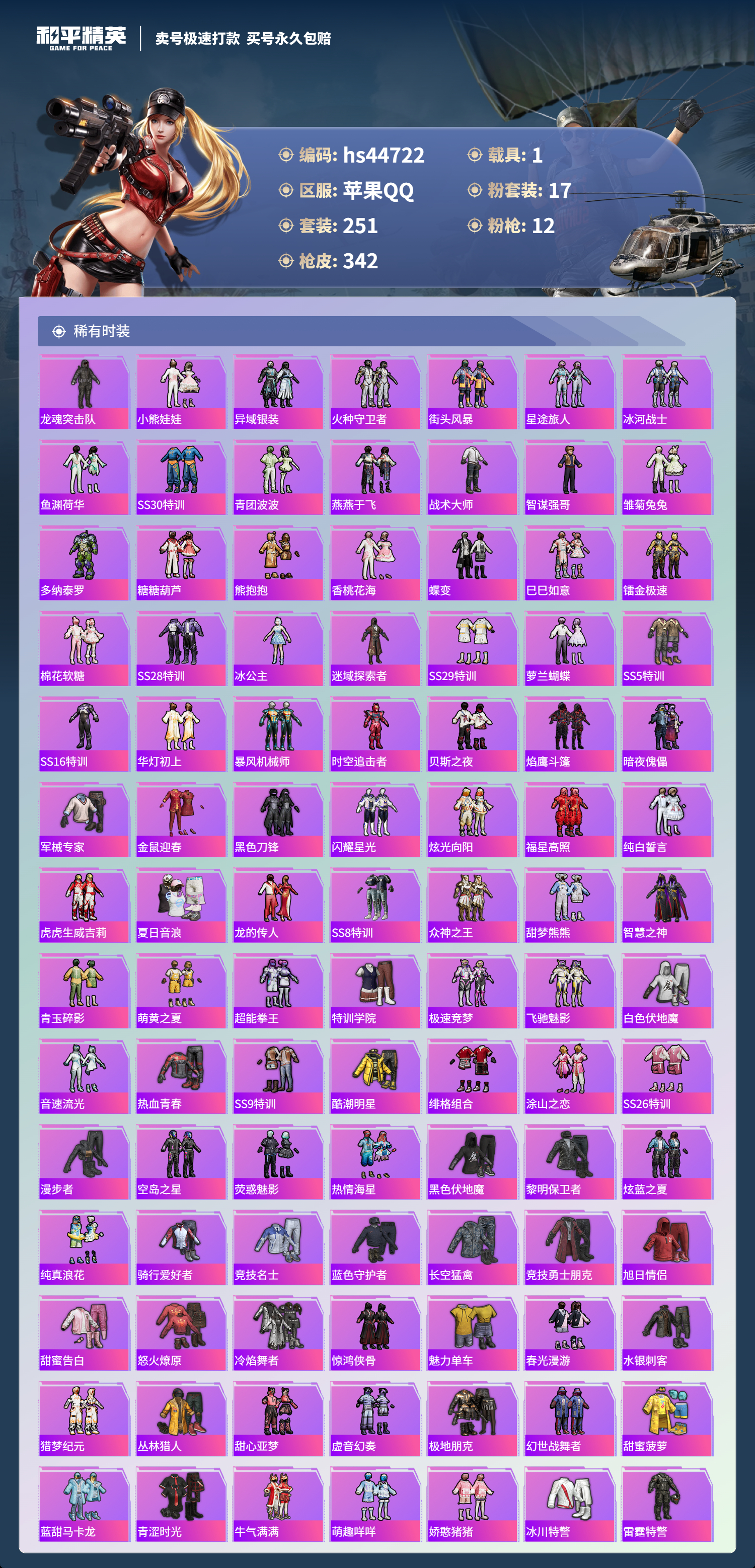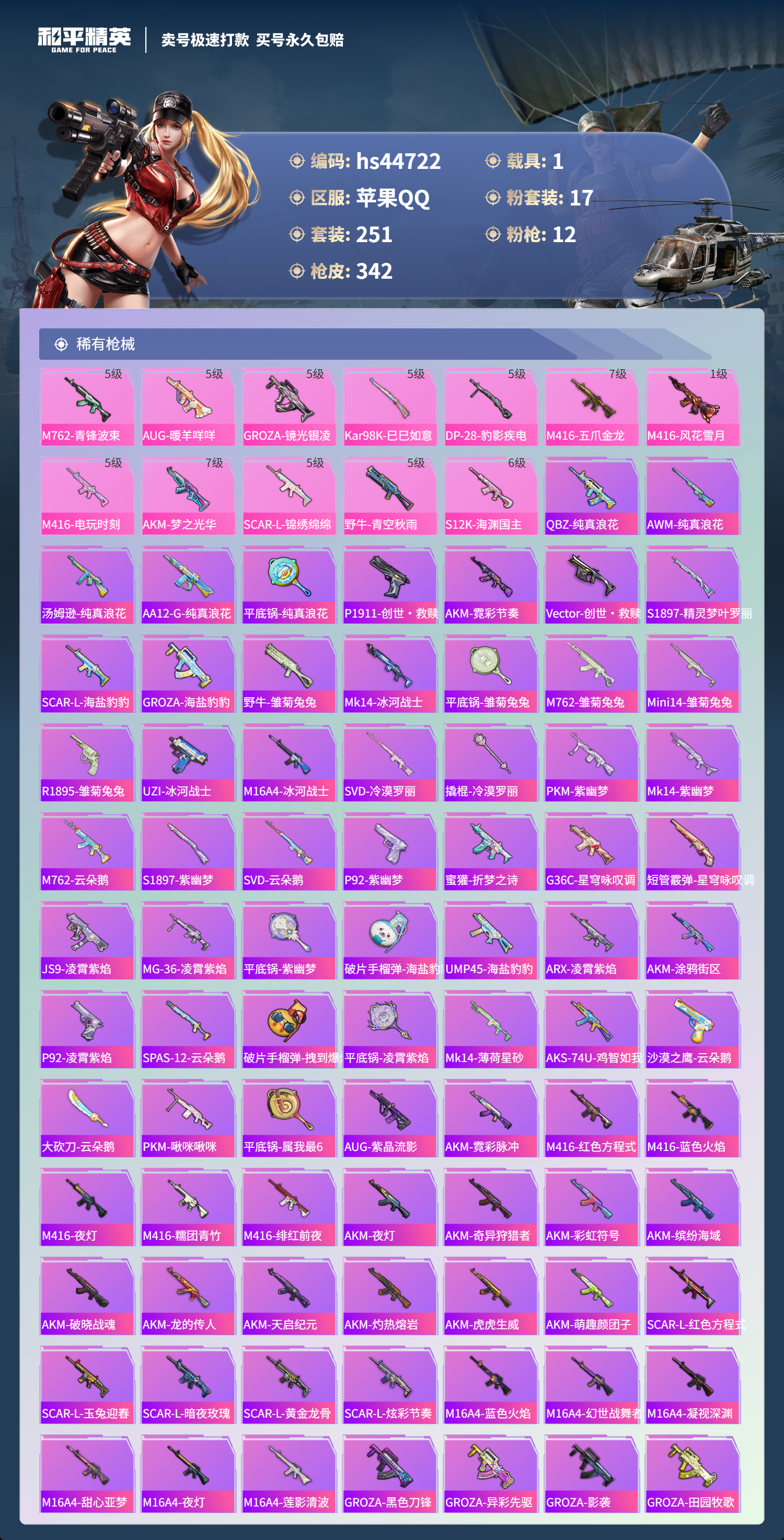 【11010138】【不可二次】【苹果QQ】龟仙人 水银刺客 迈凯伦570S 旭日黄 S686-奇异狩猎者 M762-青锋波束 M416-五爪金龙 漫步者 花间之火 都市猎人 炙焰红王 M416-电玩时刻 放客神游 野牛-青空秋雨 缤纷油彩 深海小丑鱼 瑞龙福将 童趣迷兔飞行器 浪漫天命 激萌罗小黑 纯白誓言 胖达圆圆 团圆交子 AKM-奇异狩猎者 软萌银虎 S12K-海渊国主 迅捷狂鲨 M76