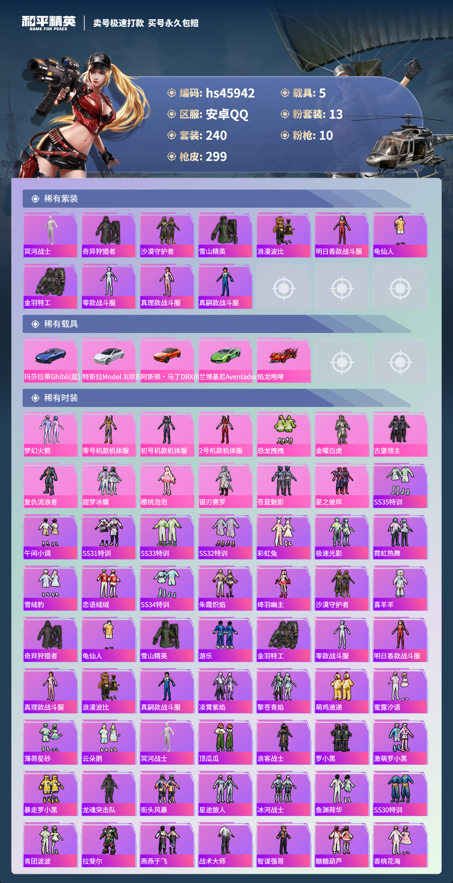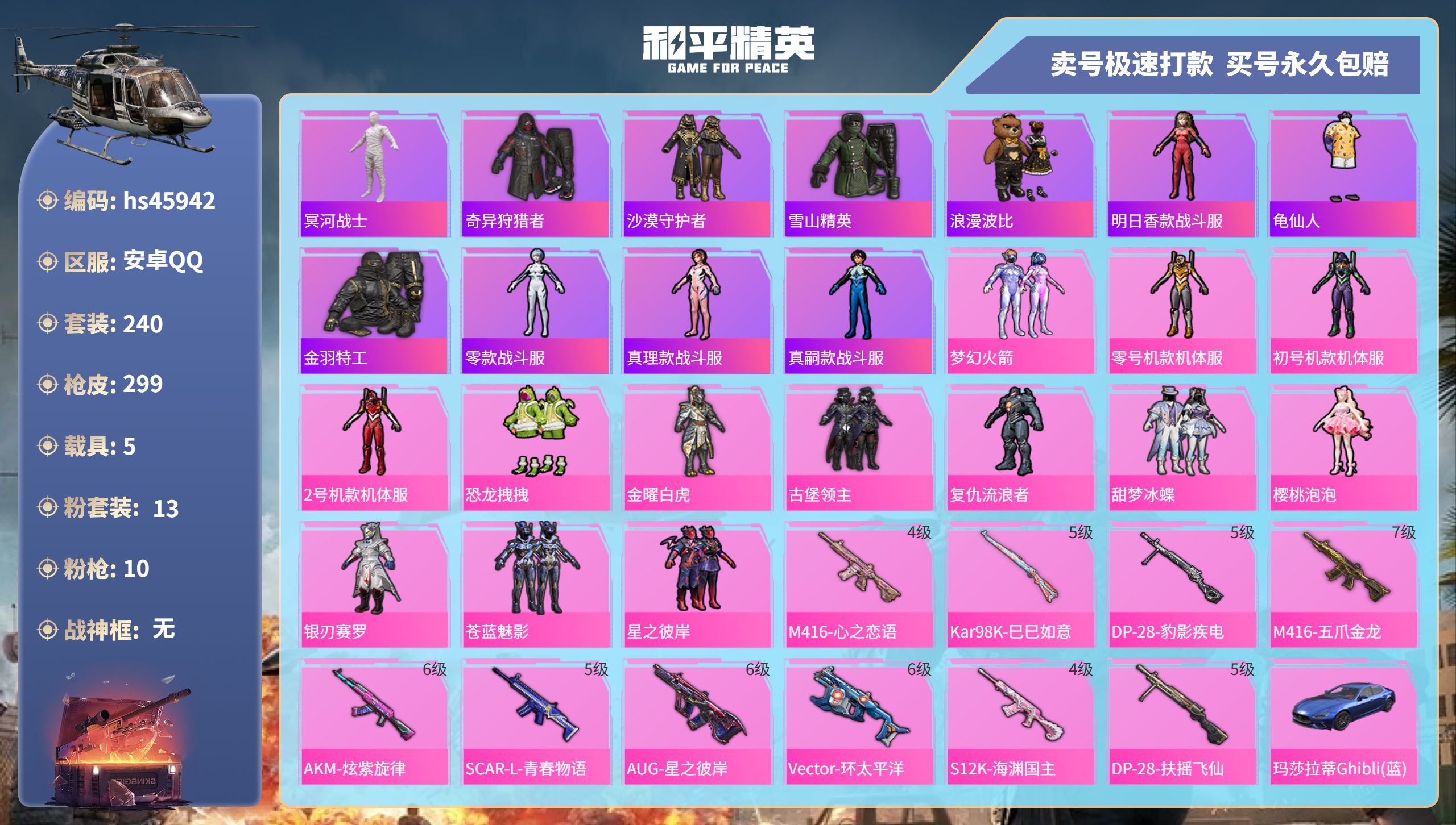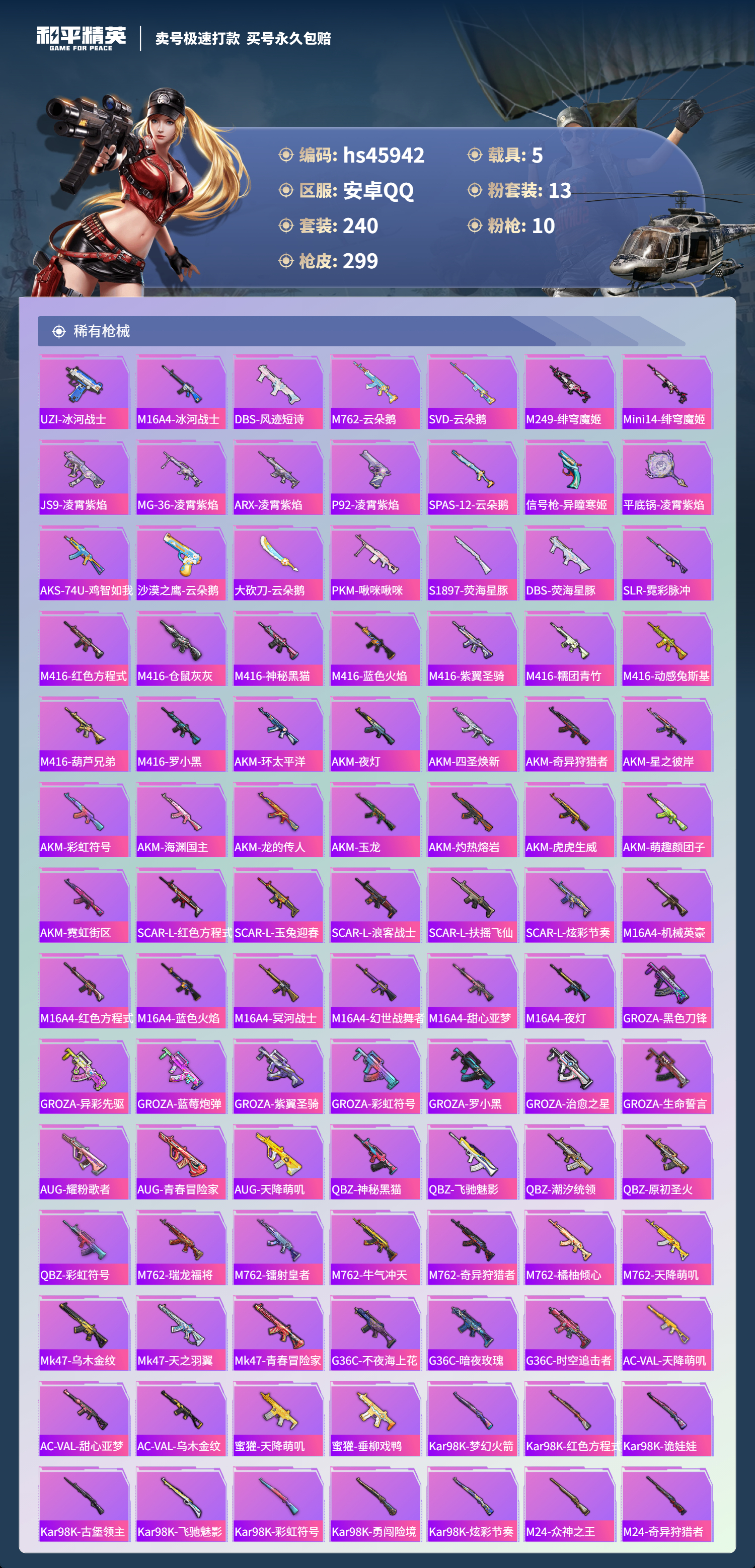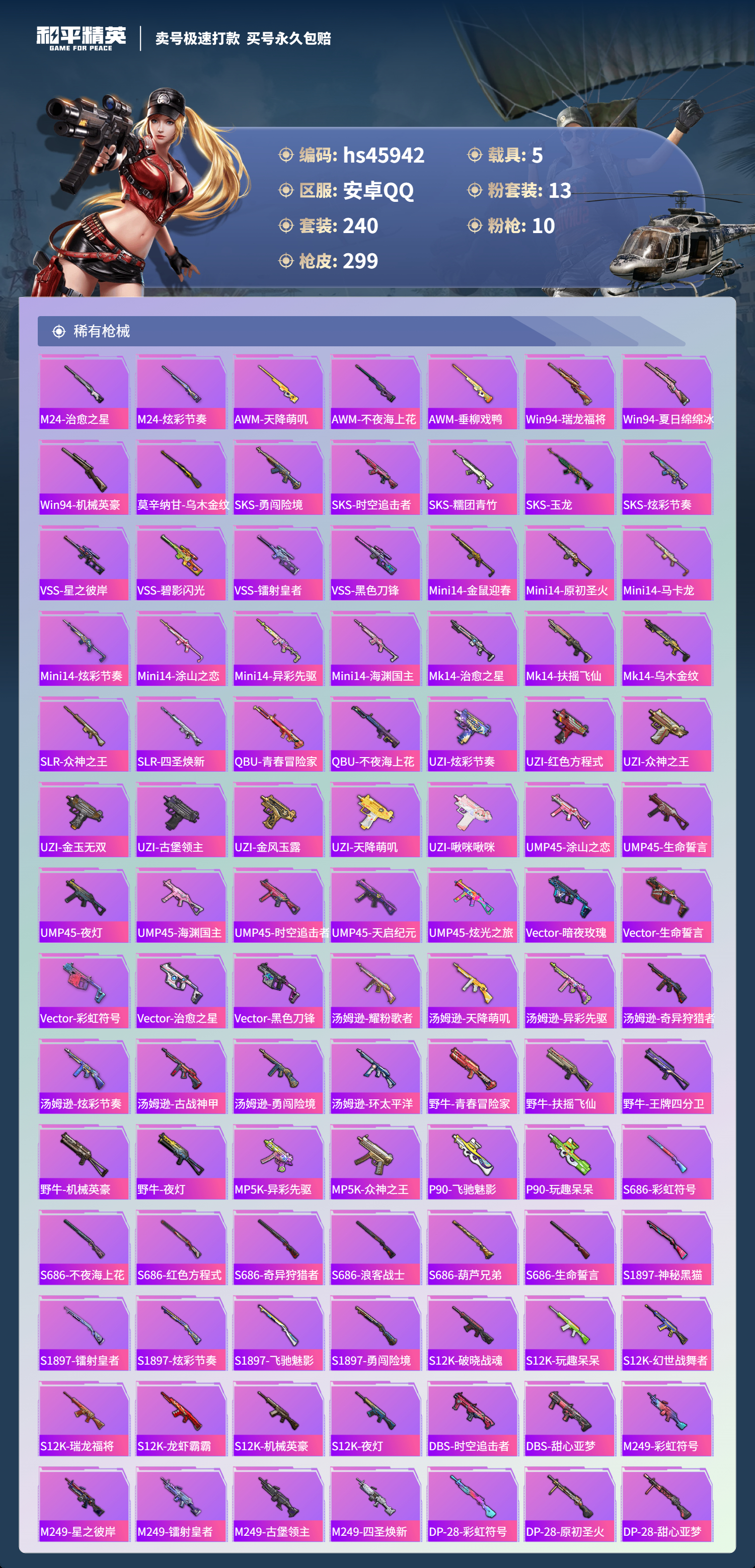 【11012042】【不可二次】【安卓QQ】龟仙人 恐龙拽拽 焰龙咆哮 金曜白虎 苍蓝魅影 M249-古堡领主 豚鼠丹丹 梦起落英 M762-奇异狩猎者 银刃赛罗 M416-仓鼠灰灰 M416-心之恋语 黄螳螂 浪漫波比 影双刃 AUG-星之彼岸 醒狮腾龙 甜梦冰蝶 纯白誓言 AKM-奇异狩猎者 兰博SVJ绿色 SS1特训 特斯拉3白色 S12K-海渊国主 M762-瑞龙福将 黑色刀锋 Vect