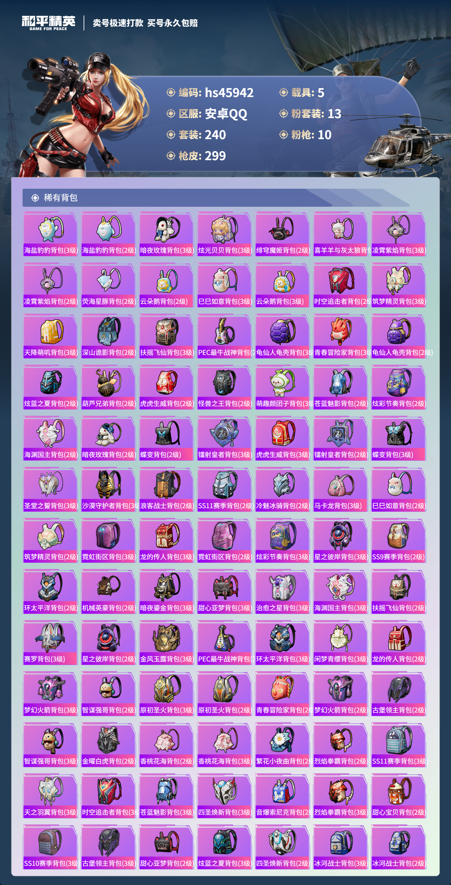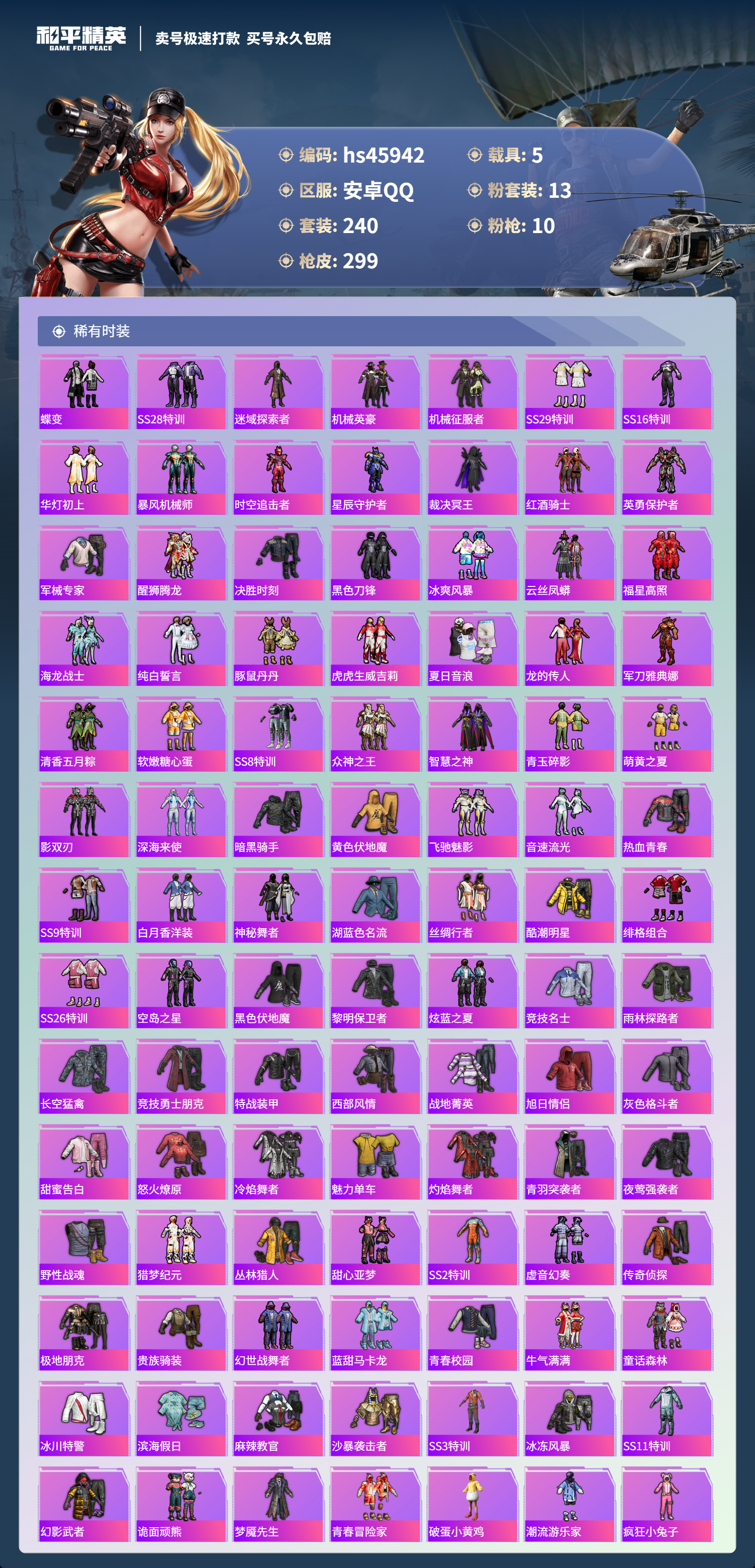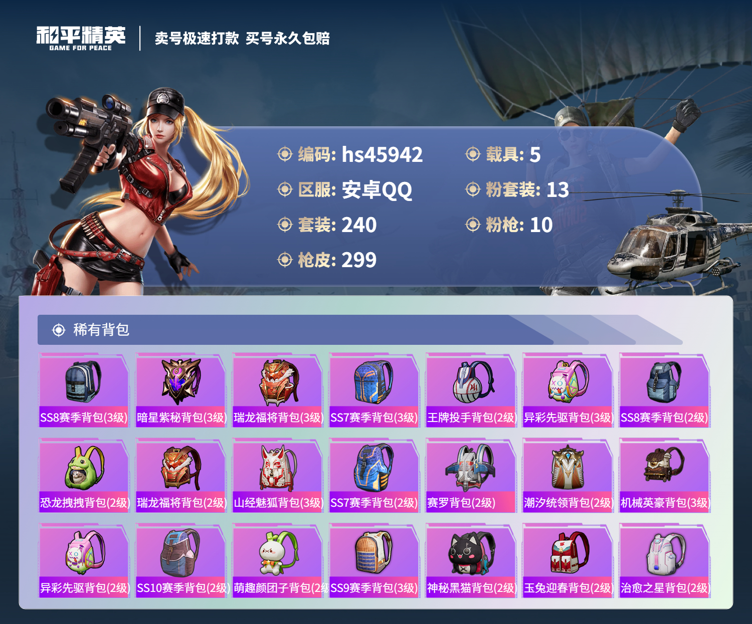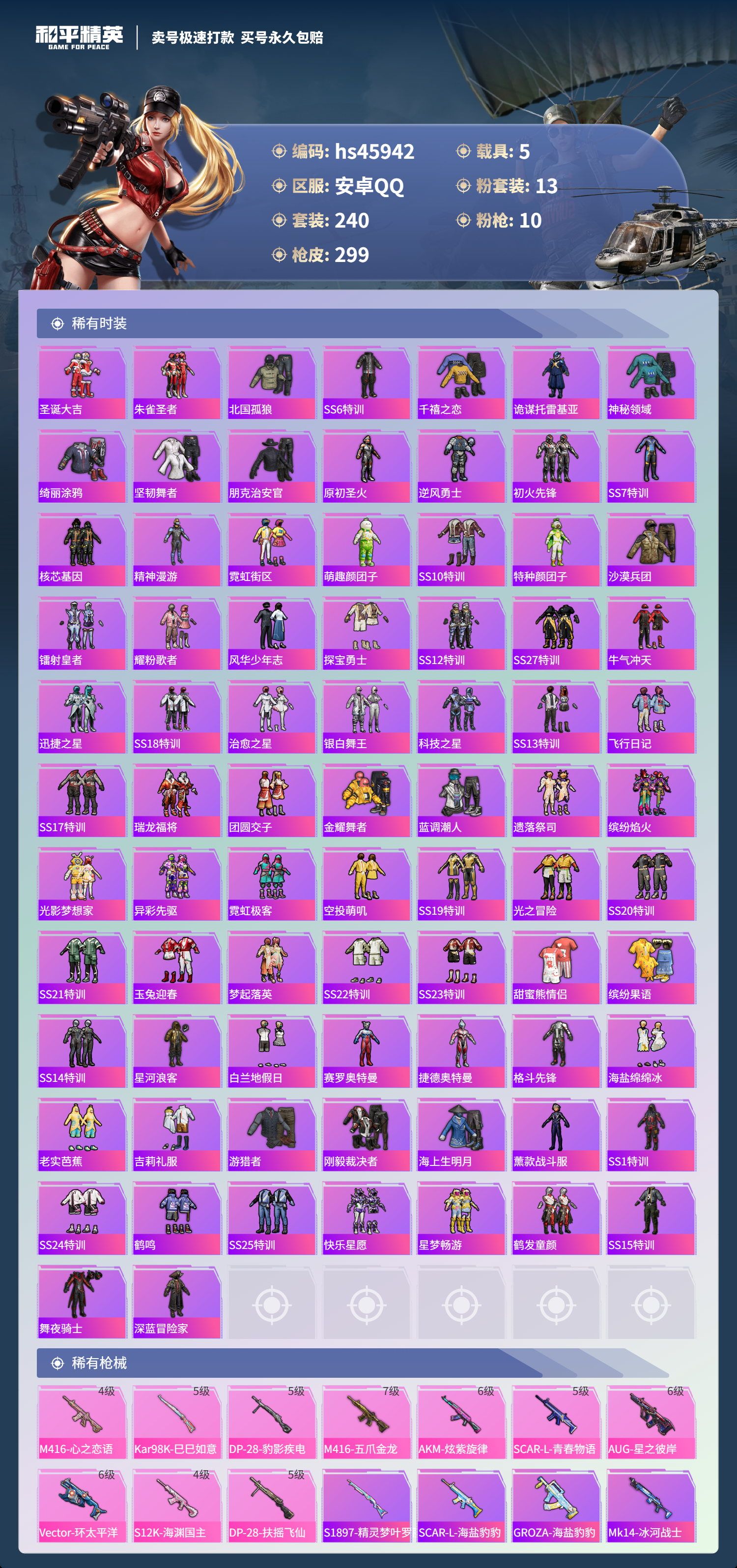 【11012042】【不可二次】【安卓QQ】龟仙人 恐龙拽拽 焰龙咆哮 金曜白虎 苍蓝魅影 M249-古堡领主 豚鼠丹丹 梦起落英 M762-奇异狩猎者 银刃赛罗 M416-仓鼠灰灰 M416-心之恋语 黄螳螂 浪漫波比 影双刃 AUG-星之彼岸 醒狮腾龙 甜梦冰蝶 纯白誓言 AKM-奇异狩猎者 兰博SVJ绿色 SS1特训 特斯拉3白色 S12K-海渊国主 M762-瑞龙福将 黑色刀锋 Vect