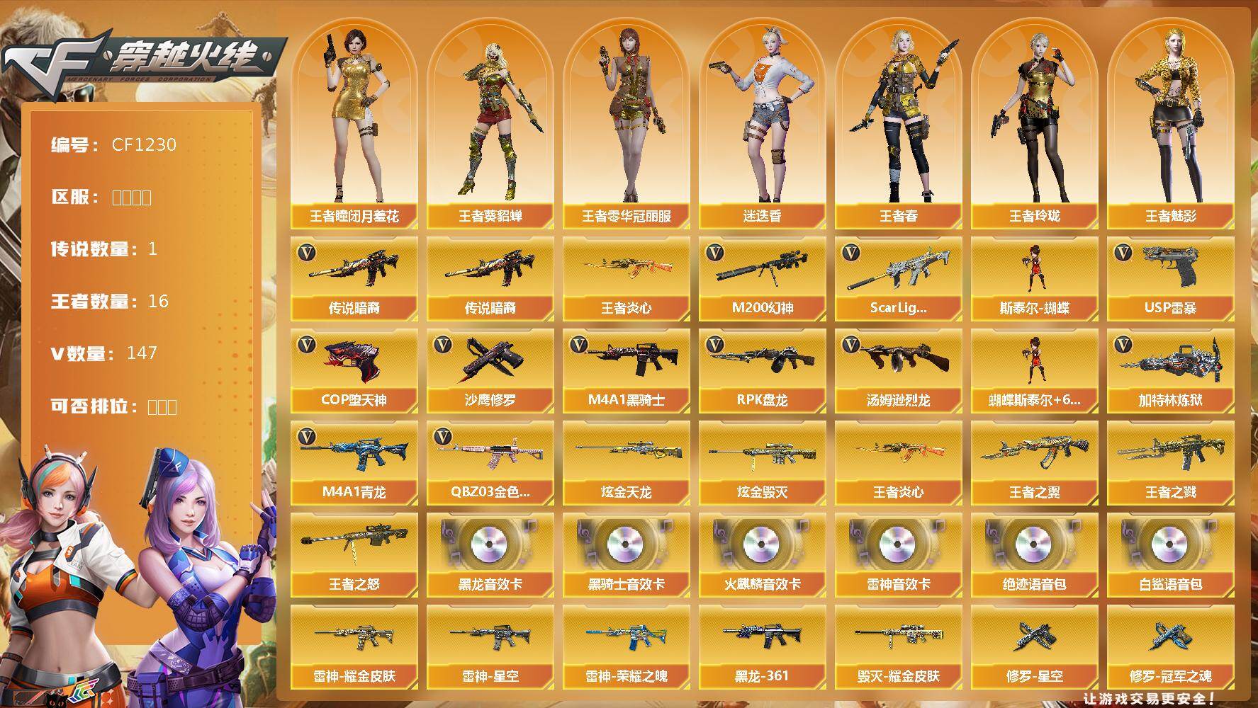 【11014343】【11014343】【CF1230】【商品标题】:【极品账号/【6烈龙】【斯泰尔-蝴蝶】【传说暗裔】【M200-幻神】【王者幻神-觉醒版】