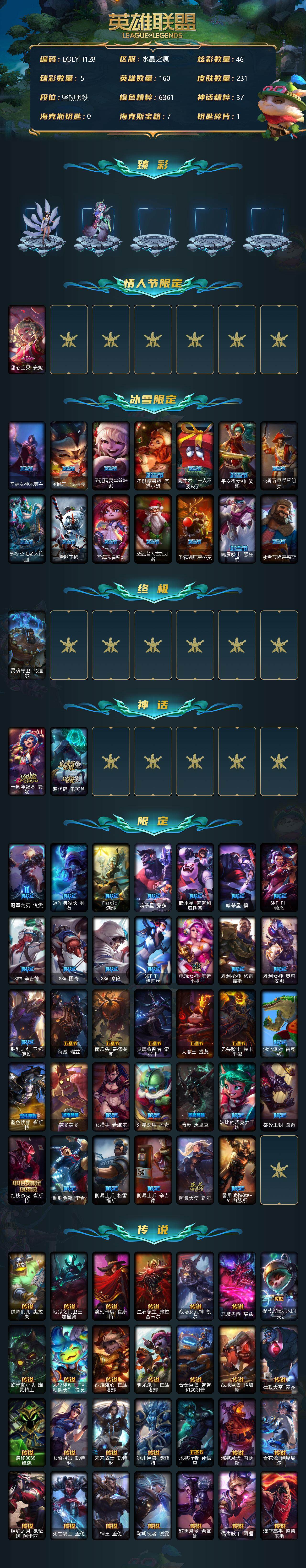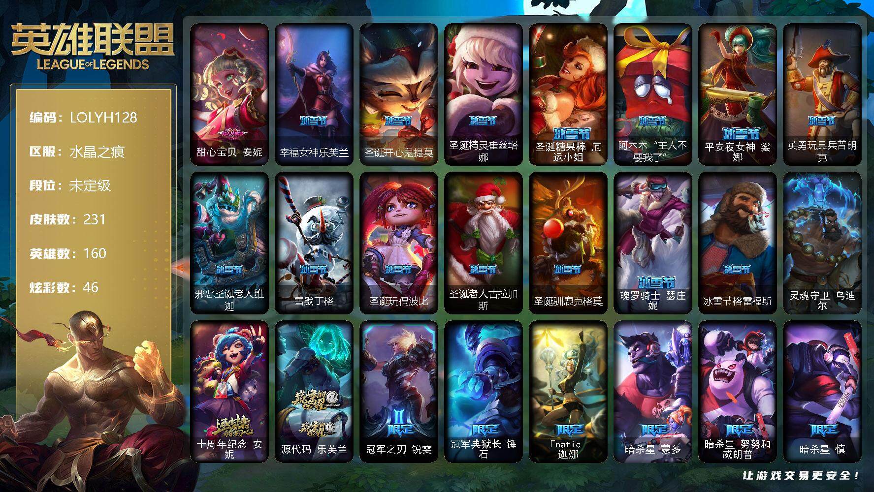 【11018370】【LOLYH128】160英雄/231皮肤/1终极/2神话/49限定/5臻彩/46炫彩/32传说/51史诗/未定级账号等级:304/冠军之刃锐雯2016凯旋圣装/偶像歌手阿狸极地雪莲/魔女阿卡丽虚荣/净雪之月莫甘娜冬虹/红莲之刃锐雯/甜心宝贝安妮/幸福女神乐芙兰/圣诞开心鬼提莫/圣诞精灵崔丝塔娜/圣诞糖果棒厄运小姐/阿木木:“主人不要我了”/平安夜女神娑娜/英勇玩具兵普朗克/