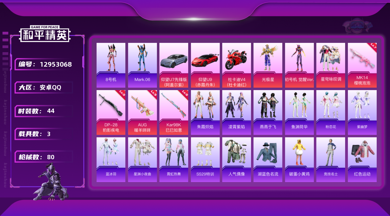 【11022393】[12953068]素材身法号【特价急出/详情看图】:安卓 手Q-3粉装-4特效枪-3载具-2.6w热力值-3王牌印记-44套装-80枪皮【热门品类】:角色-8号机,角色-Mark.06【粉色载具】:仰望U9(赤霞丹朱),仰望U7(阿盖尔紫),杜卡迪 Panigale V4(杜卡迪红)【粉色套装】:角色-光极星,角色-初号机 觉醒Ver.,粉装-星穹咏叹调【粉色枪皮等级】:A