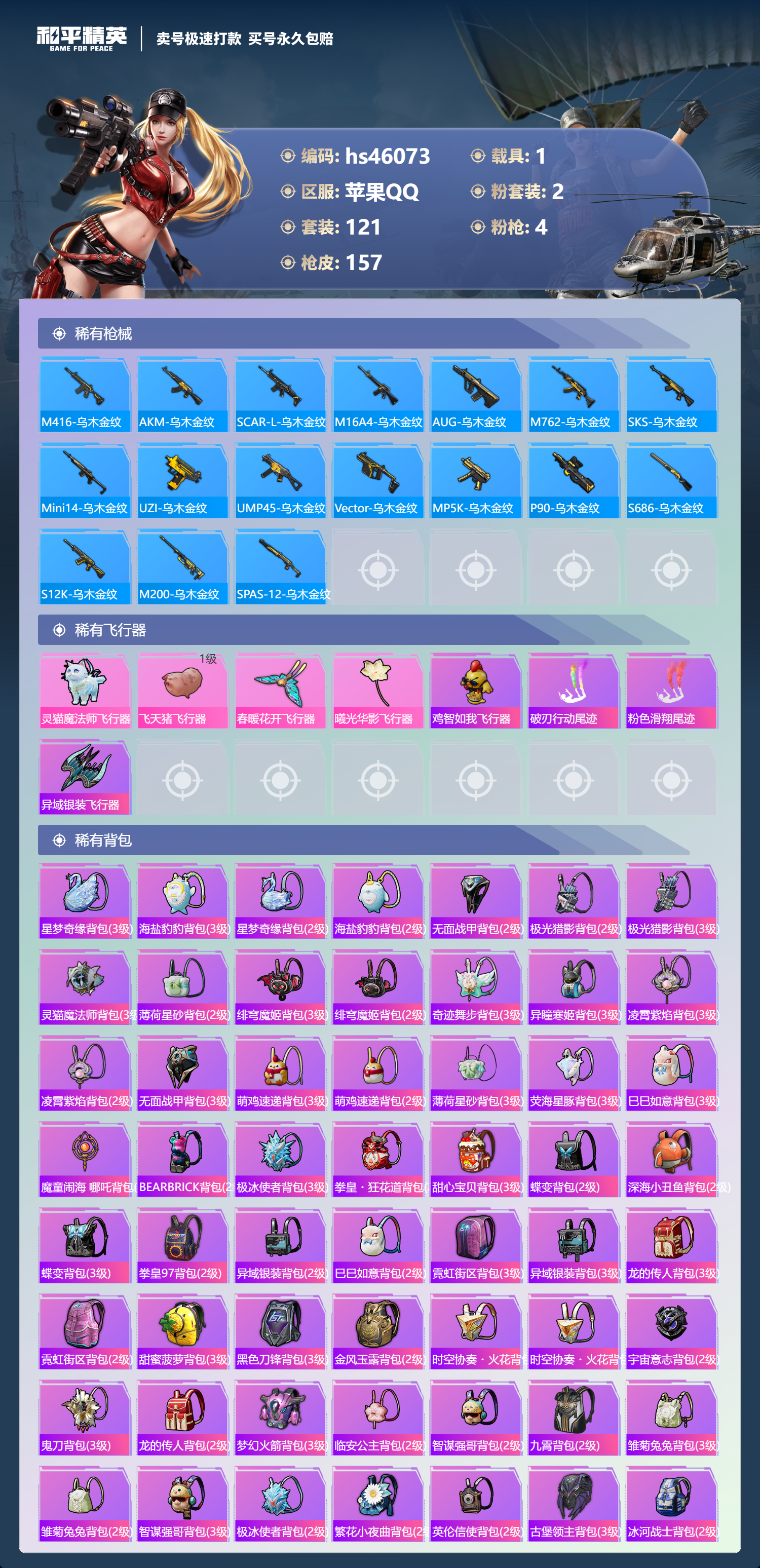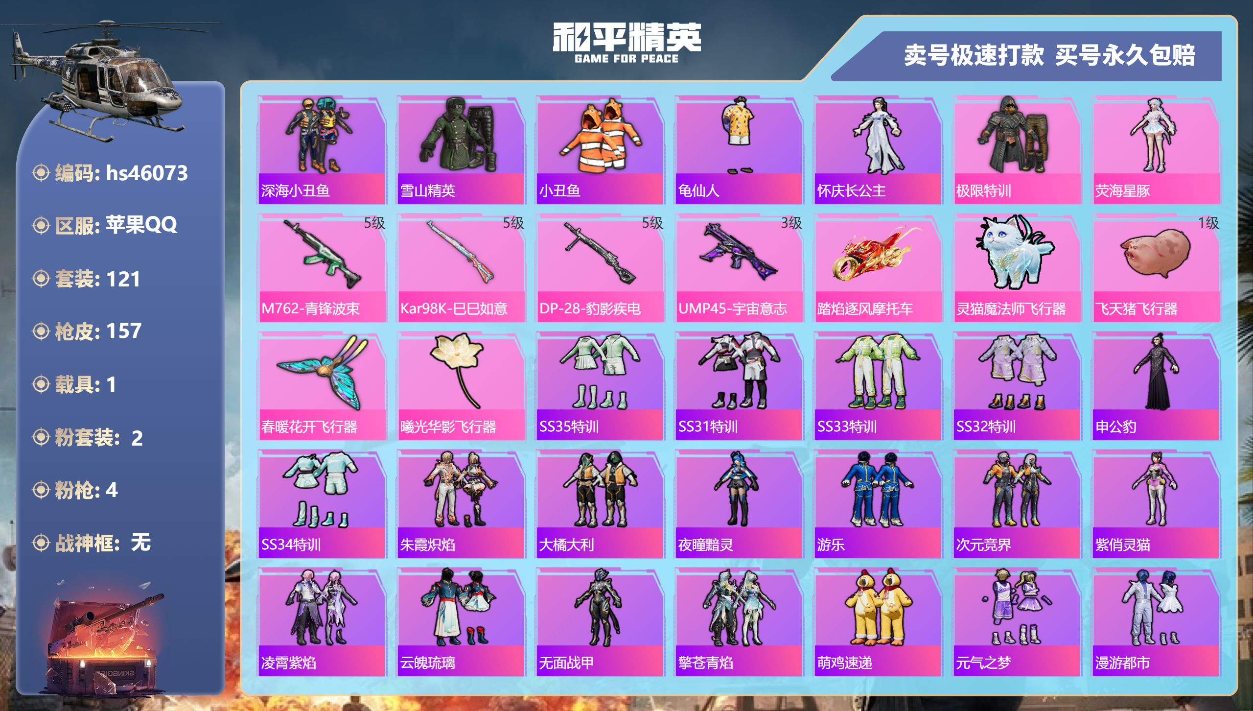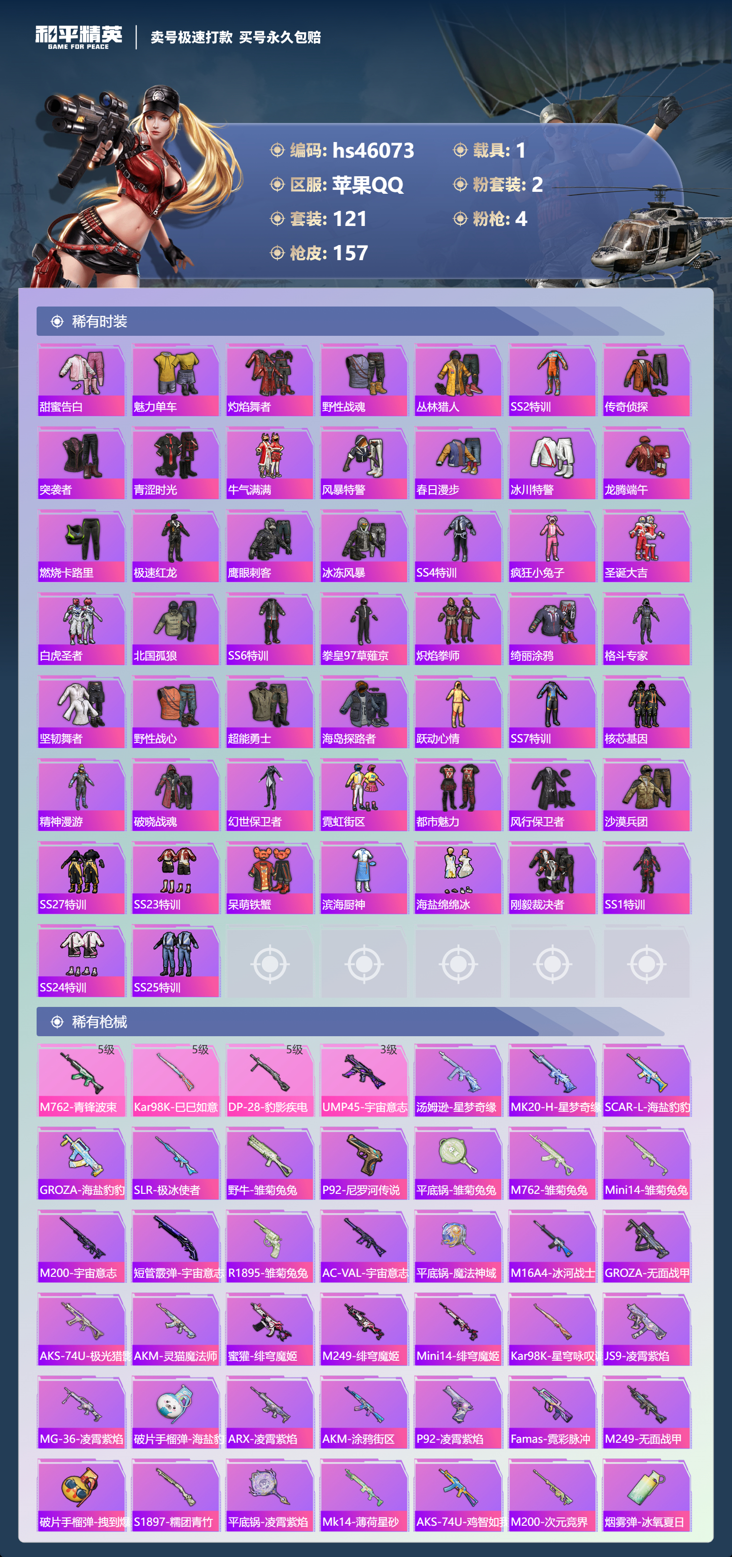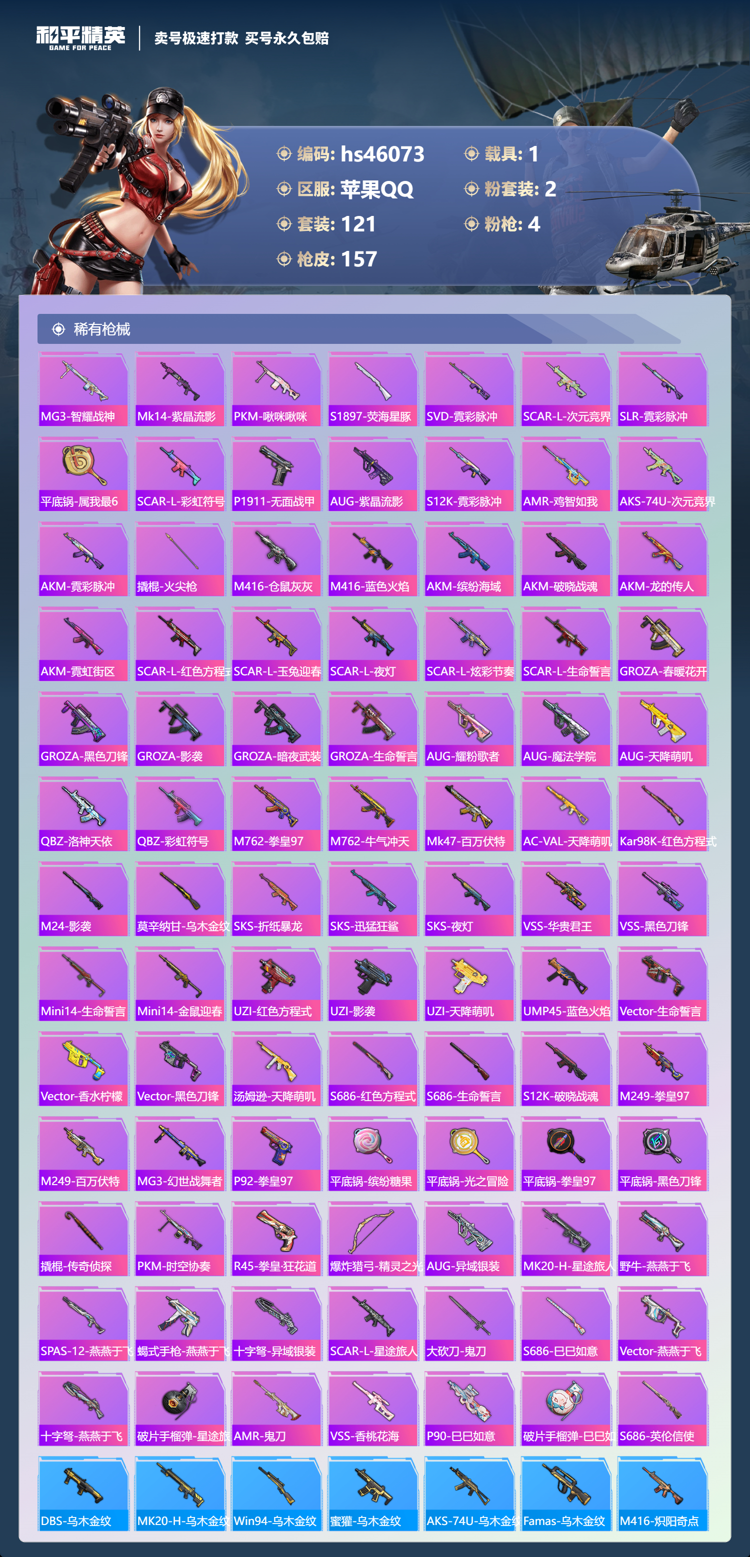 【11026144】【可二次】【苹果QQ】龟仙人 SS1特训 M762-青锋波束 黑色刀锋 UMP45-宇宙意志 极限特训 极速红龙 春暖花开飞行器 M416-仓鼠灰灰 AKM-缤纷海域 AUG-魔法学院 深海小丑鱼 雪山精英