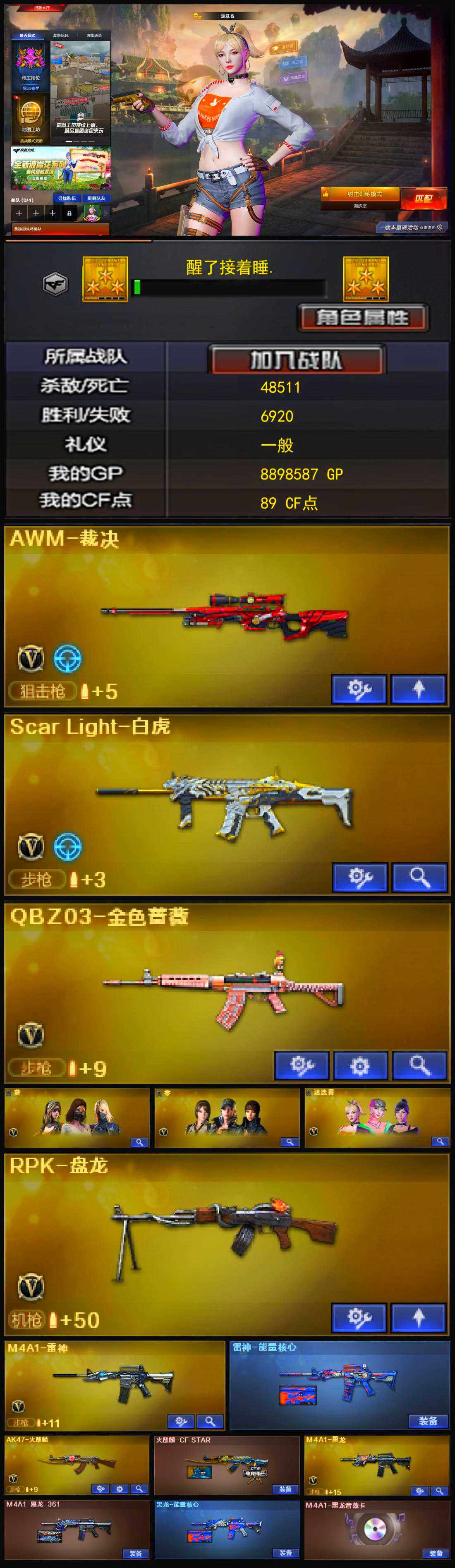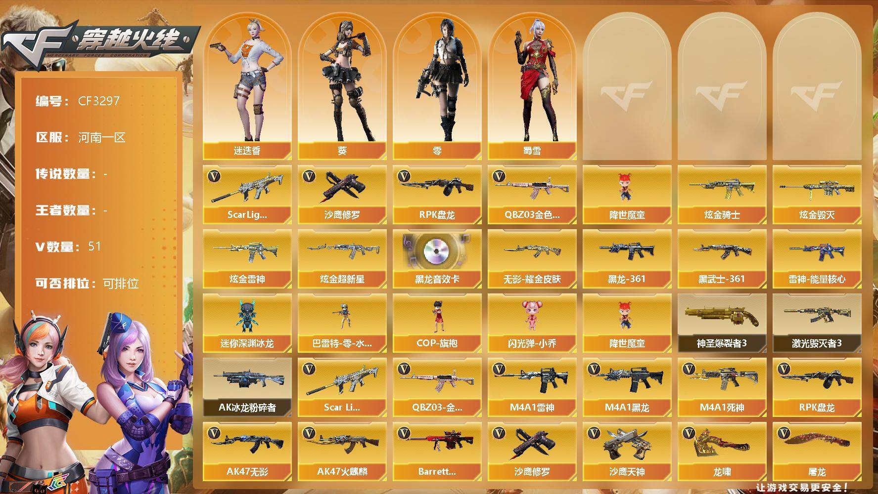 【11032108】【11032108】[13006972]河南一区-51V-0王者-4炫金【AWM-裁决】【Scar Light-白虎】【QBZ03-金色蔷