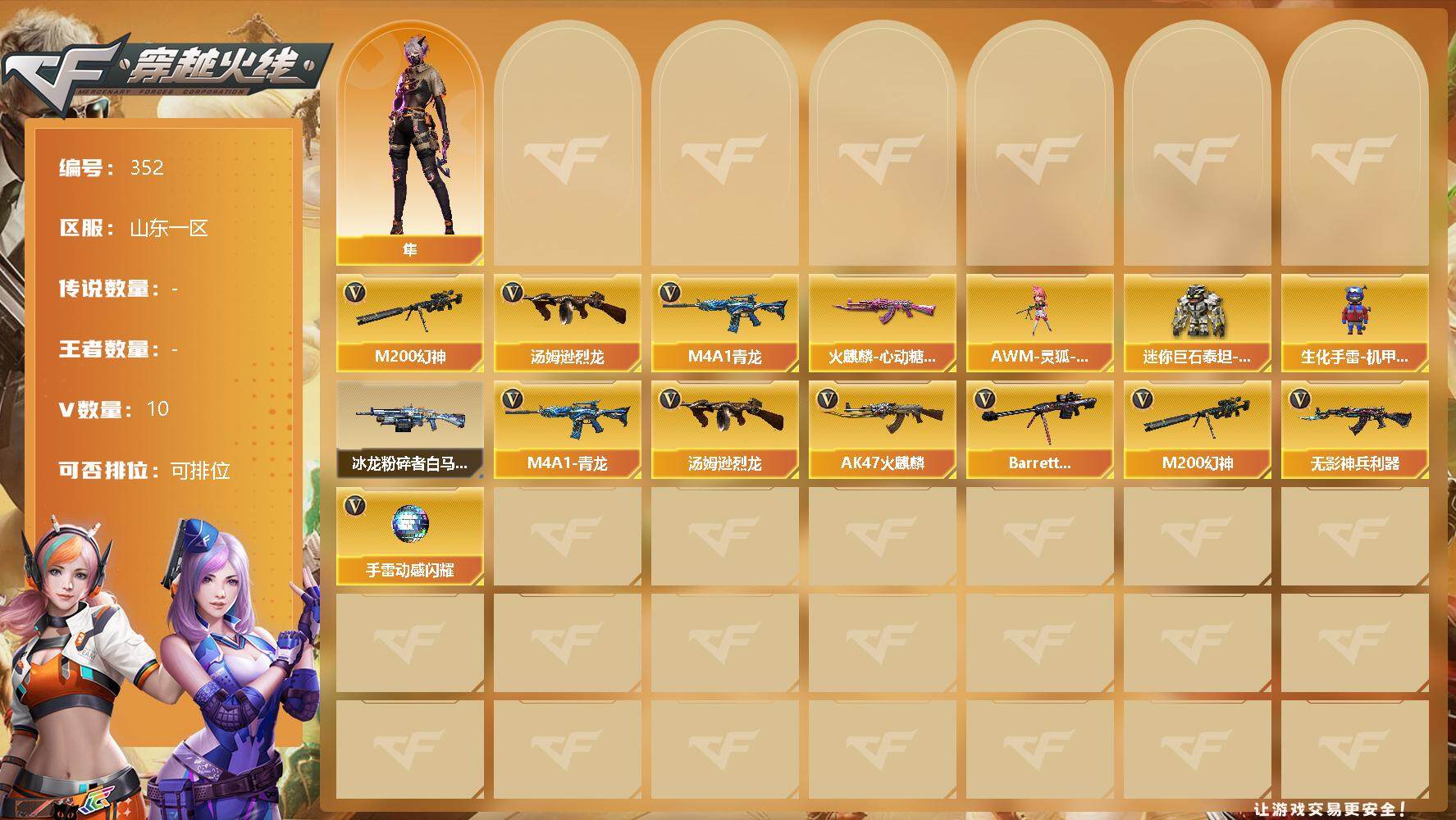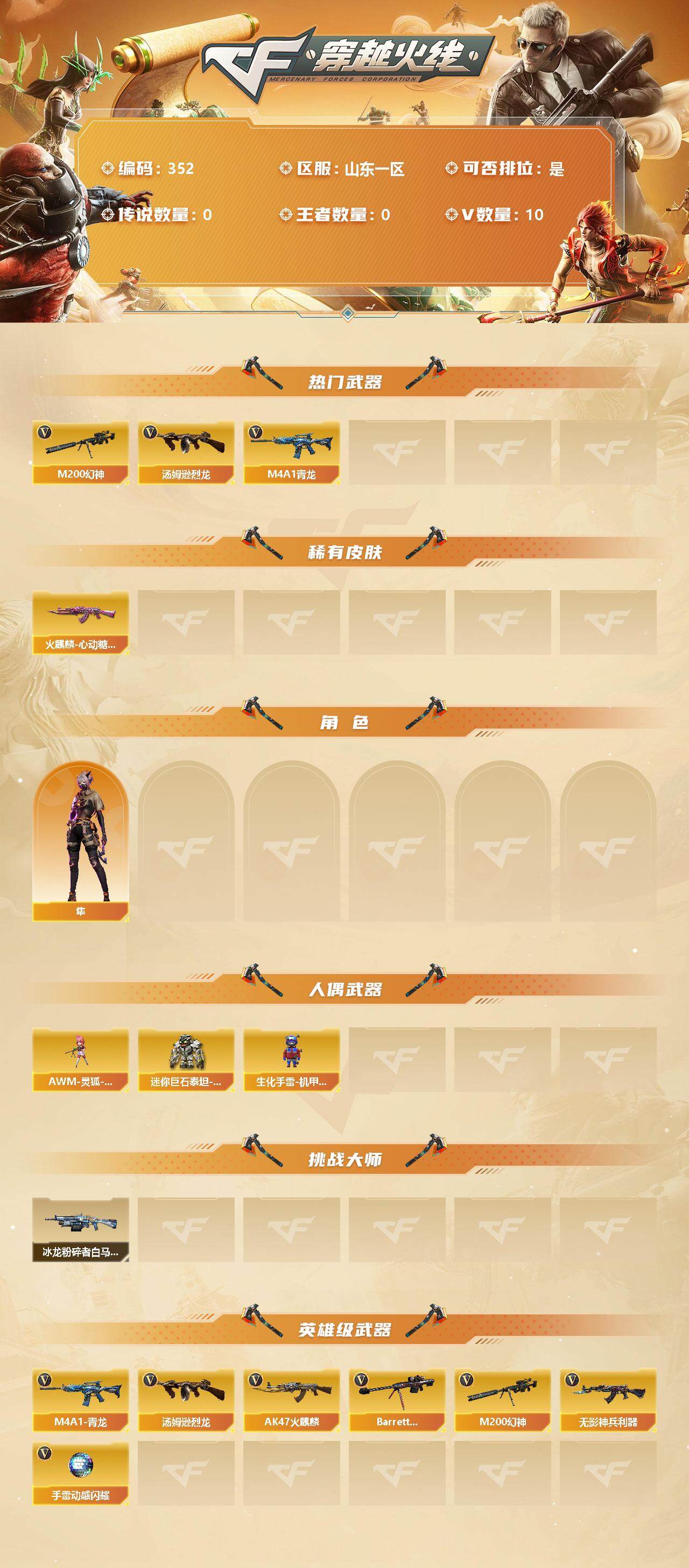 【11038739】【11038739】[13036388]【352】9V/82级/将帅/1英雄/M4A1青龙/M200-幻神/汤姆逊-烈龙/火麒麟-心动糖果