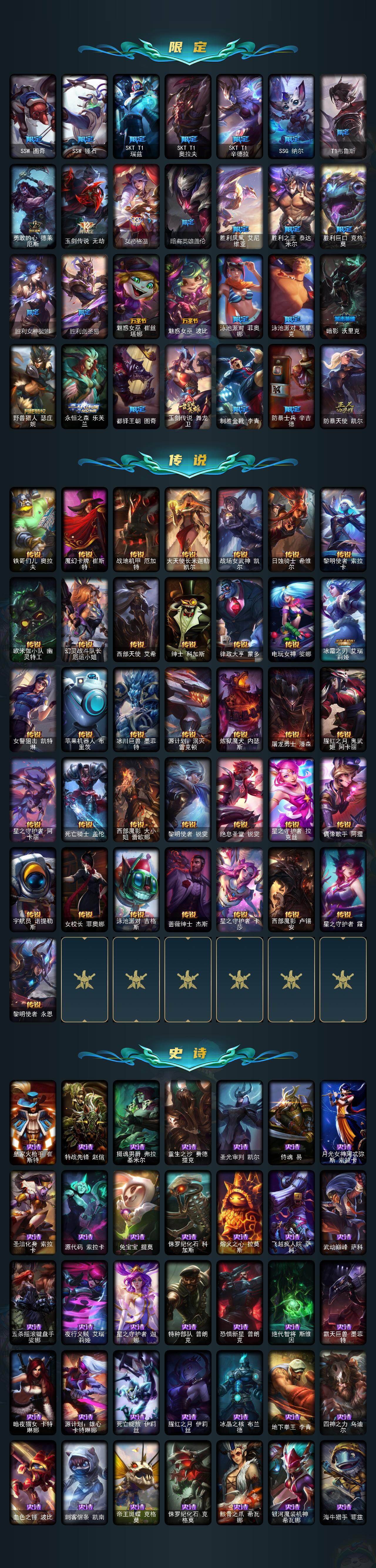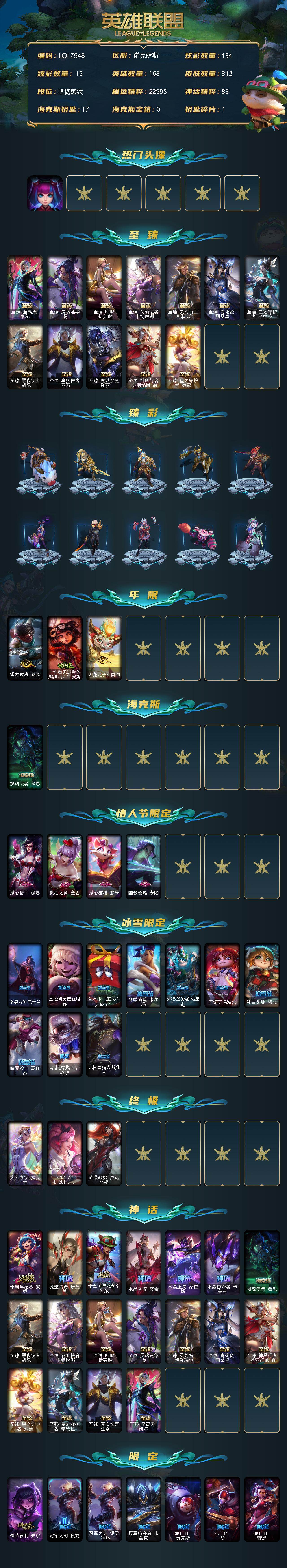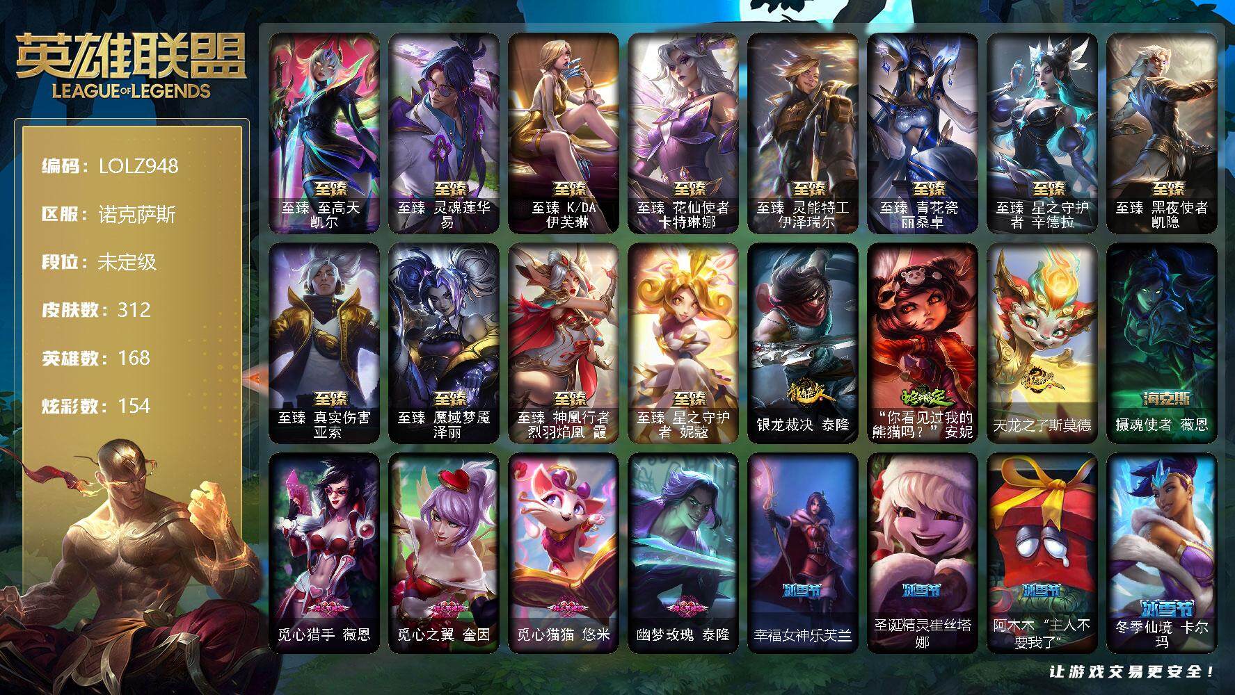 【11048685】【LOLZ948】168英雄/312皮肤/5终极/19神话/52限定/15臻彩/154炫彩/36传说/54史诗/未定级/银河魔装机神安妮/至臻至高天凯尔/至臻灵魂莲华易/至臻K/DA伊芙琳/至臻花仙使者卡特琳娜/至臻灵能特工伊泽瑞尔/至臻青花瓷丽桑卓/至臻星之守护者辛德拉/至臻黑夜使者凯隐/至臻真实伤害亚索/至臻魔域梦魇泽丽/至臻神凰行者烈羽焰凰霞/至臻星之守护者妮蔻/天龙之