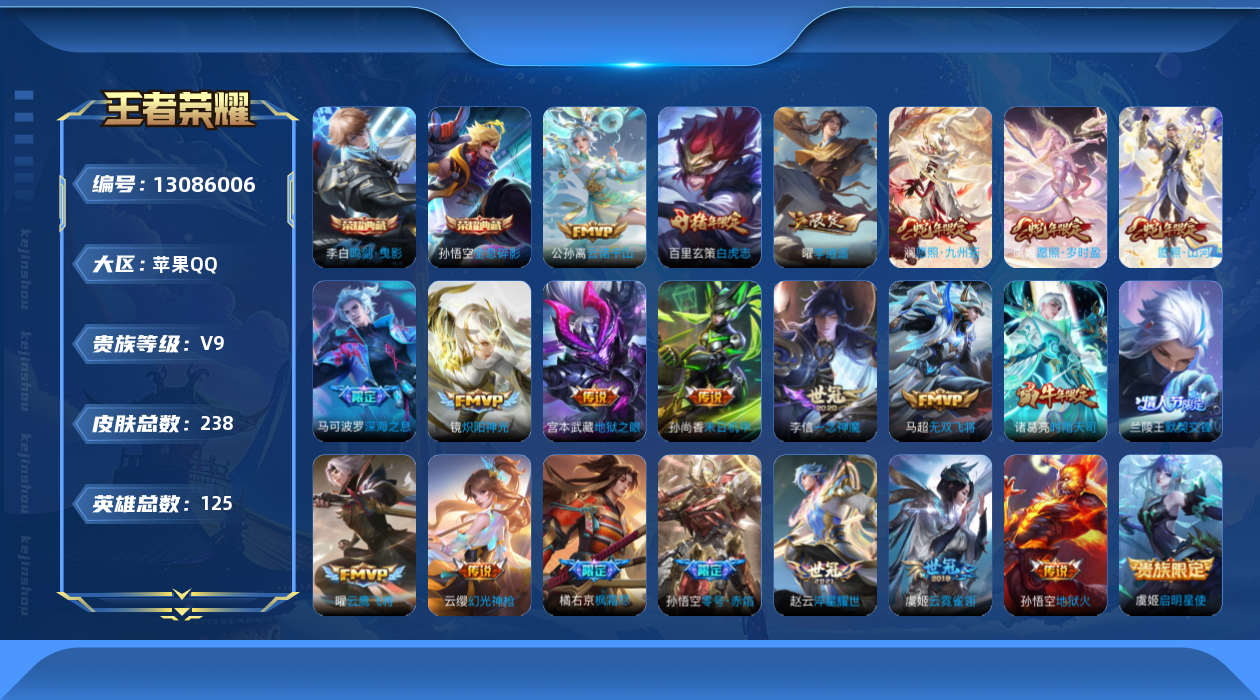 【11048899】【可二次】【QQ(苹果)】鹰眼统帅 水晶猎龙者 晚萤 一念神魔 偶像歌手 地狱之眼 永昼 圣诞恋歌 星夜王子 真爱至上 暗夜猫娘 紫霞仙子 淬星耀世 全息碎影 逐梦之影 真爱魔法 缤纷独角兽 枫霜尽 地狱火 暗夜贵公子 银河之约 高山流水 末日机甲 修罗 特工魅影 金属风暴 德古拉伯爵 赵云 鬼剑武藏 云霓雀翎 赏金猎手 白龙吟 孙行者 圣弓游侠 魅力维加斯 李小龙 云鹰飞将