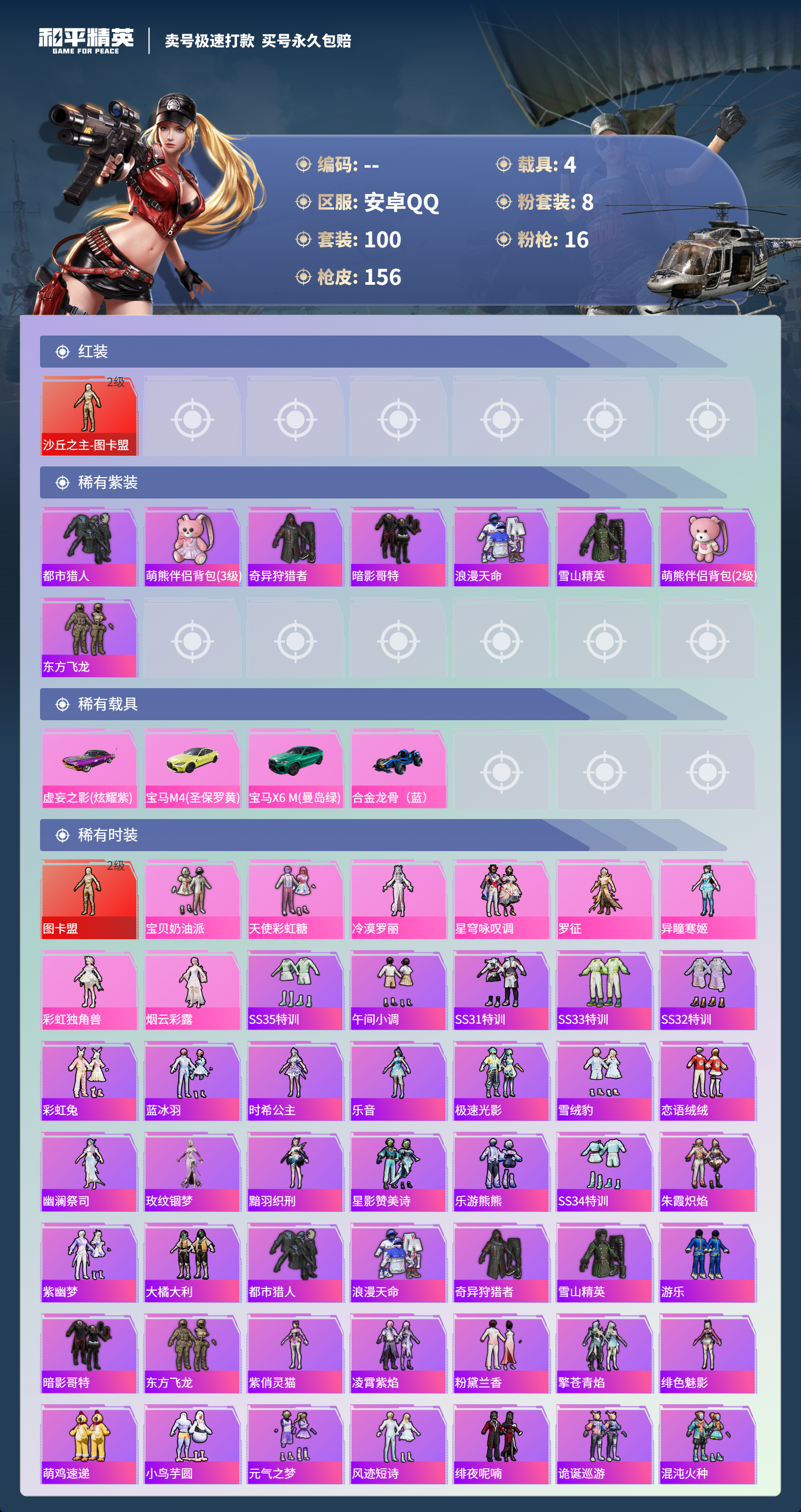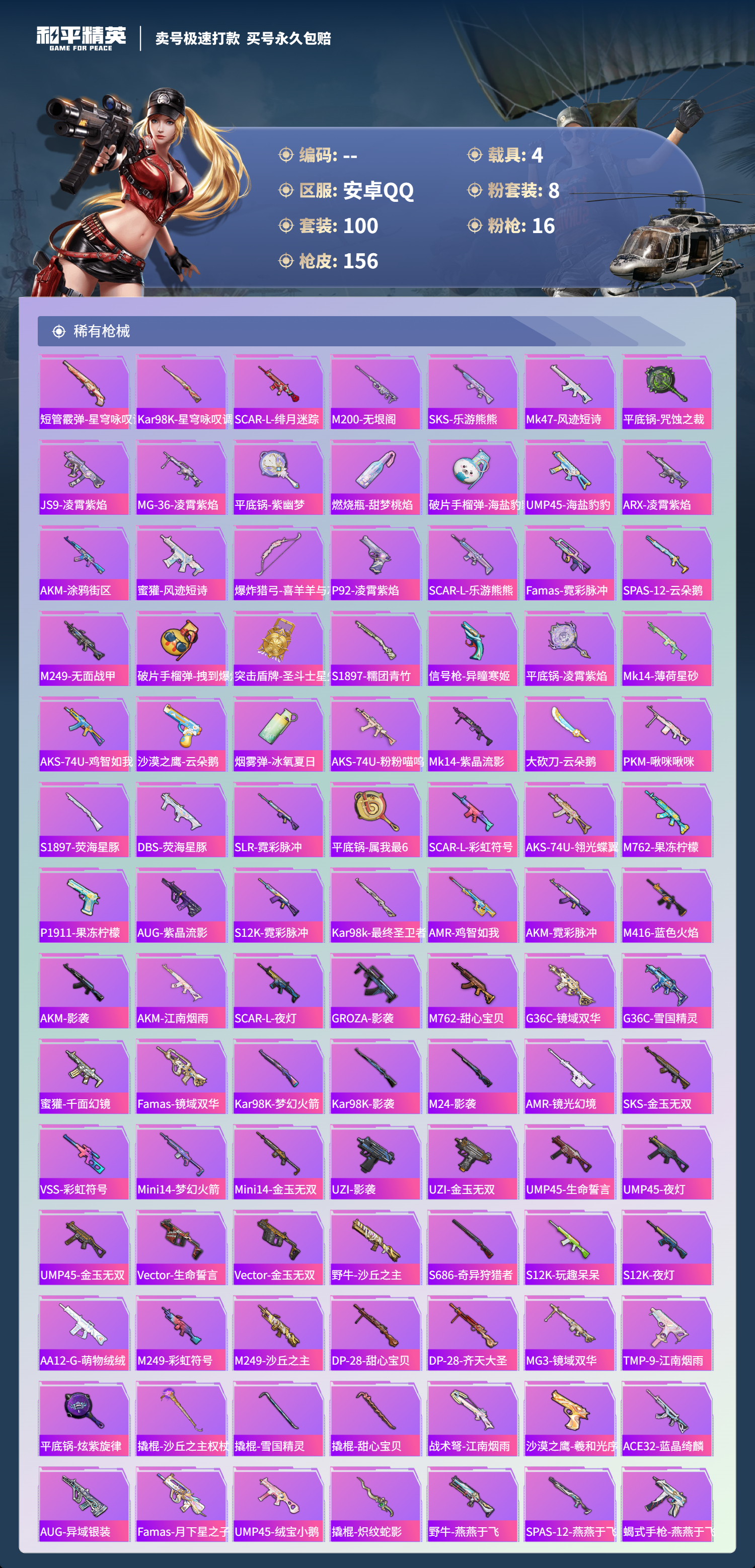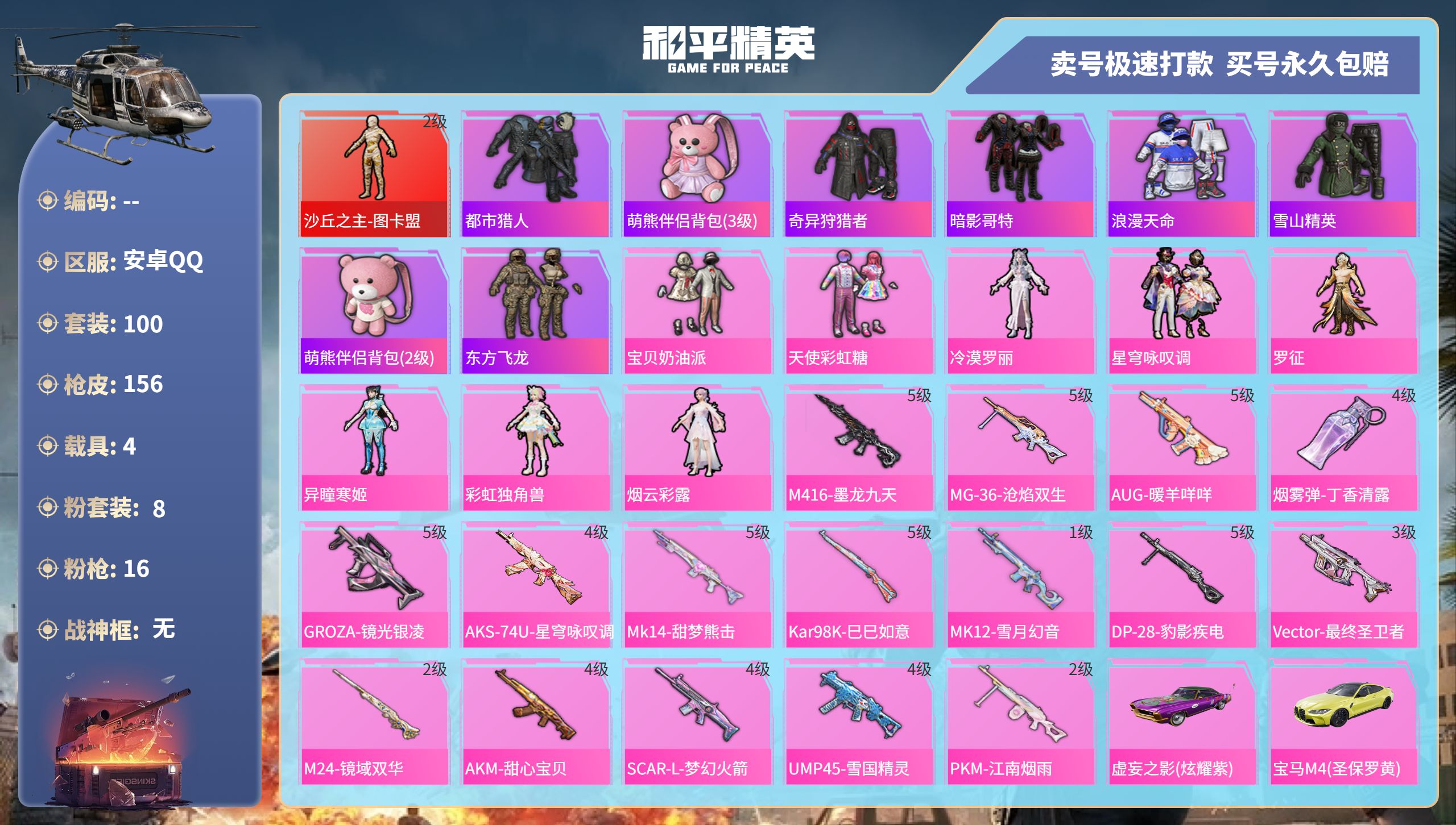【11069534】【不可二次】【安卓QQ】合金龙骨蓝色 SCAR-L-梦幻火箭 M24-镜域双华 水银刺客 S686-奇异狩猎者 漫步者 都市猎人 奇异狩猎者 PKM-江南烟雨 SCAR-L梦幻火箭 东方飞龙 UMP45-雪国精灵 狂沙舞者 龙翔九天飞行器 M416-墨龙九天 沙丘之主-图卡盟 UMP4雪国精灵 天使彩虹糖 宝贝奶油派 绝色倾城飞行器 浪漫天命 暗影哥特 雪山精英 AKM-甜心