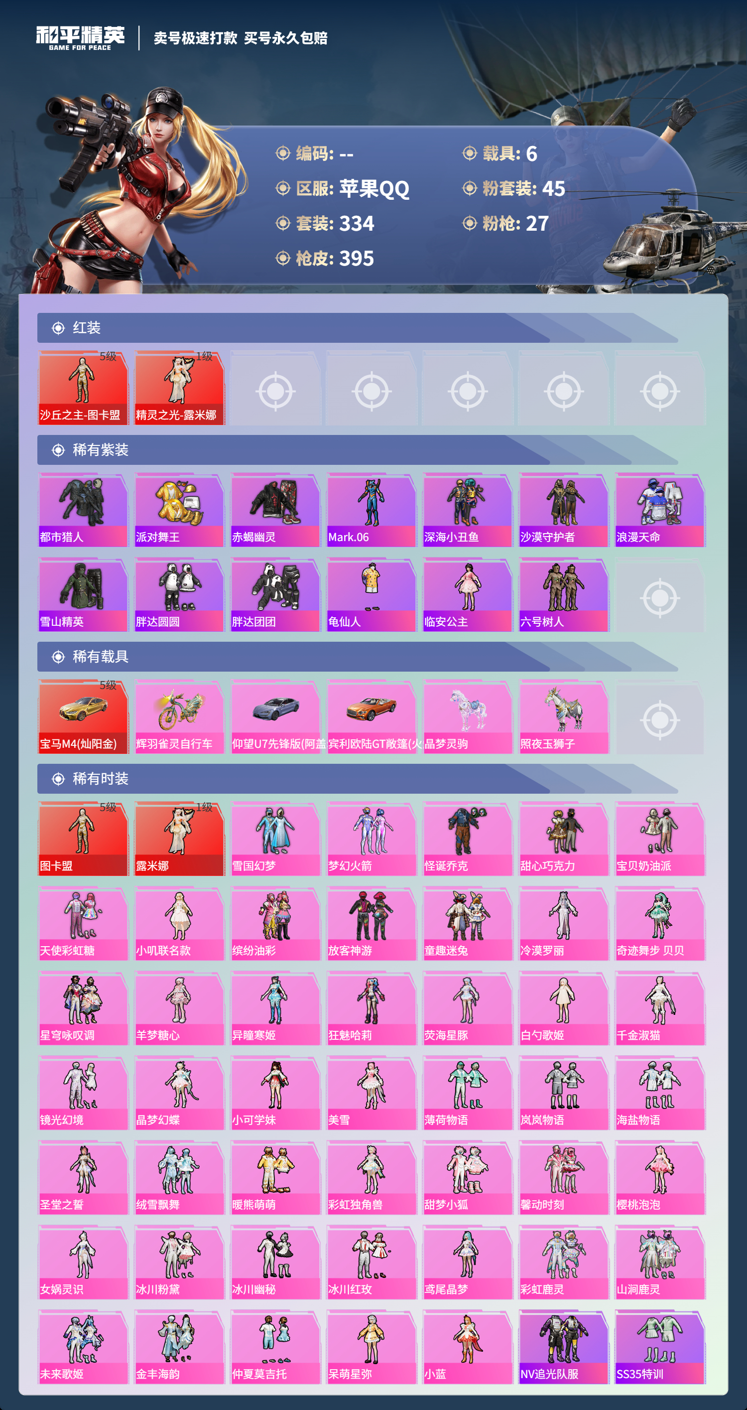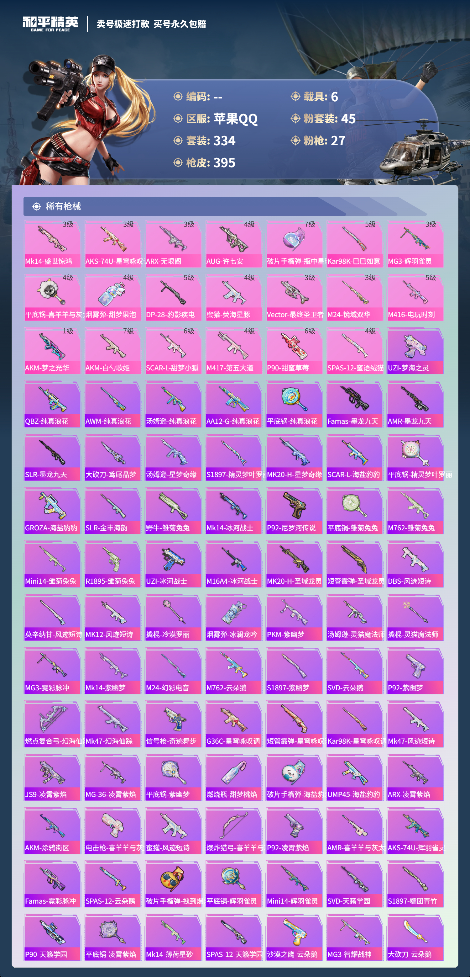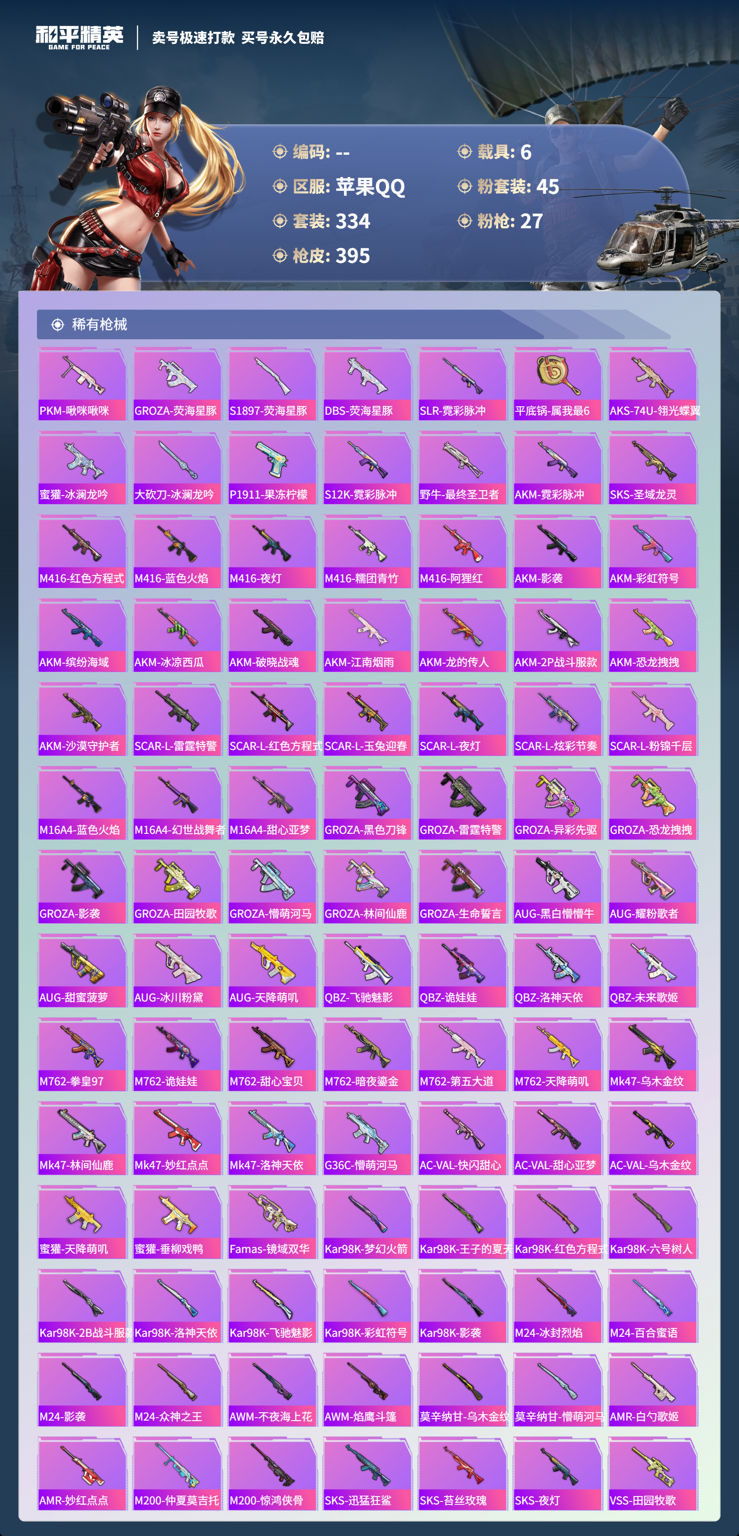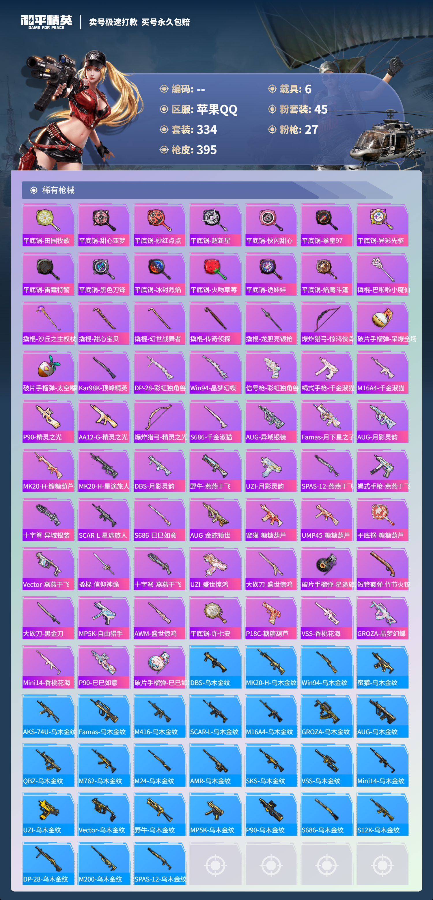 【11069687】【可二次】【苹果QQ】龟仙人 大橘为重 都市猎人 AKM-白勺歌姬 SCAR-L-甜梦小狐 沙丘之主-图卡盟 海盐物语 UMP45-量子极限 缤纷油彩 深海小丑鱼 山涧鹿灵 馨动时刻 童趣迷兔 M24-镜域双华 怪诞乔克 潮萌小黄鸭 M417射手步枪 AKM-梦之光华 GROZA-精灵之光 M200-梦海之灵 六号树人 M417-第五大道 雪国梦幻 小叽联名款 赤蝎幽灵 精灵