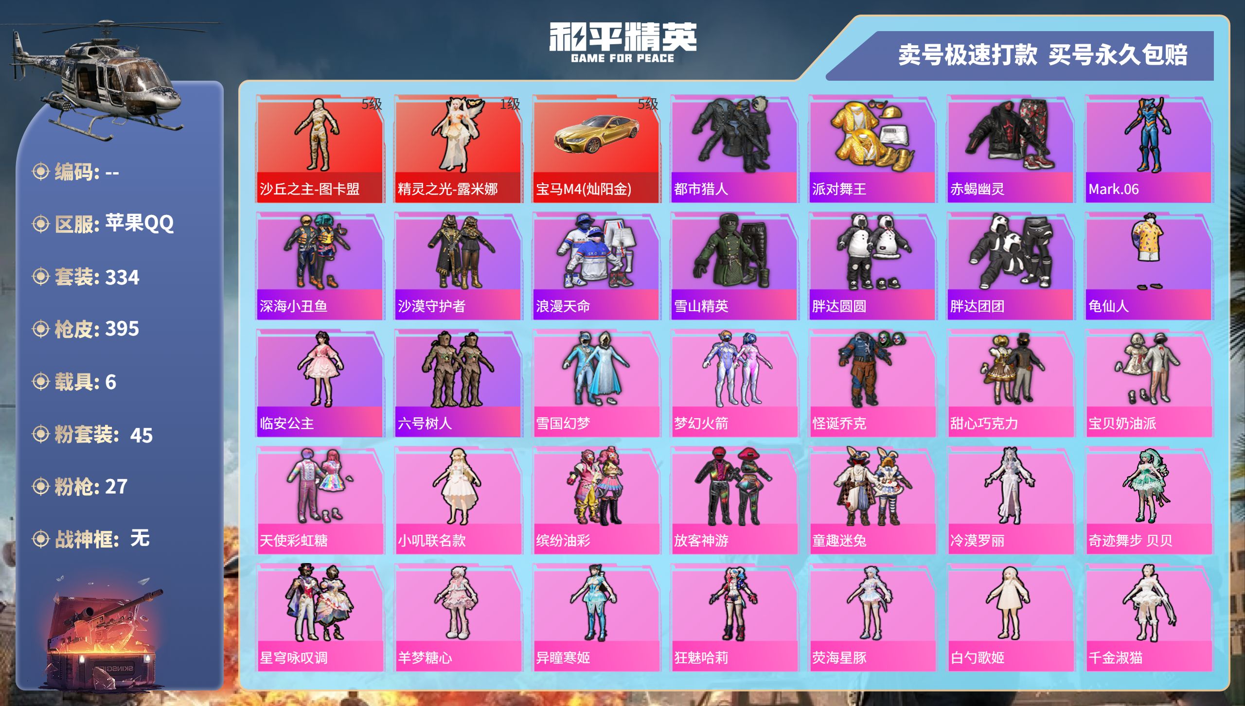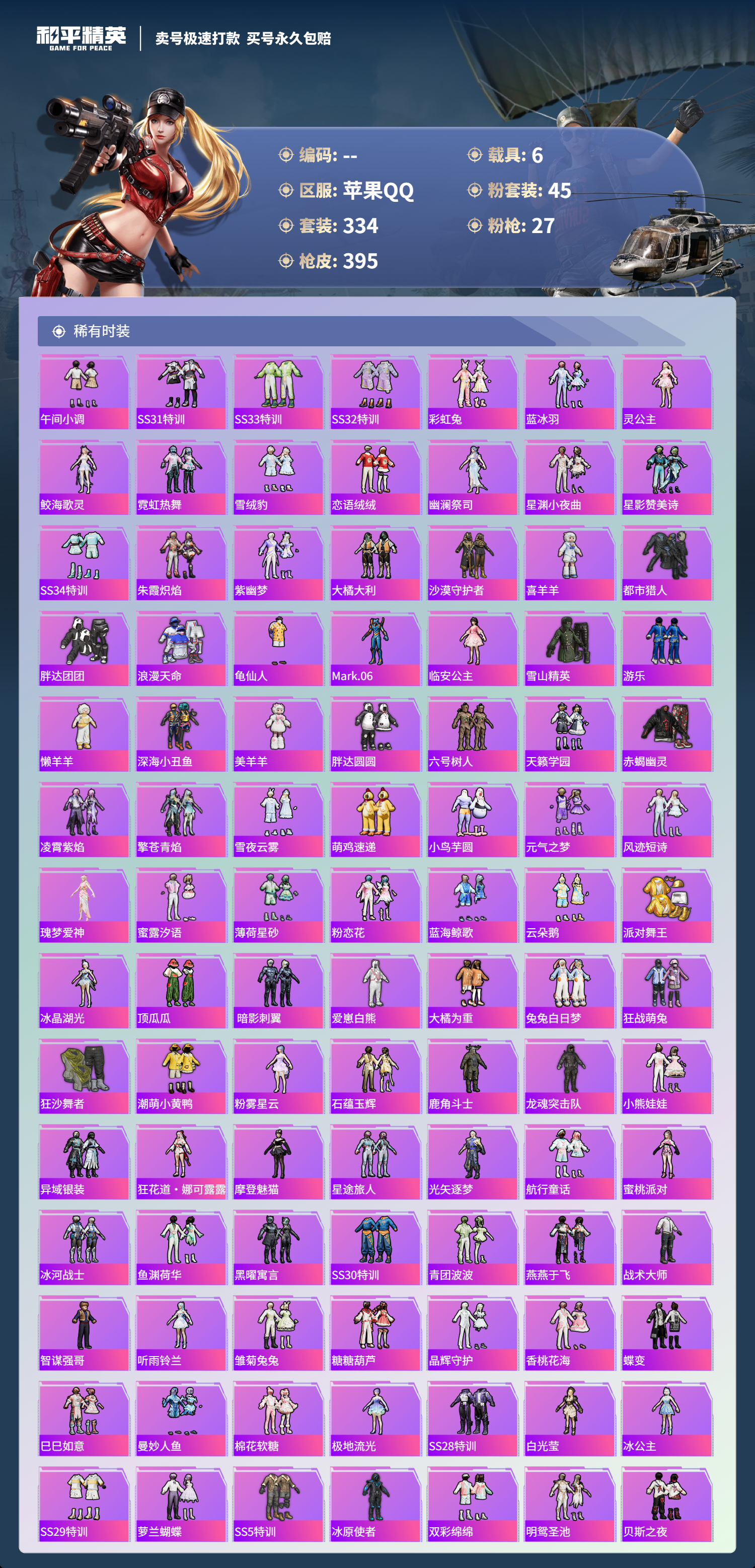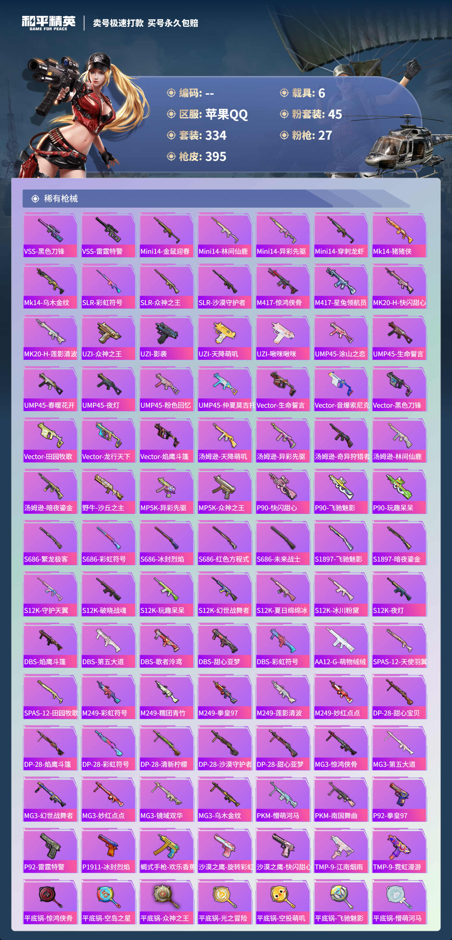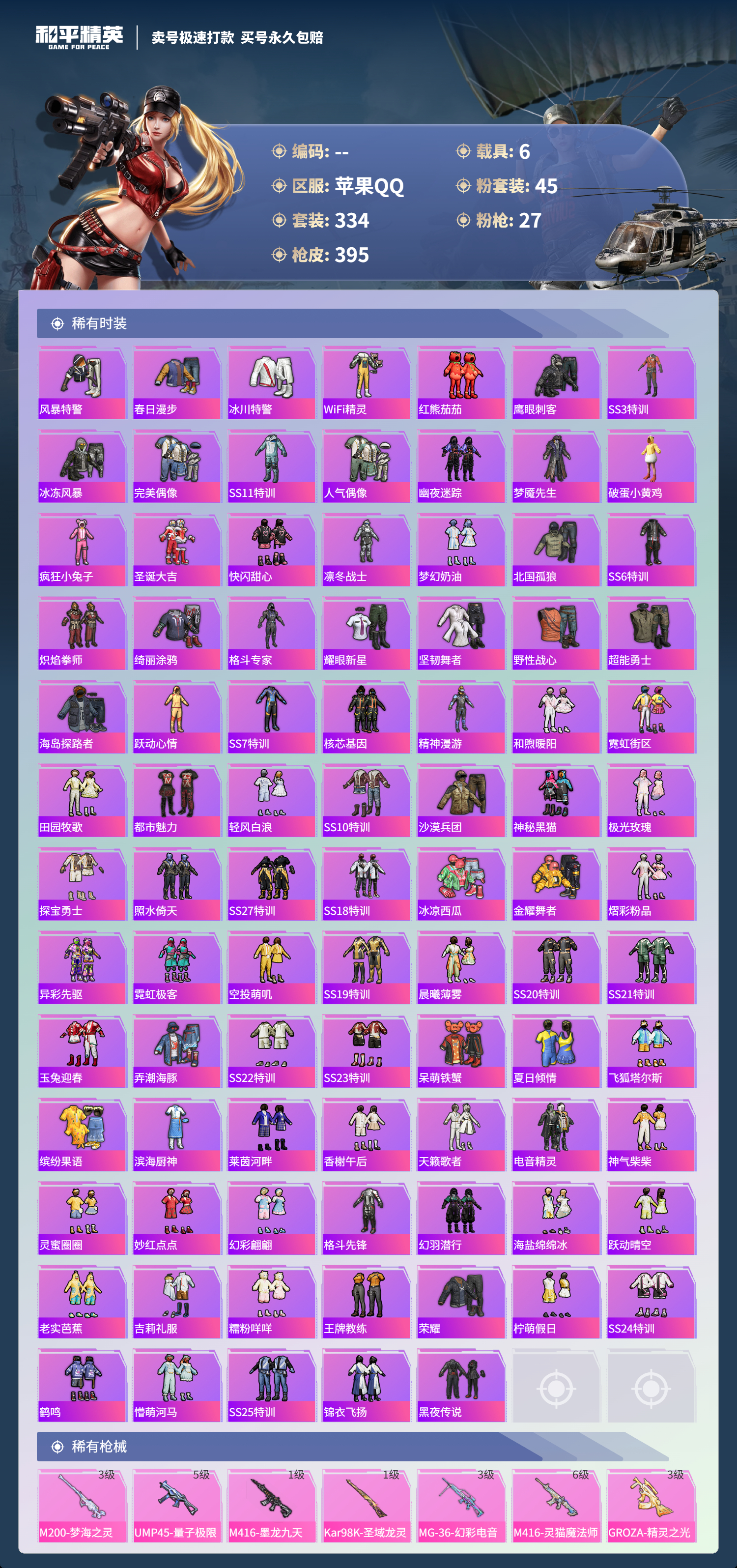【11069687】【可二次】【苹果QQ】龟仙人 大橘为重 都市猎人 AKM-白勺歌姬 SCAR-L-甜梦小狐 沙丘之主-图卡盟 海盐物语 UMP45-量子极限 缤纷油彩 深海小丑鱼 山涧鹿灵 馨动时刻 童趣迷兔 M24-镜域双华 怪诞乔克 潮萌小黄鸭 M417射手步枪 AKM-梦之光华 GROZA-精灵之光 M200-梦海之灵 六号树人 M417-第五大道 雪国梦幻 小叽联名款 赤蝎幽灵 精灵