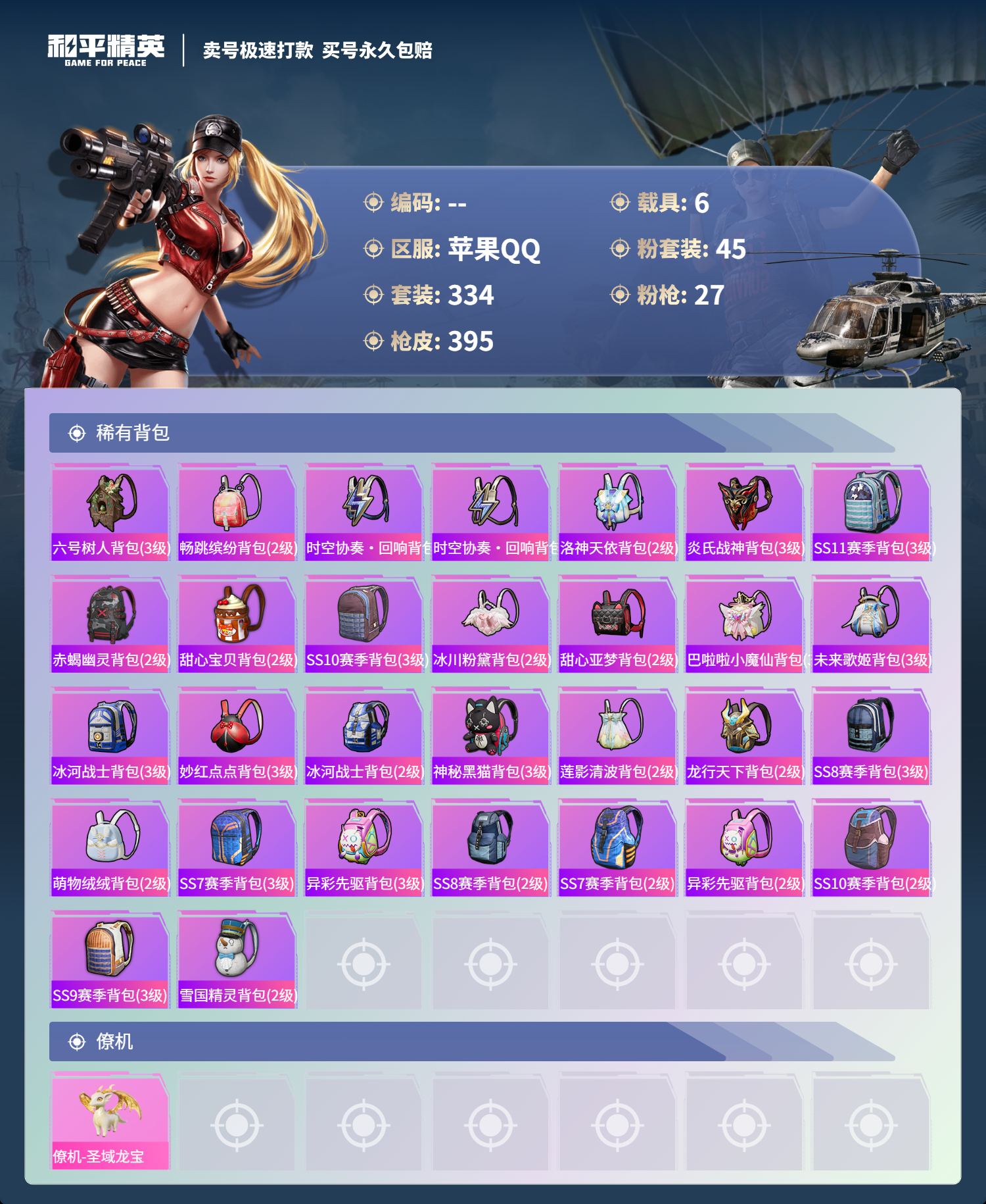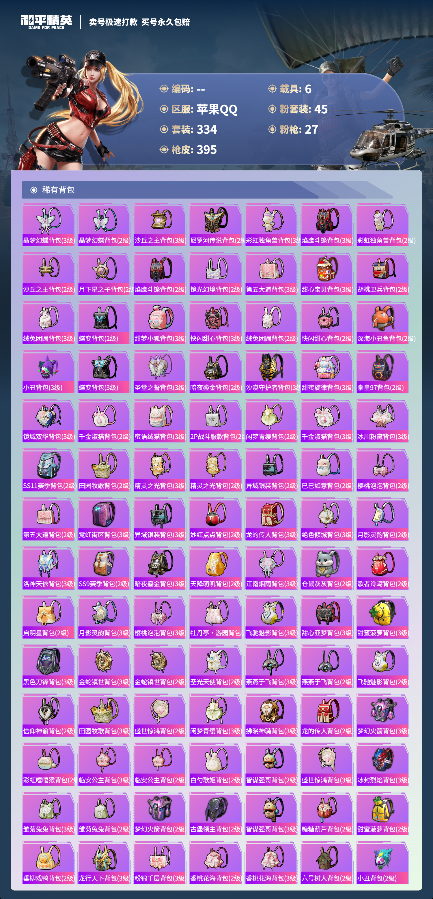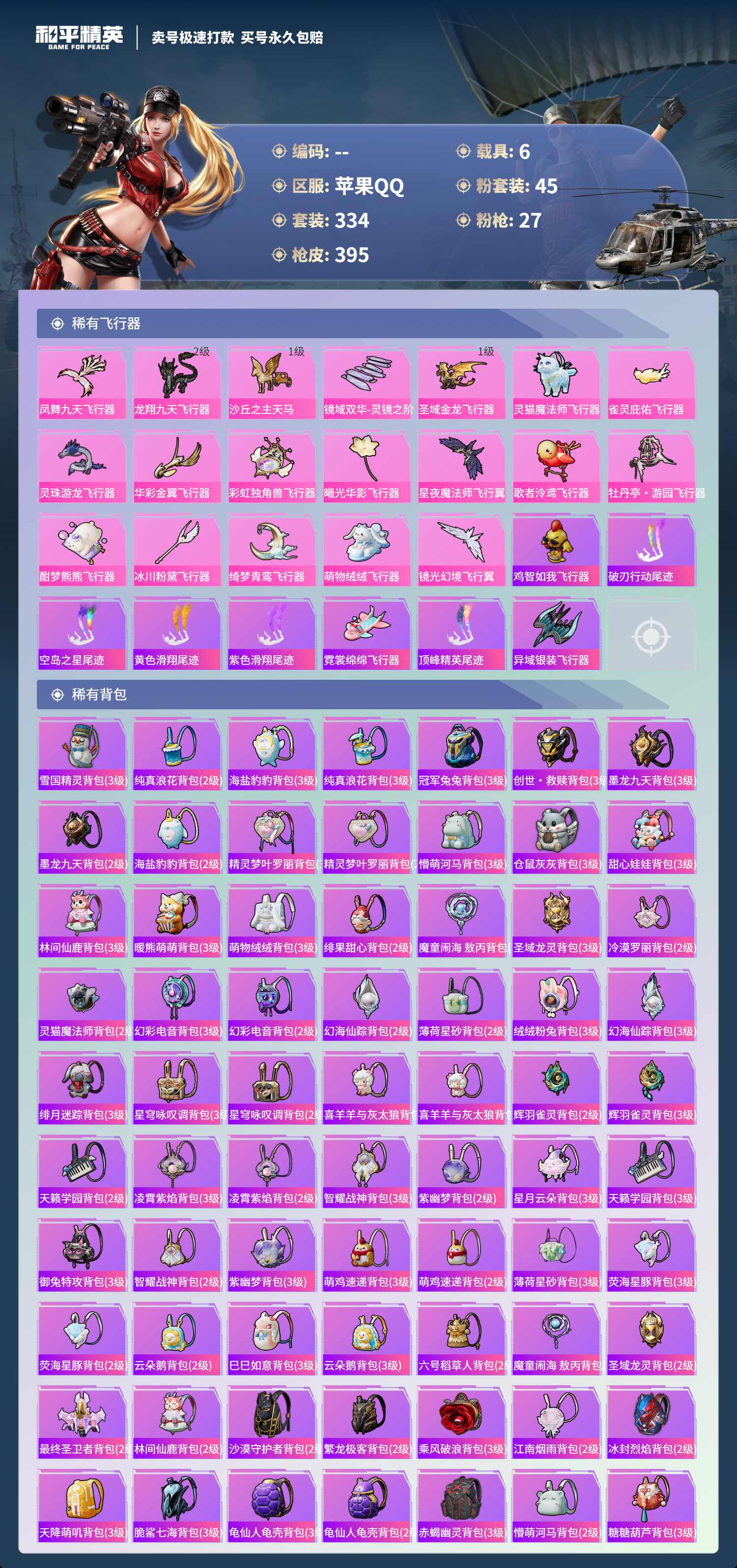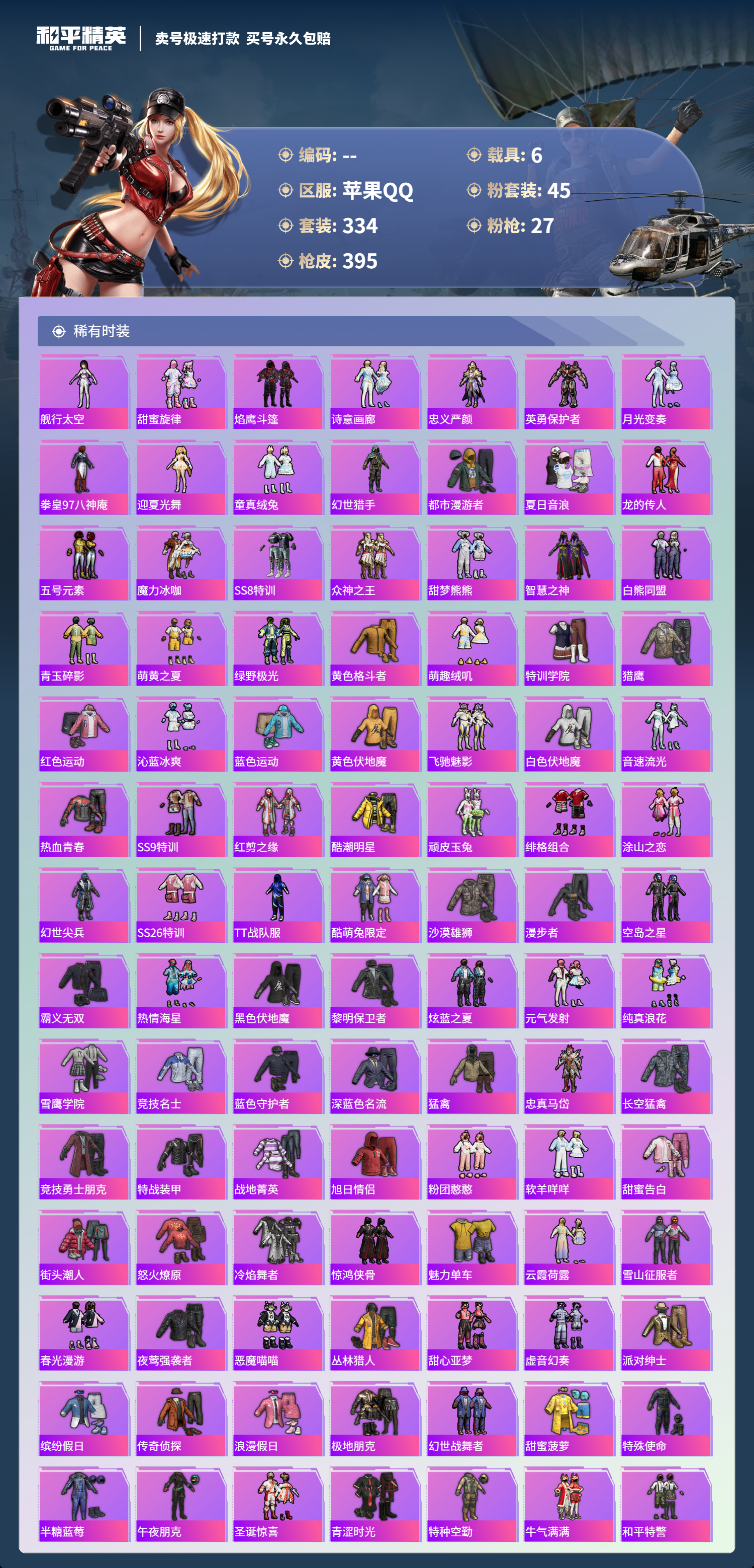 【11069687】【可二次】【苹果QQ】龟仙人 大橘为重 都市猎人 AKM-白勺歌姬 SCAR-L-甜梦小狐 沙丘之主-图卡盟 海盐物语 UMP45-量子极限 缤纷油彩 深海小丑鱼 山涧鹿灵 馨动时刻 童趣迷兔 M24-镜域双华 怪诞乔克 潮萌小黄鸭 M417射手步枪 AKM-梦之光华 GROZA-精灵之光 M200-梦海之灵 六号树人 M417-第五大道 雪国梦幻 小叽联名款 赤蝎幽灵 精灵