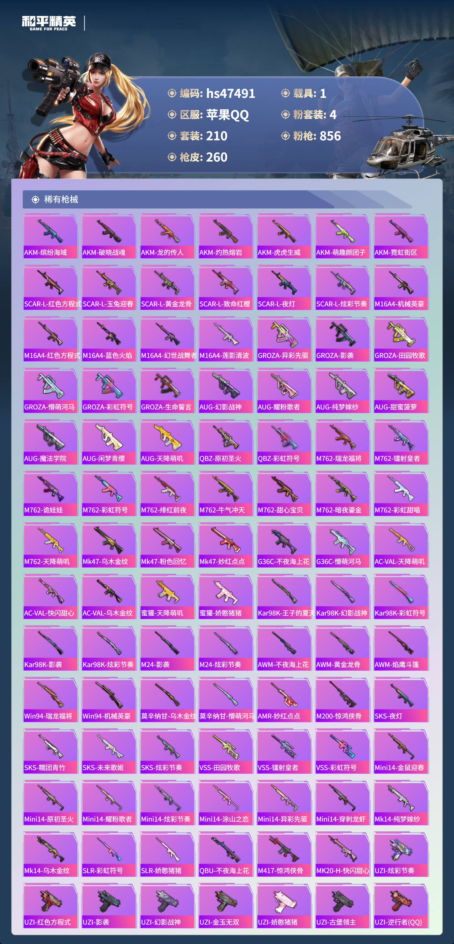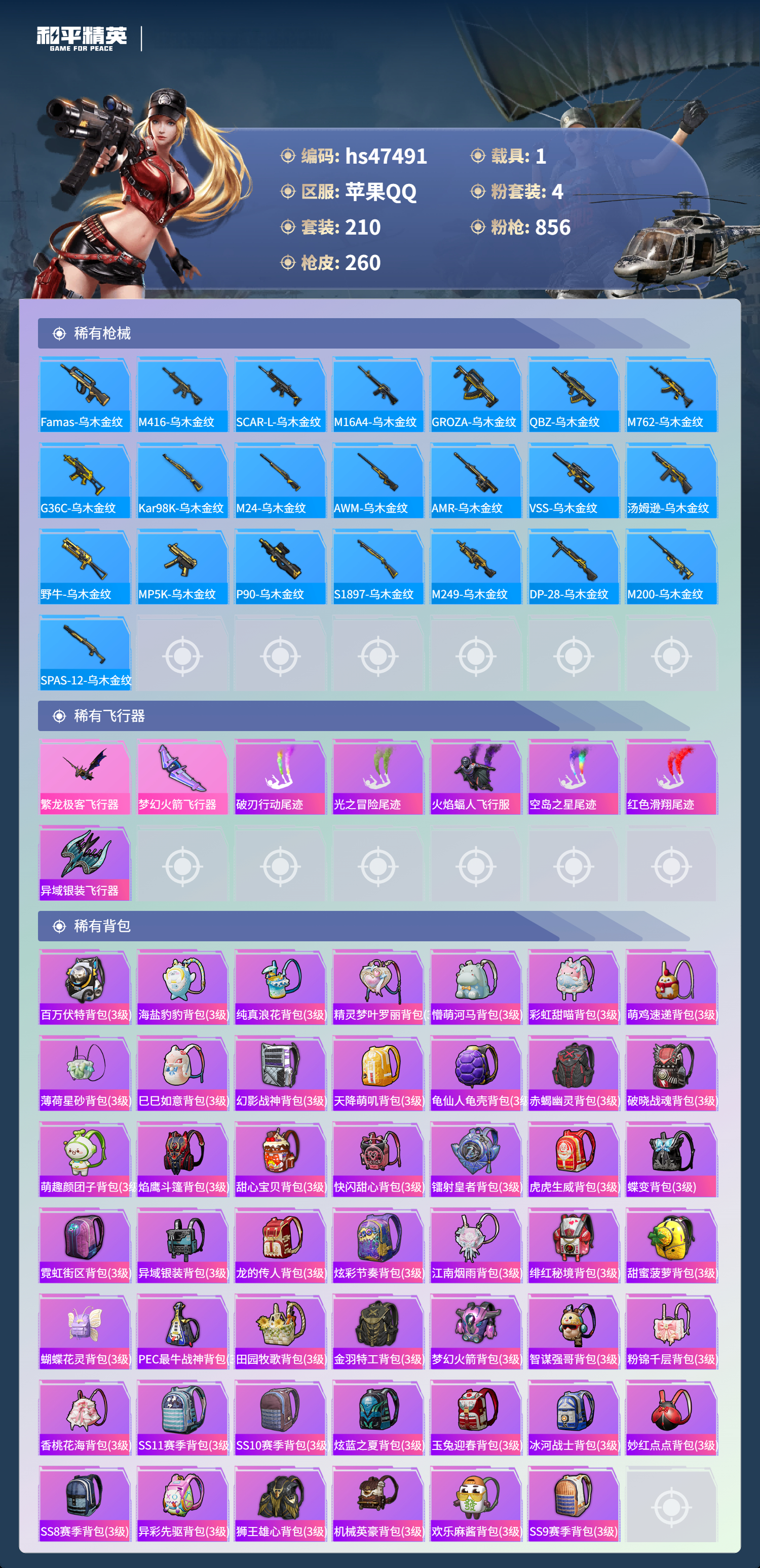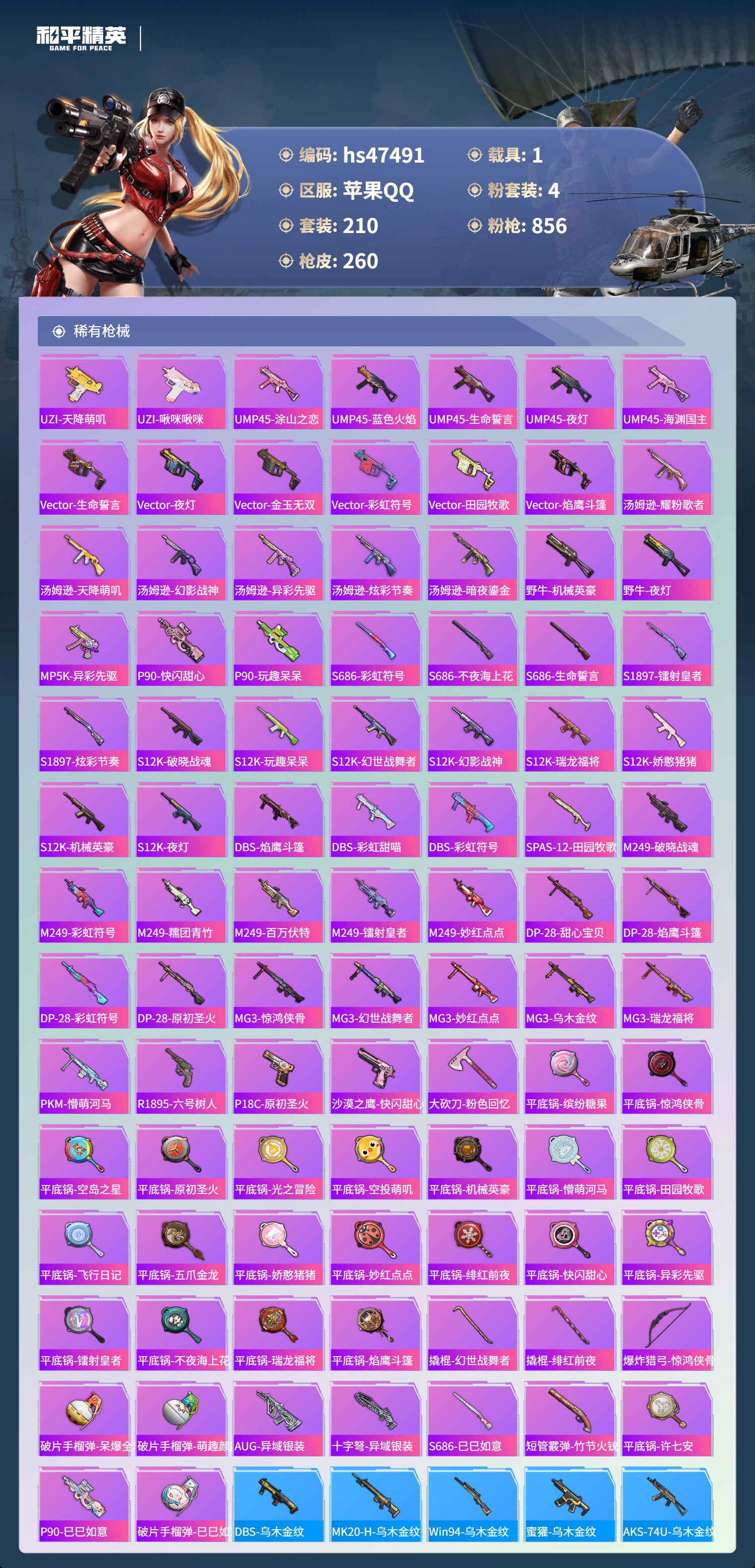 【11069718】【可二次】【苹果QQ】合金龙骨蓝色 龟仙人 水银刺客 漫步者 都市猎人 机械英豪 极速红龙 忍者信条 赤蝎幽灵 M416-至情至圣 深海小丑鱼 瑞龙福将 M416-黄金龙骨 梦幻火箭飞行器 狮王雄心 AWM-黄金龙骨 纯白誓言 团圆交子 繁龙极客飞行器 迅捷狂鲨 奇异狩猎者 M762-瑞龙福将 金羽特工 白月香洋装 AKM-梦之光华 AKM-缤纷海域 AUG-魔法学院 粉红小