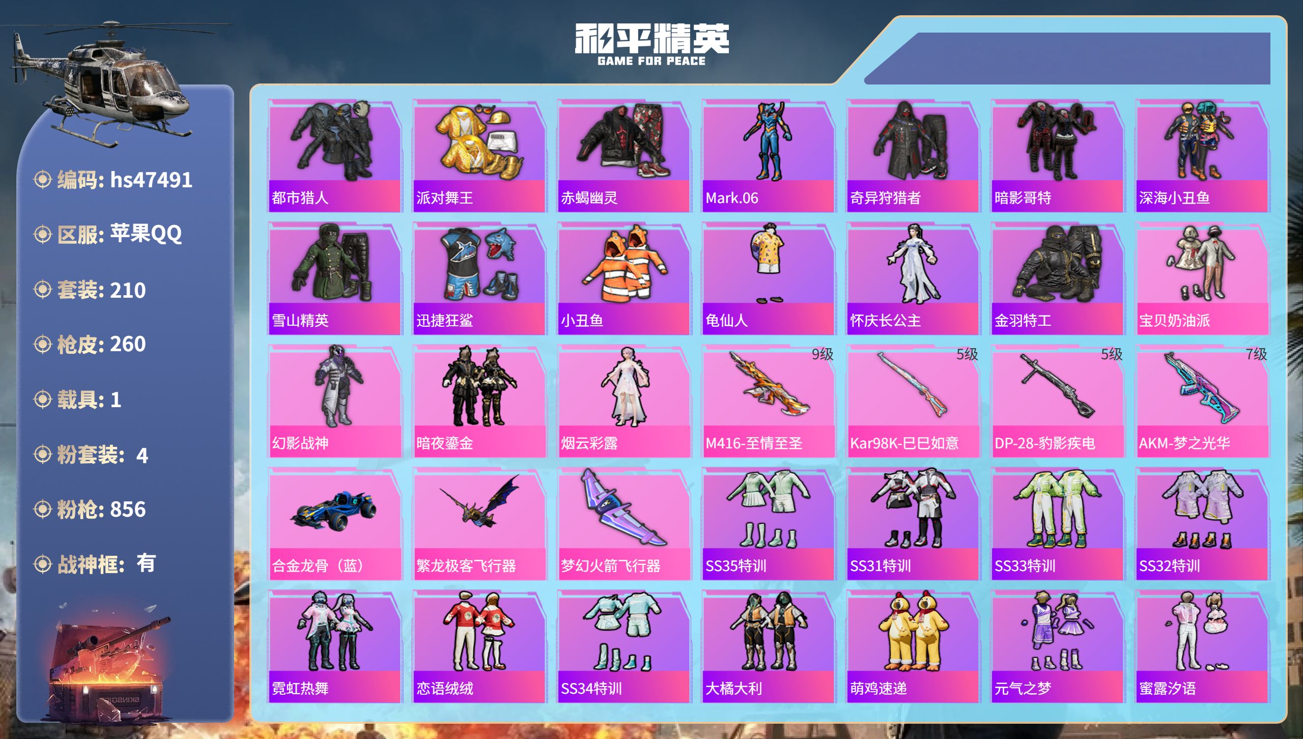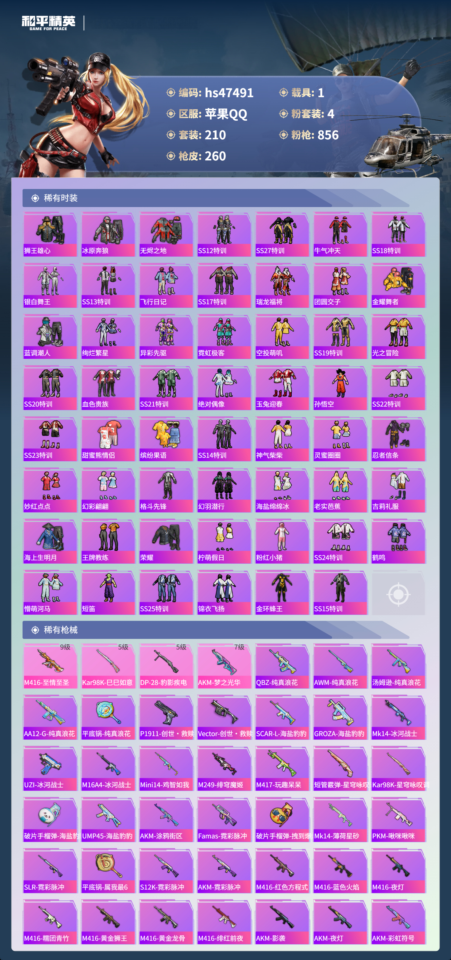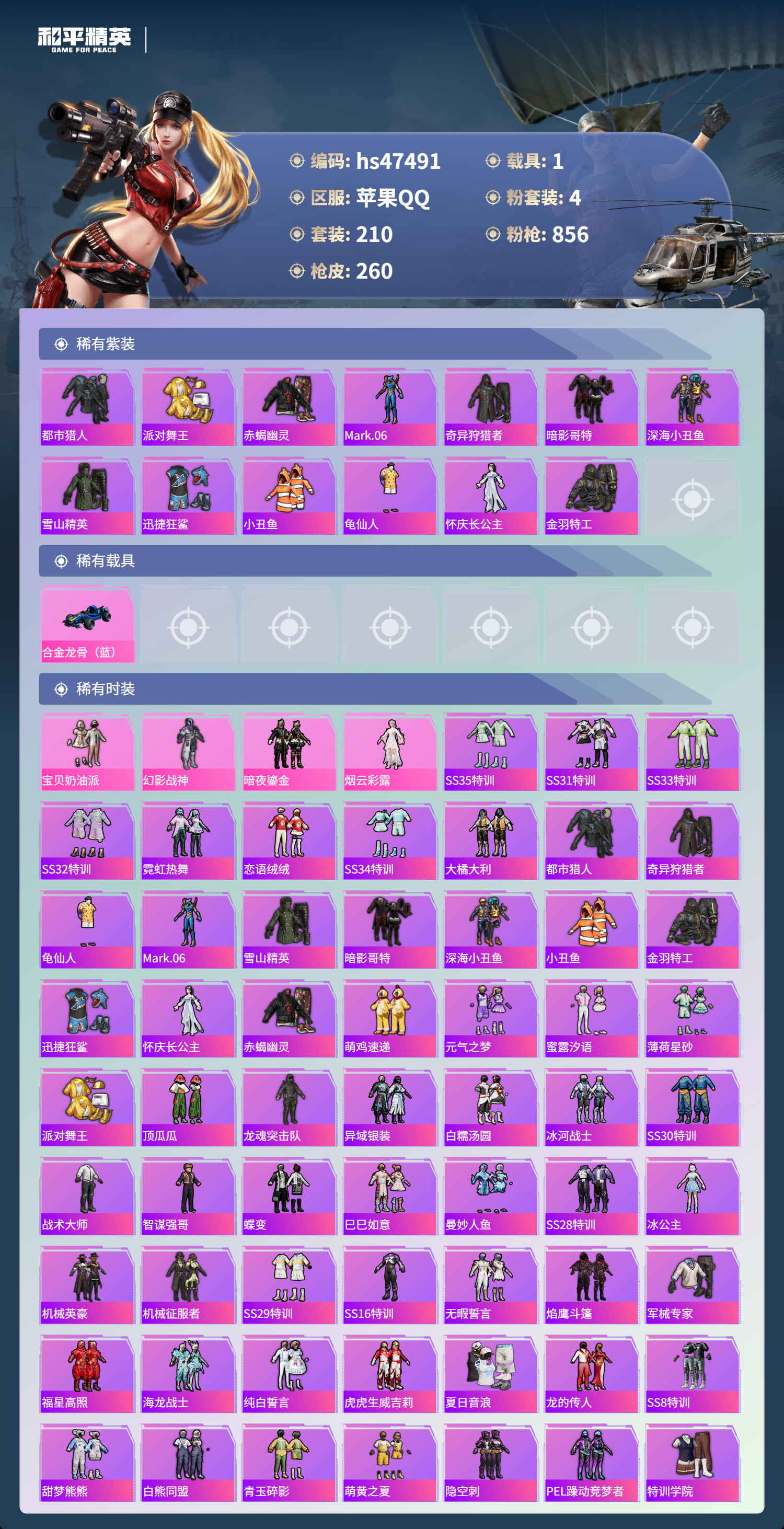 【11069718】【可二次】【苹果QQ】合金龙骨蓝色 龟仙人 水银刺客 漫步者 都市猎人 机械英豪 极速红龙 忍者信条 赤蝎幽灵 M416-至情至圣 深海小丑鱼 瑞龙福将 M416-黄金龙骨 梦幻火箭飞行器 狮王雄心 AWM-黄金龙骨 纯白誓言 团圆交子 繁龙极客飞行器 迅捷狂鲨 奇异狩猎者 M762-瑞龙福将 金羽特工 白月香洋装 AKM-梦之光华 AKM-缤纷海域 AUG-魔法学院 粉红小